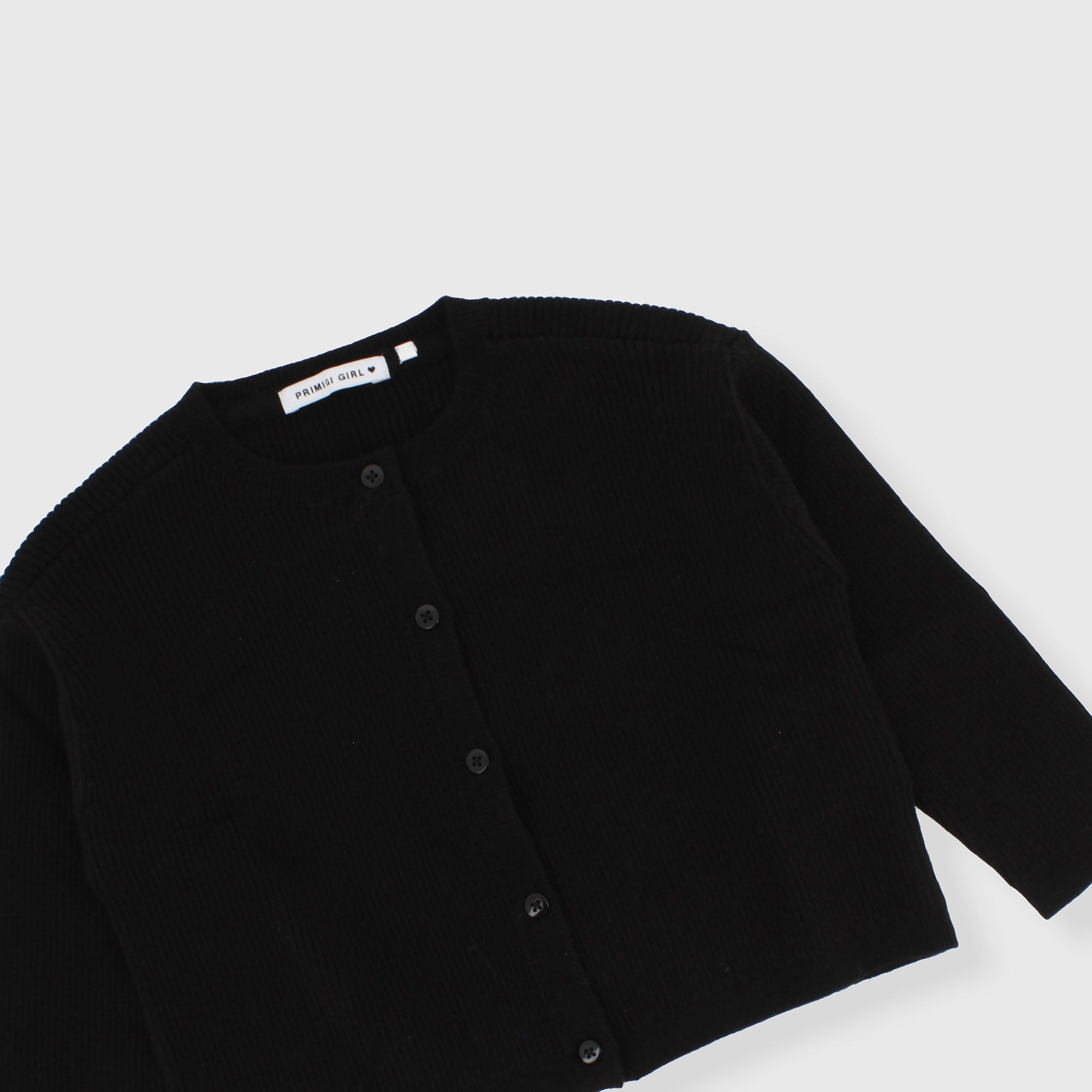 Weicher Rippstrick-Cardigan, Rundhalsausschnitt, lange Ärmel. Knopfverschluss vorne.