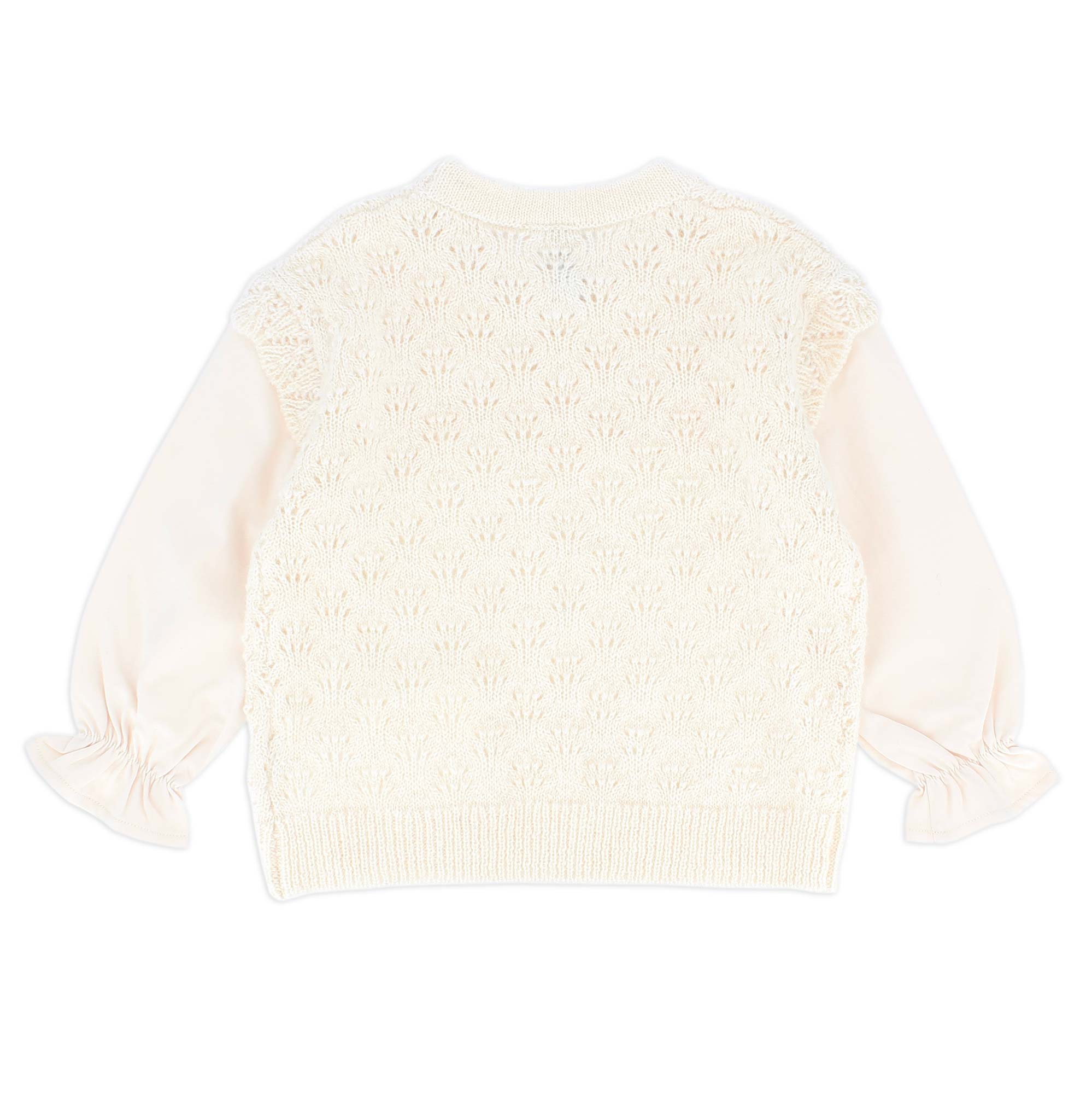 Perforierter Strickpullover mit Rundhalsausschnitt und Jersey-Ärmeln. Kleine Rüschen an Schultern und Ärmeln.