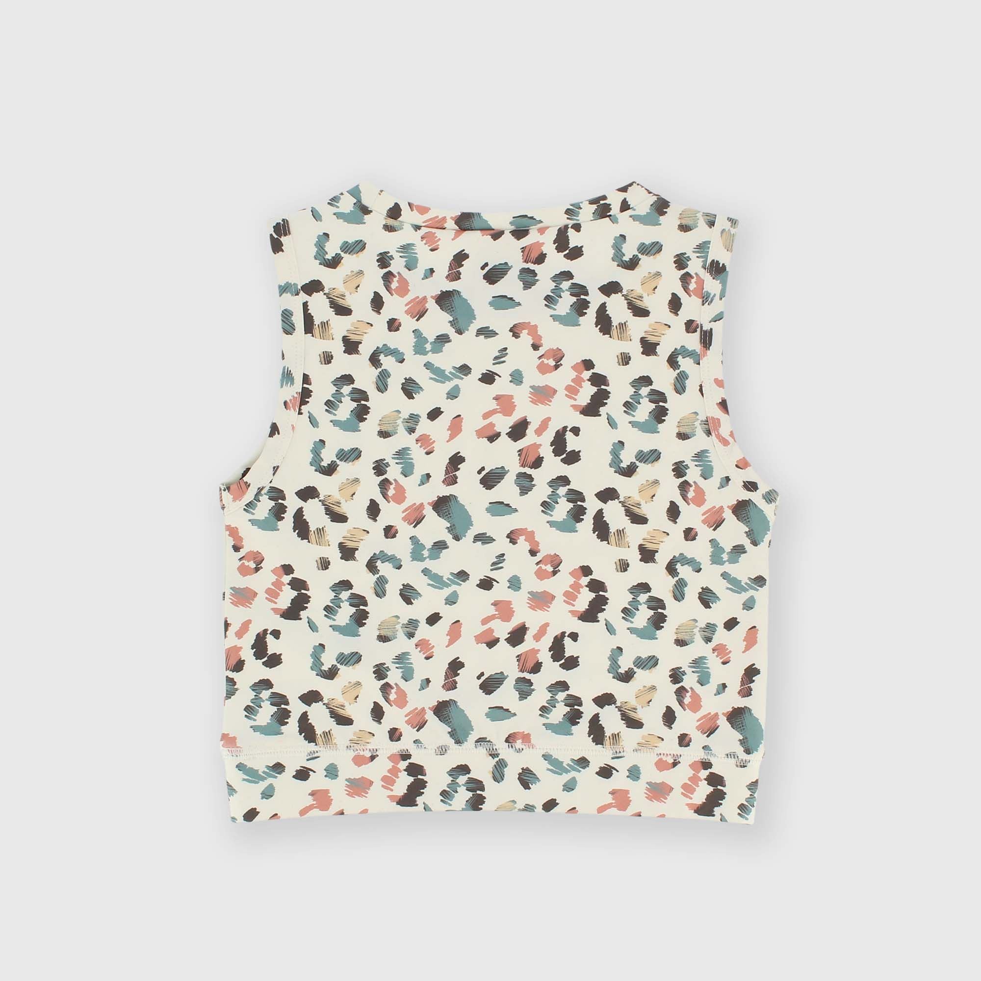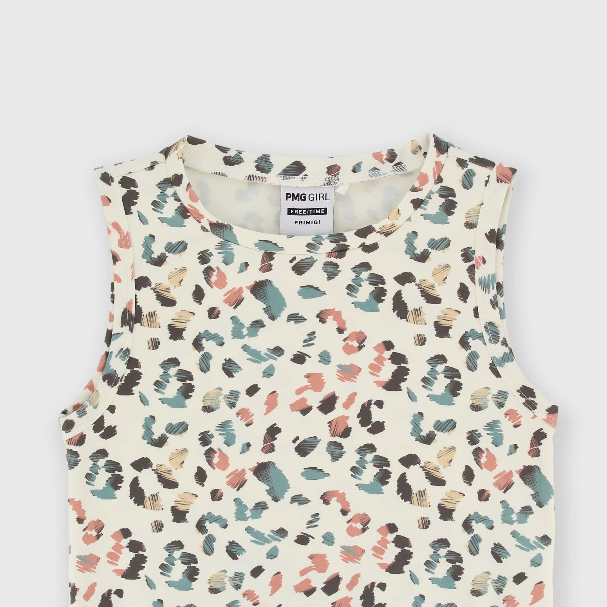 Oberteil aus technischem Stretchgewebe, Rundhalsausschnitt, ärmellos. Allover-Druck. Elastische Unterseite.