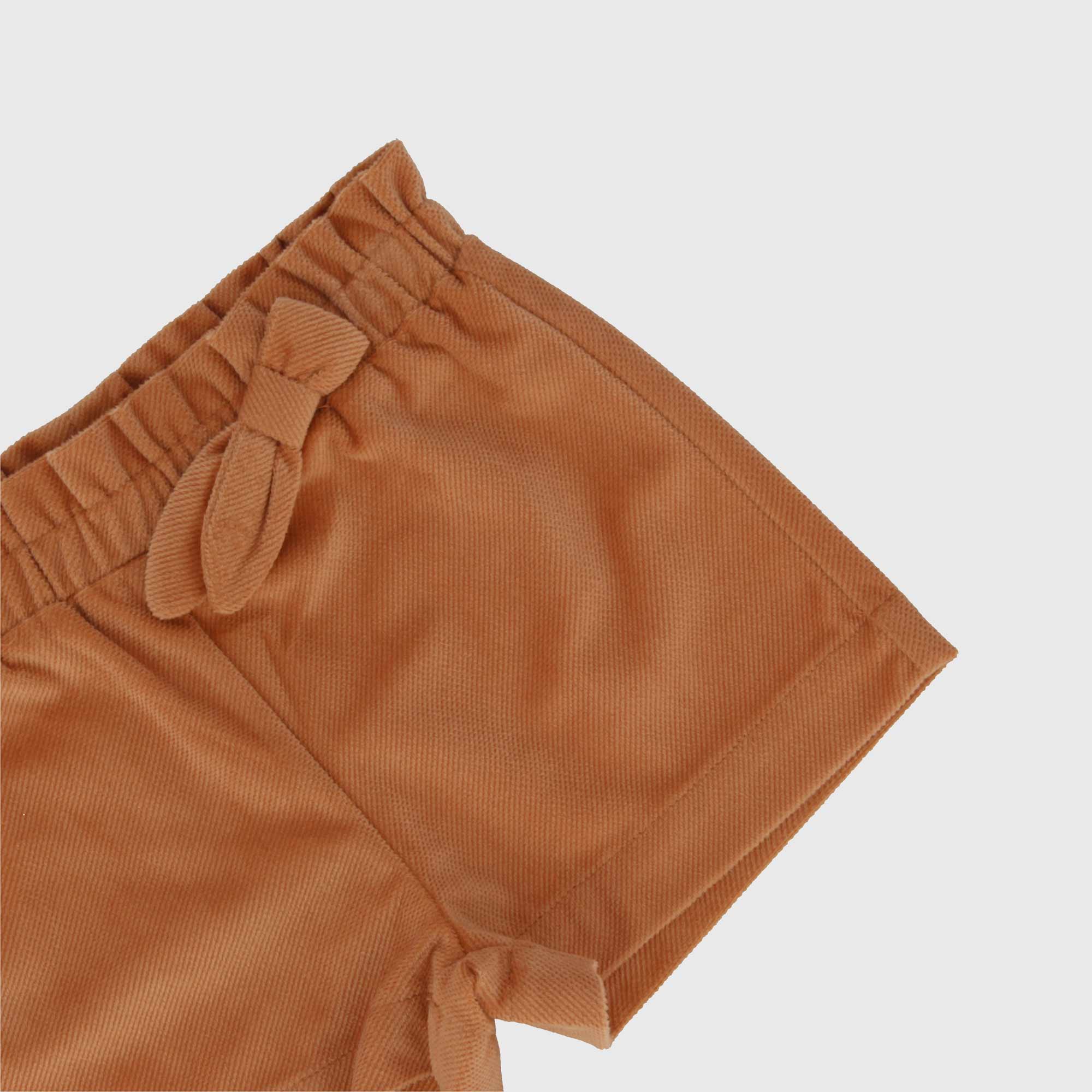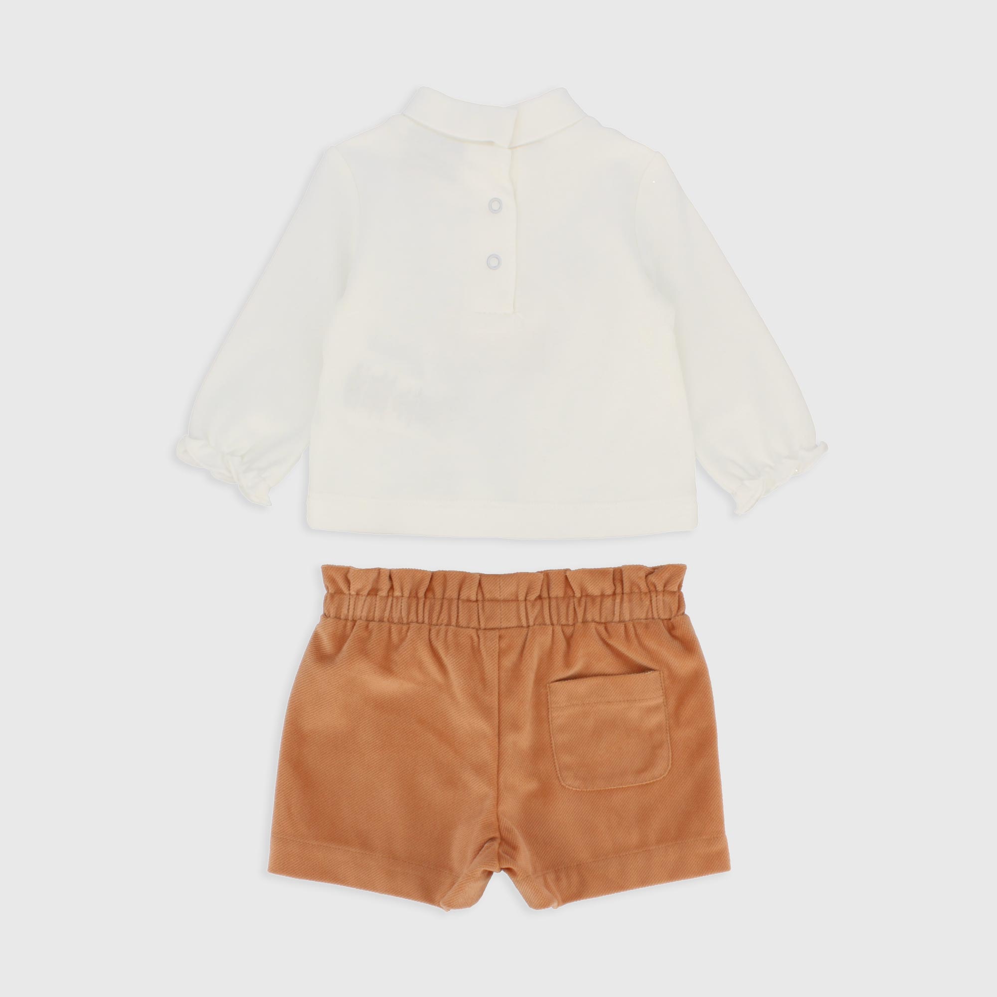 Zweiteiliger Anzug. Rollkragenpullover aus Interlock mit langen Ärmeln. Druckknopfverschluss auf der Rückseite. Druck auf der Vorderseite. Samtshorts mit elastischem Bund.