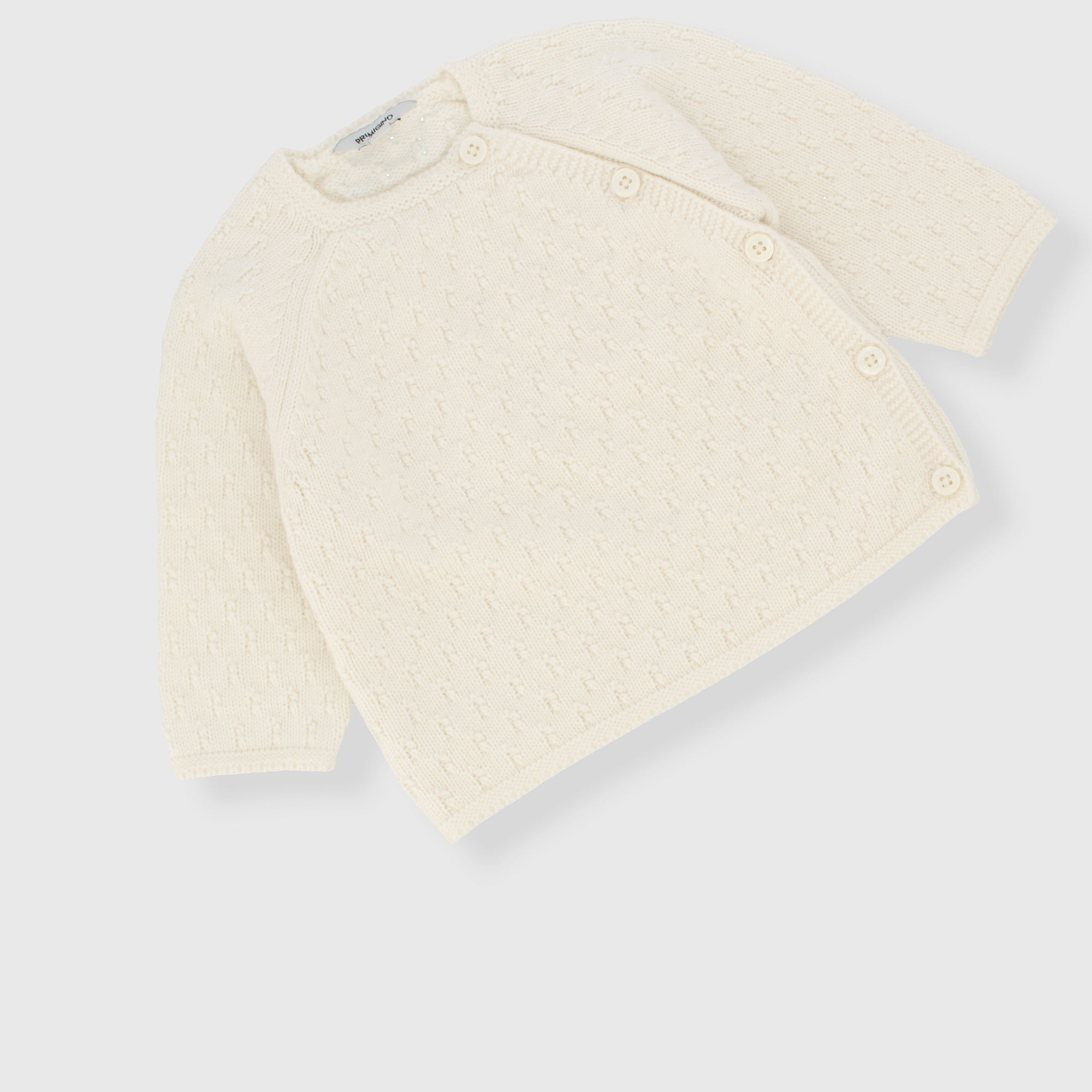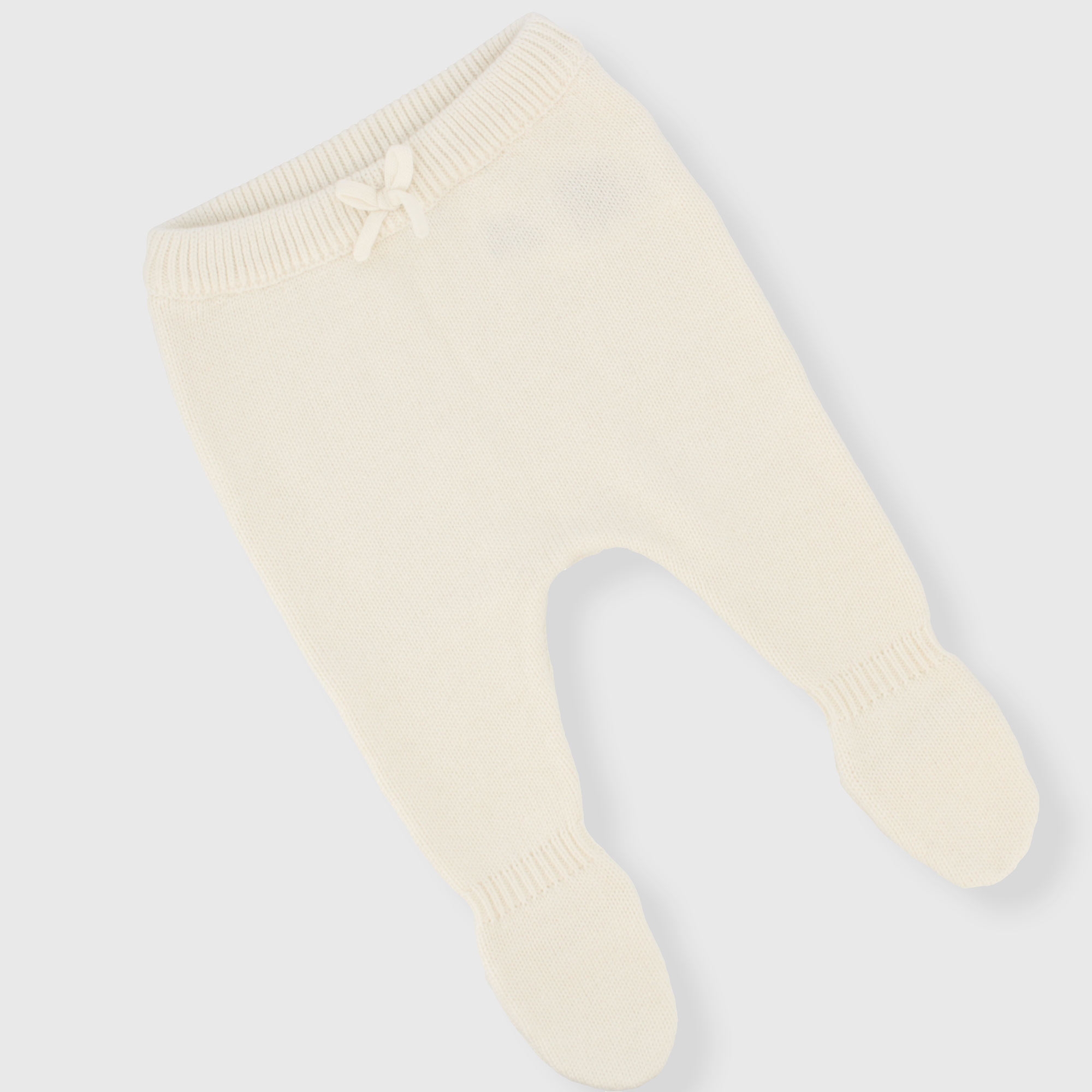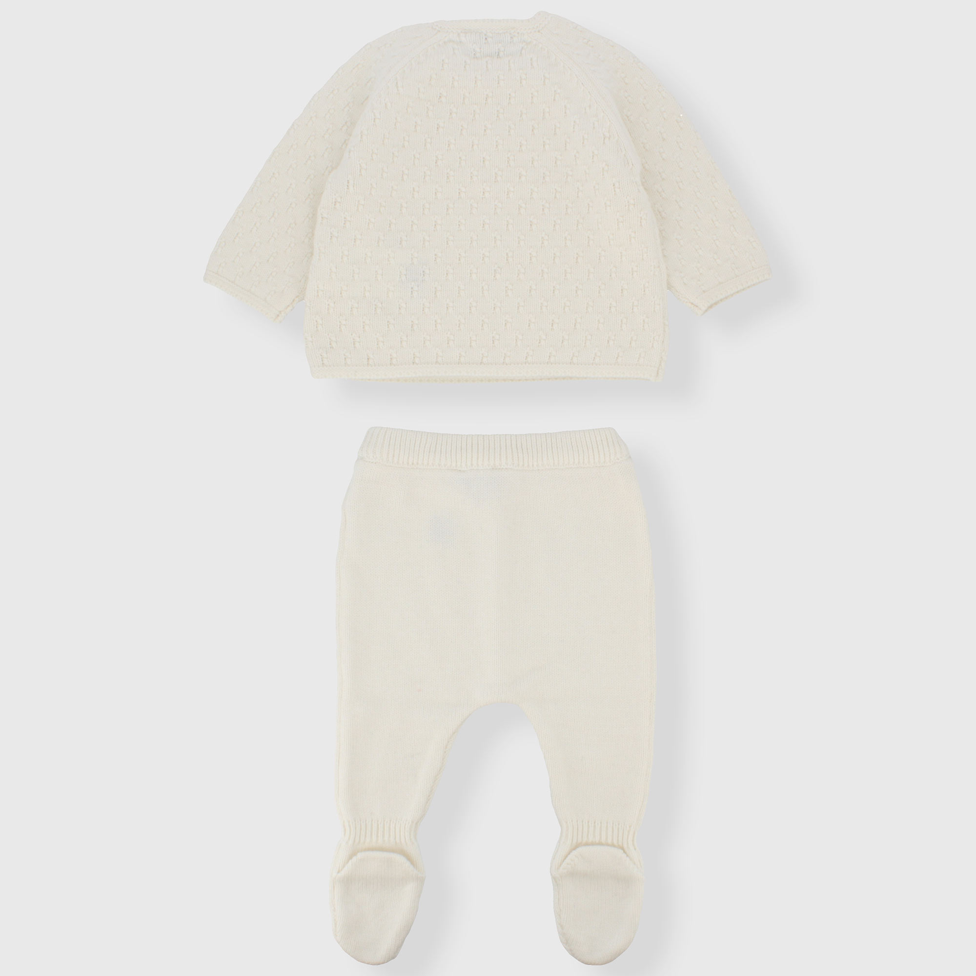 Zweiteiliges Set aus weichem Strick. Langarmpullover. Kimono-Knöpfe. Gamasche mit elastischem Bund mit Füßen.