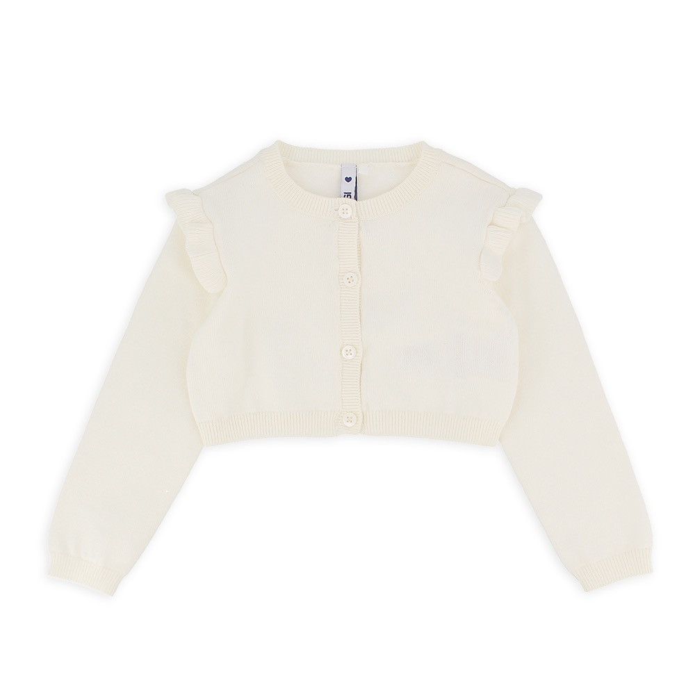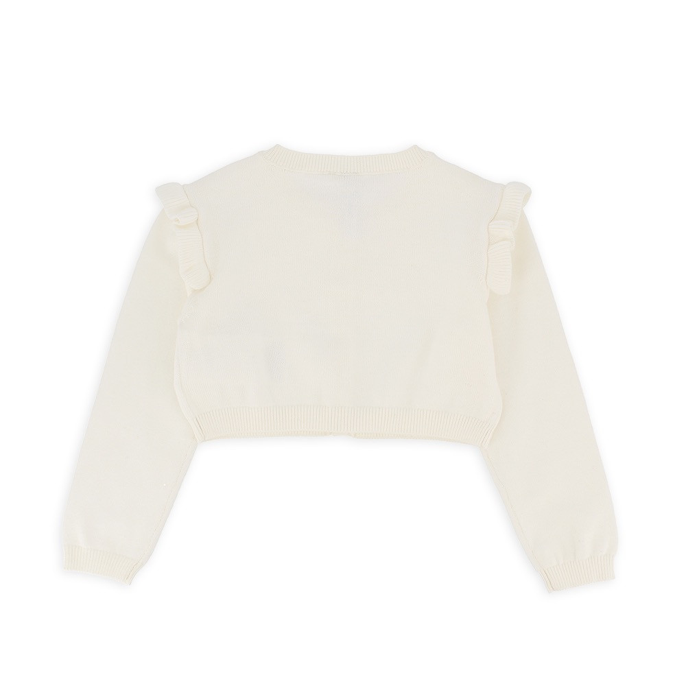 Knitted cardigan, with round neckline, long sleeves with ruffles. Front closure with buttons.
