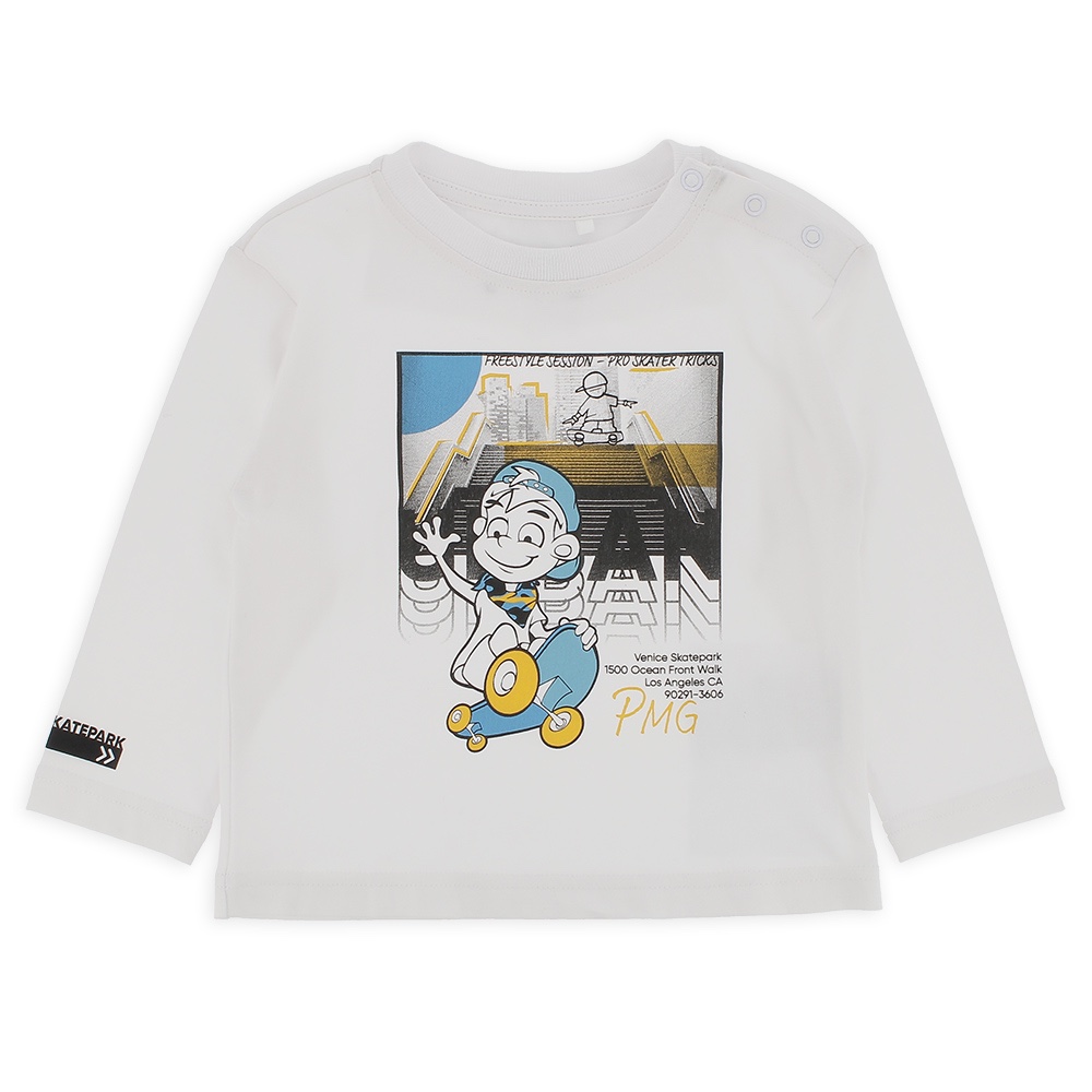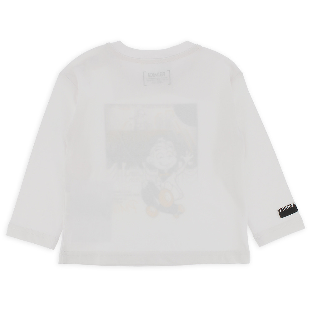 Oversized jersey T-shirt, crew-neck, long-sleeved. Snap button closure on the shoulder. Front print ing.