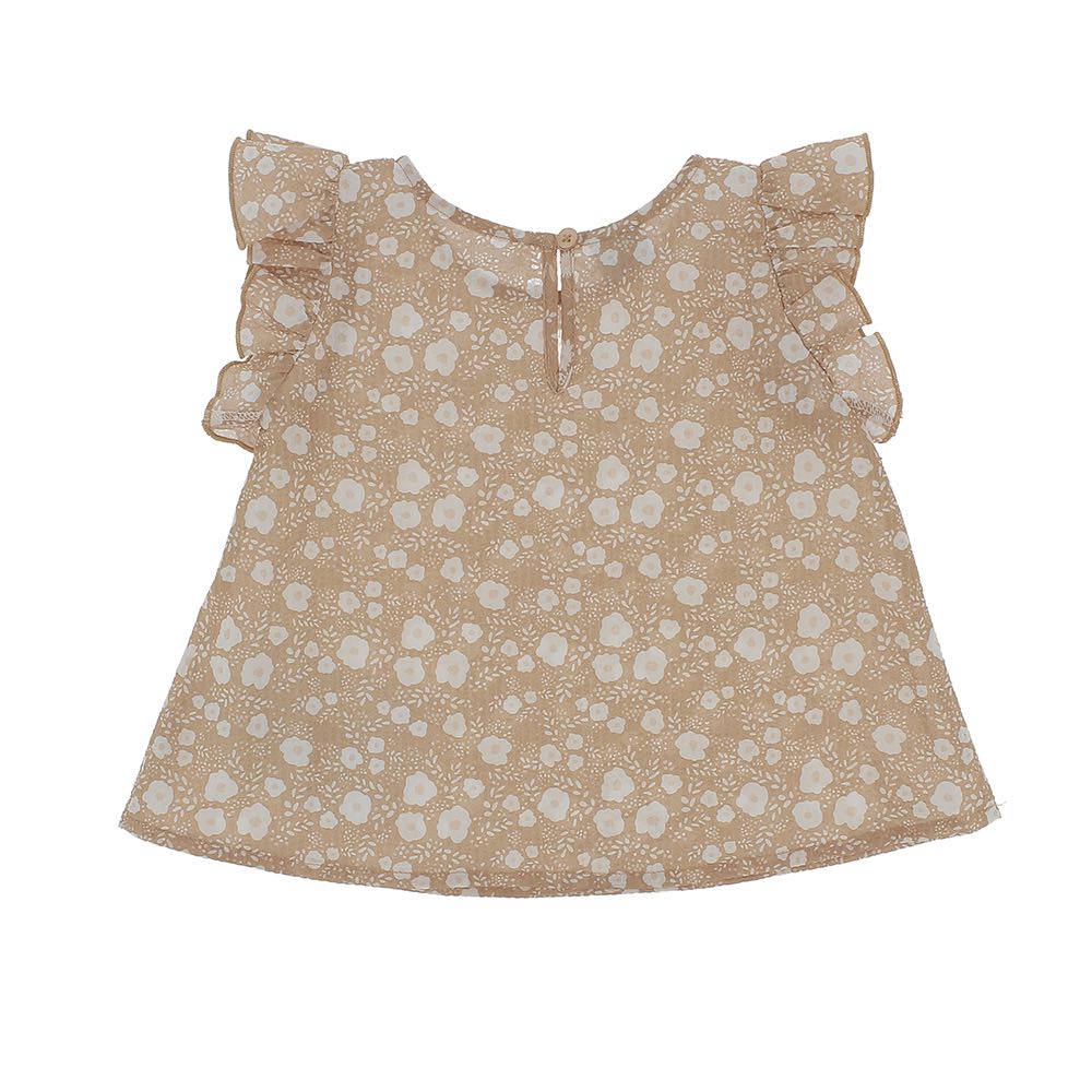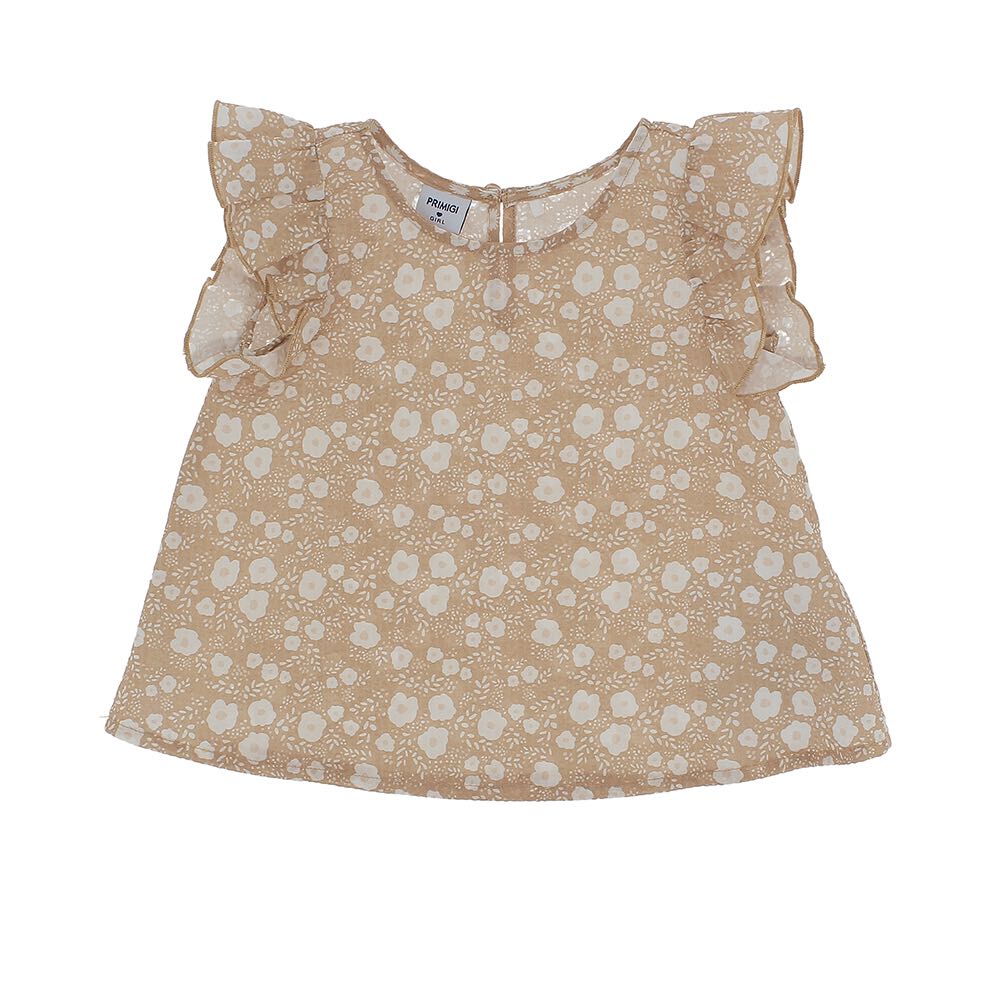 Fantasy-fabric blouse with ruffles on the armholes. Back closure with buttons.