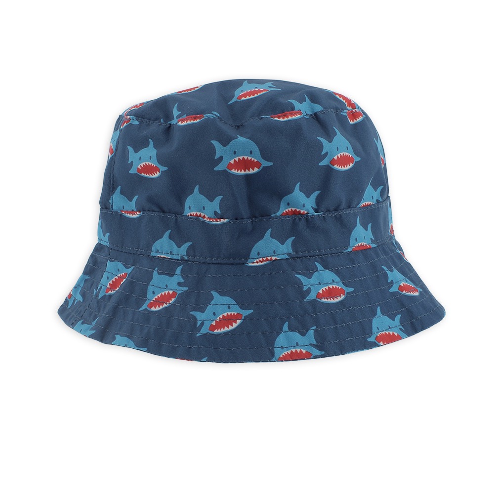 Fisherman's cap in cotton patterned with sharks. Closure with adjustable drawstrings. Lined interio r.