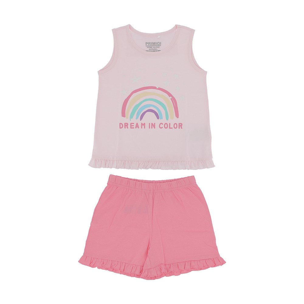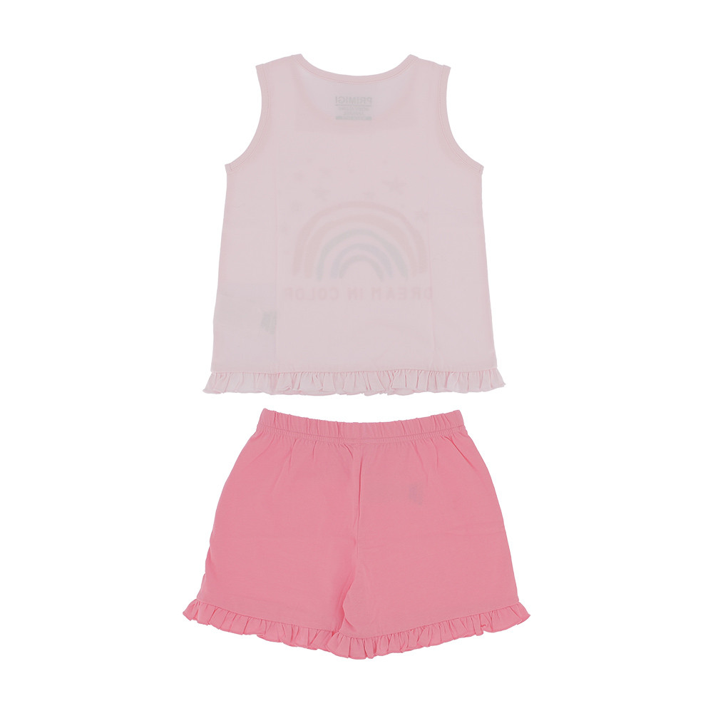 Jersey pajamas suit. Crew-neck tank top with print on the front and small rouche on the bottom. Sho rts with elasticated waist.
