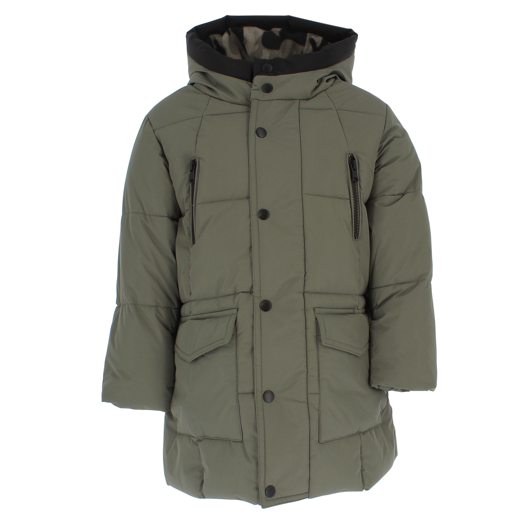 Hooded jacket, long sleeved. Zip closure and snap buttons on the front. Zip pockets and patch pockets on the front. Inner lining in camouflage patterned fleece. Small rubberized logo on the hood.