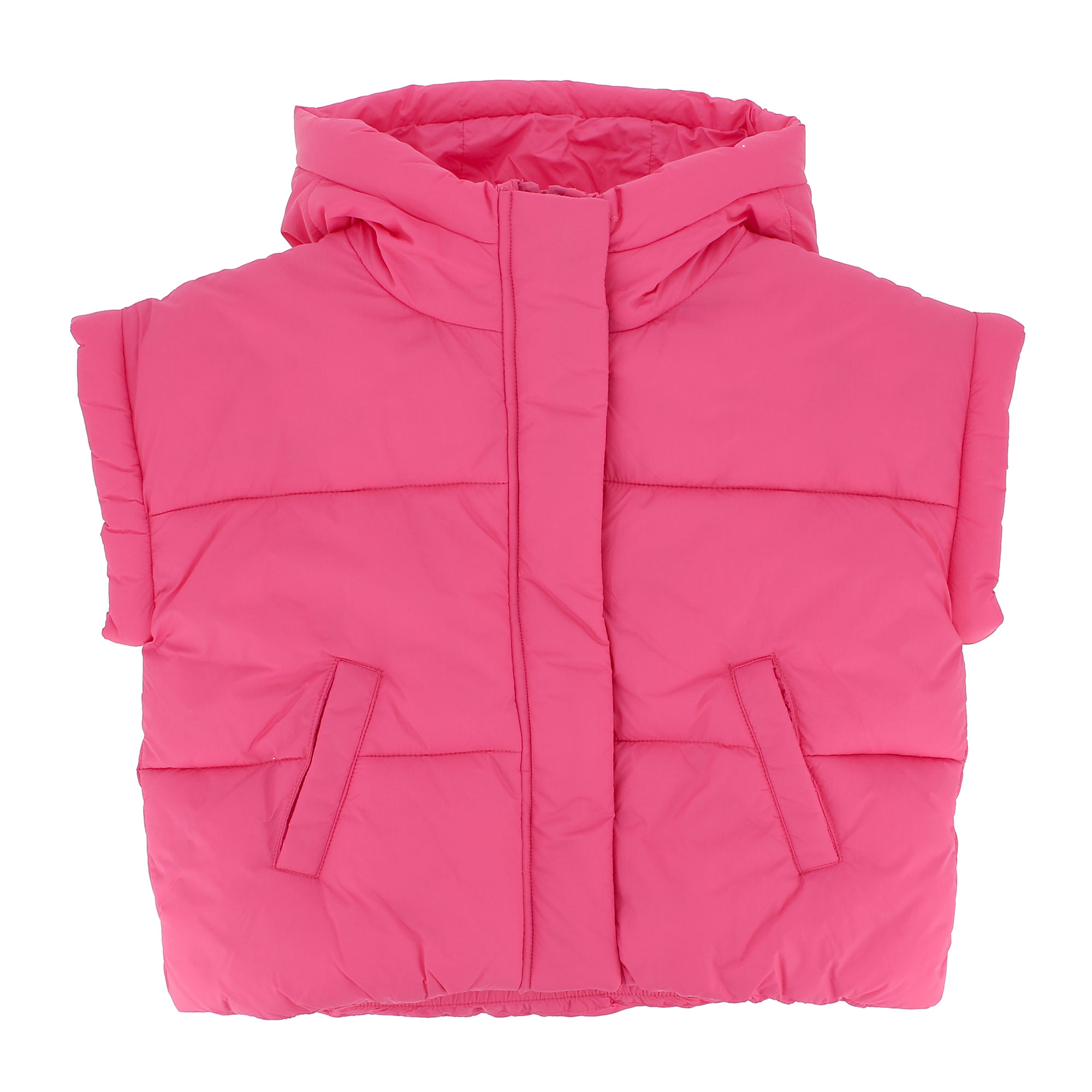 Nylon vest with hood. Zip closure and snap buttons on the front. Front pockets.
