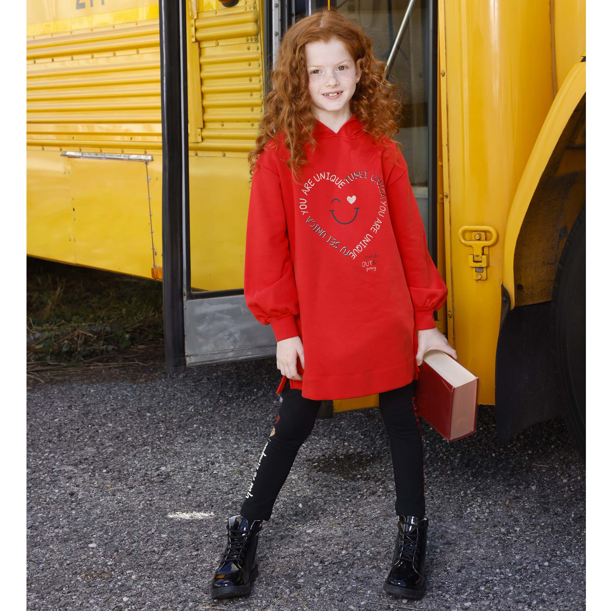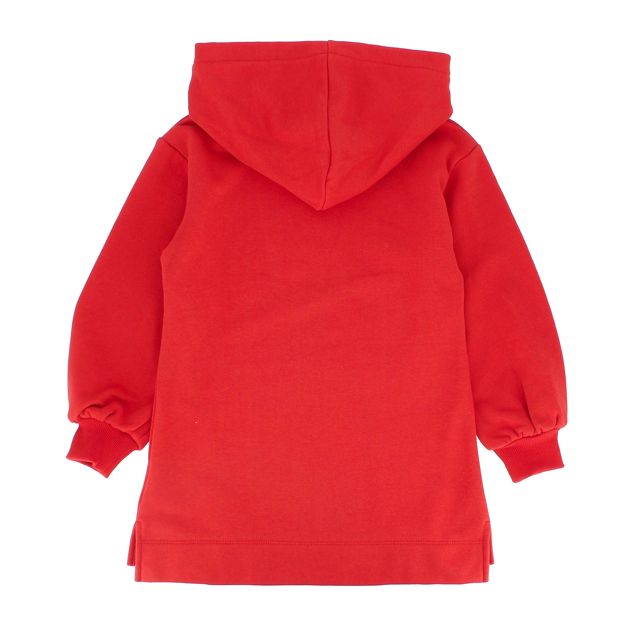 Dress in fleece with hoodie, long sleeved. Print with glitter lettering and details on the front.