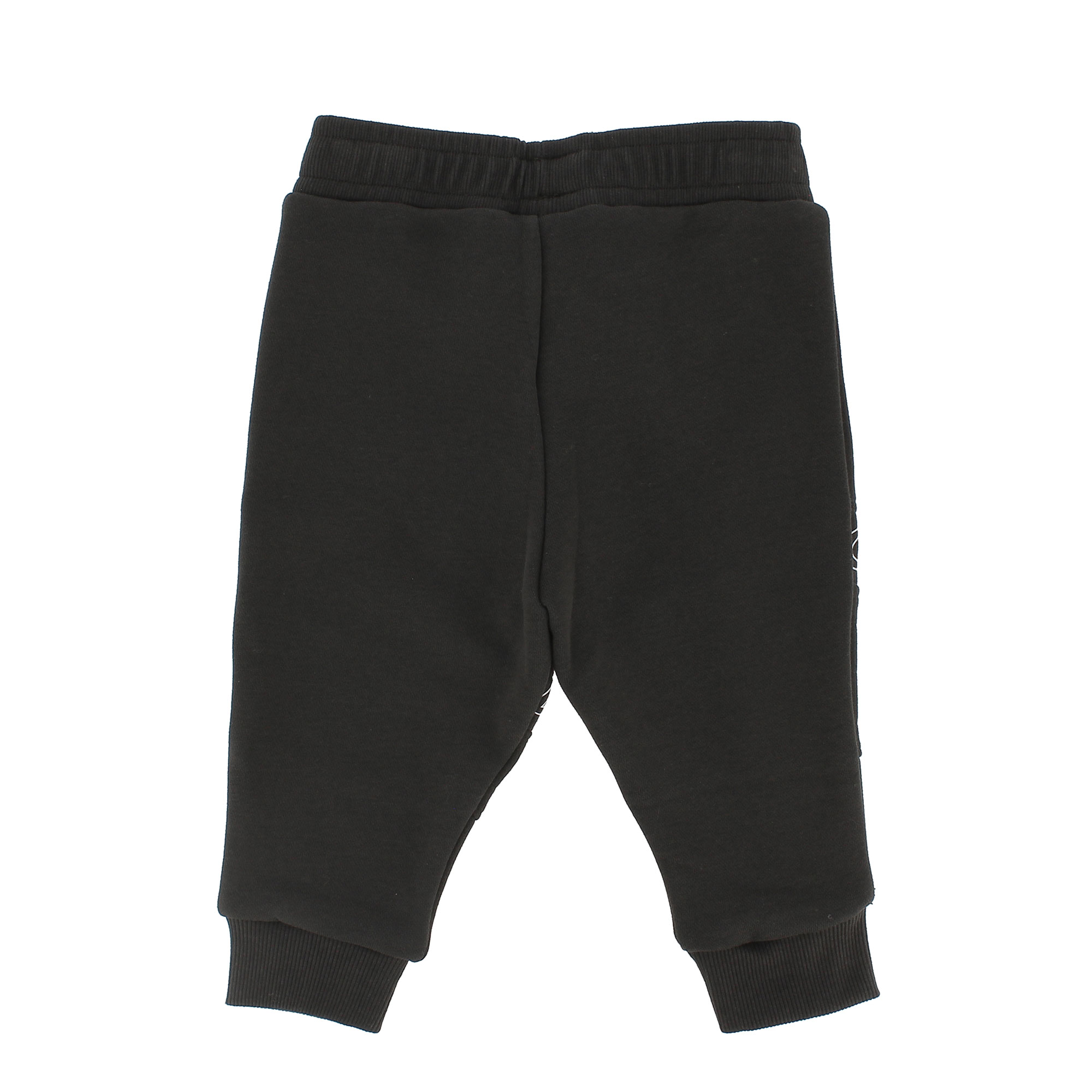 Fleece trousers with elasticated waist and laces on the front. Side pockets and transverse cuts on the knees with printed lettering. Ribbed bottom.