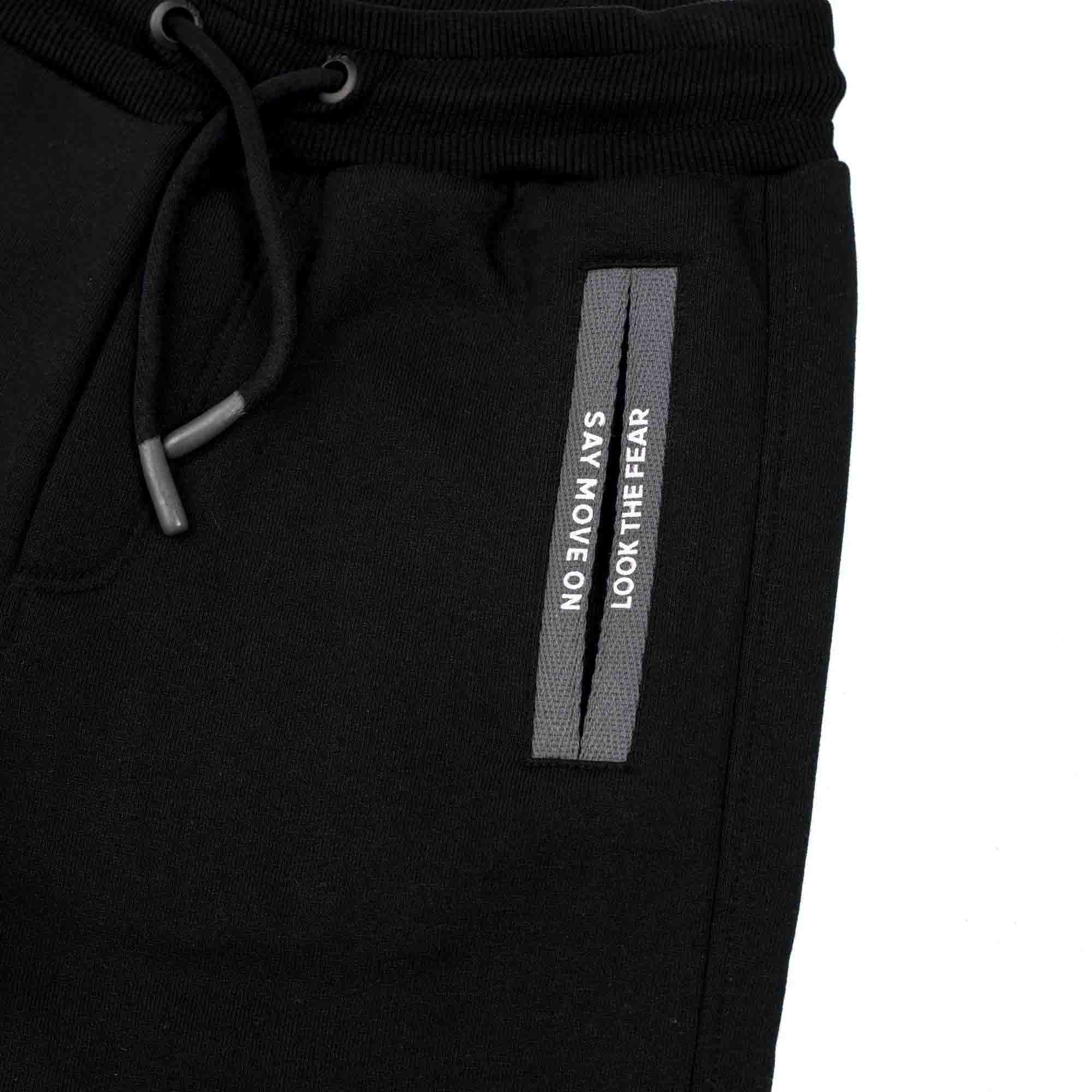 Fleece trousers with elasticated waist and laces on the front. Side welt pockets with printed contrasting cotton ribbon. Horizontal cuts on the knees.