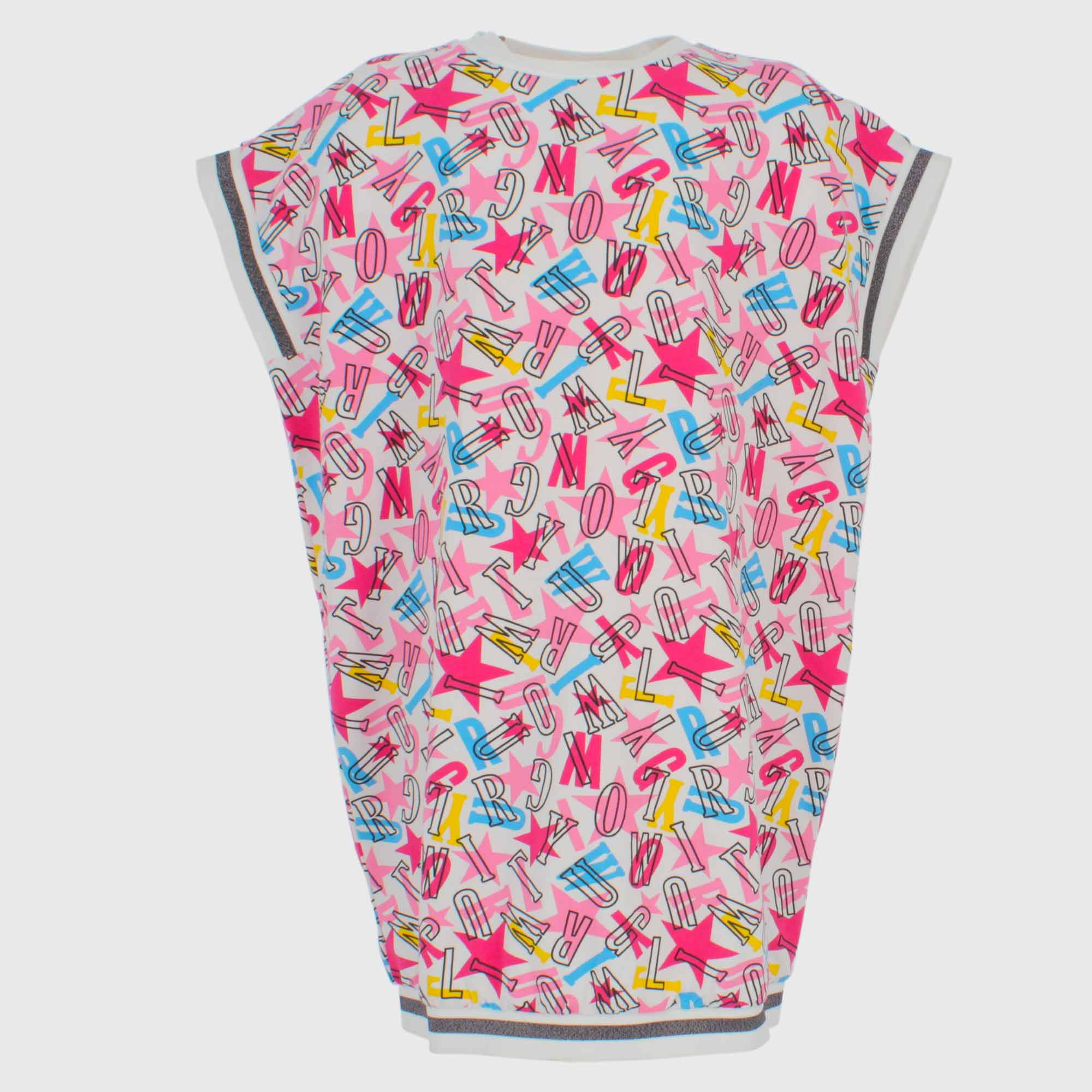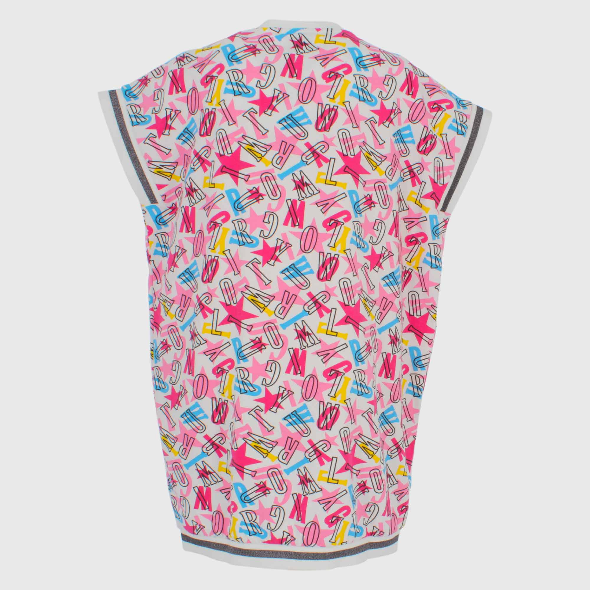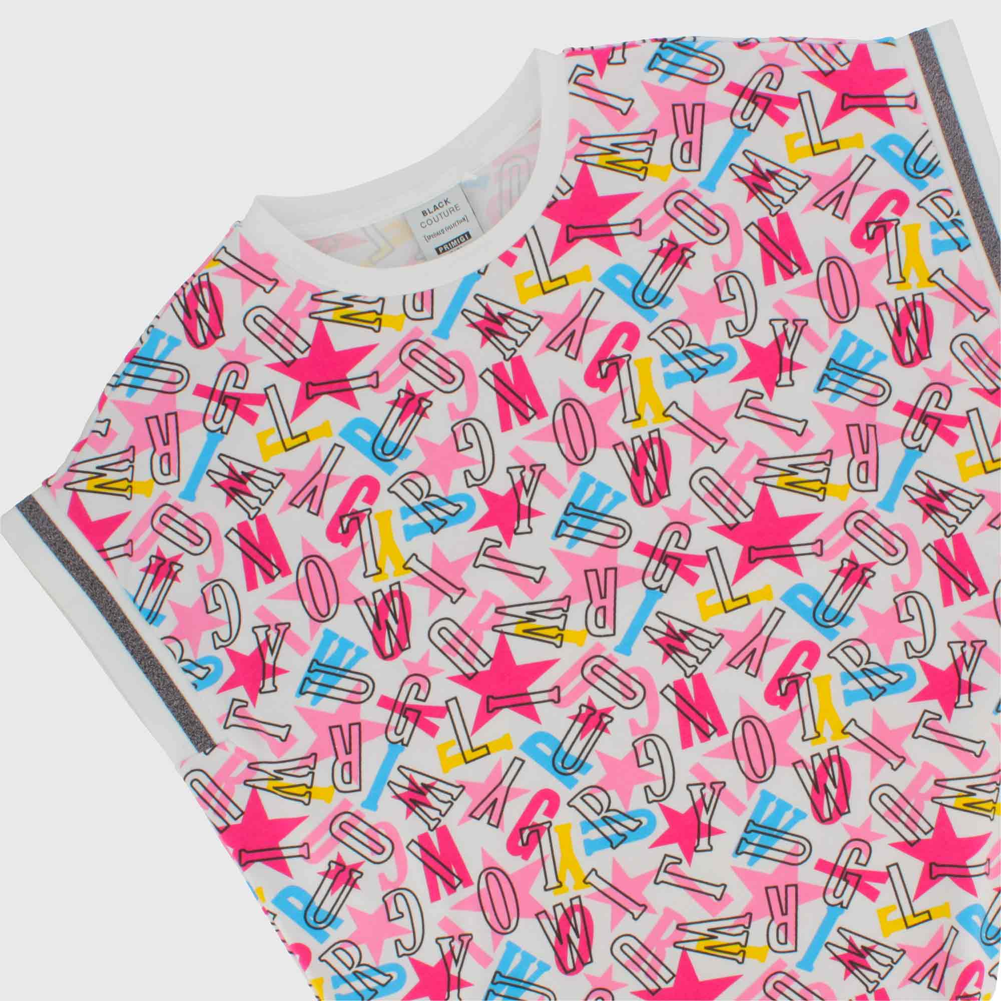 Dress in crew-neck jersey, short sleeves. Elastic with glitter stripe on bottom and sleeves. All over printing.