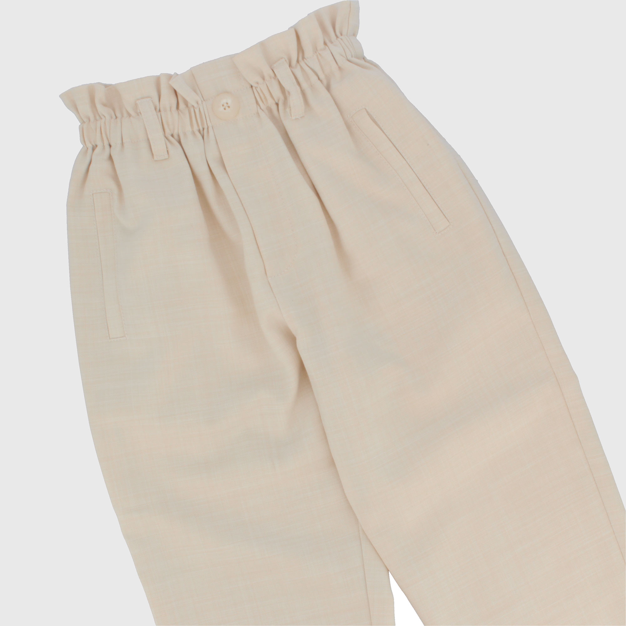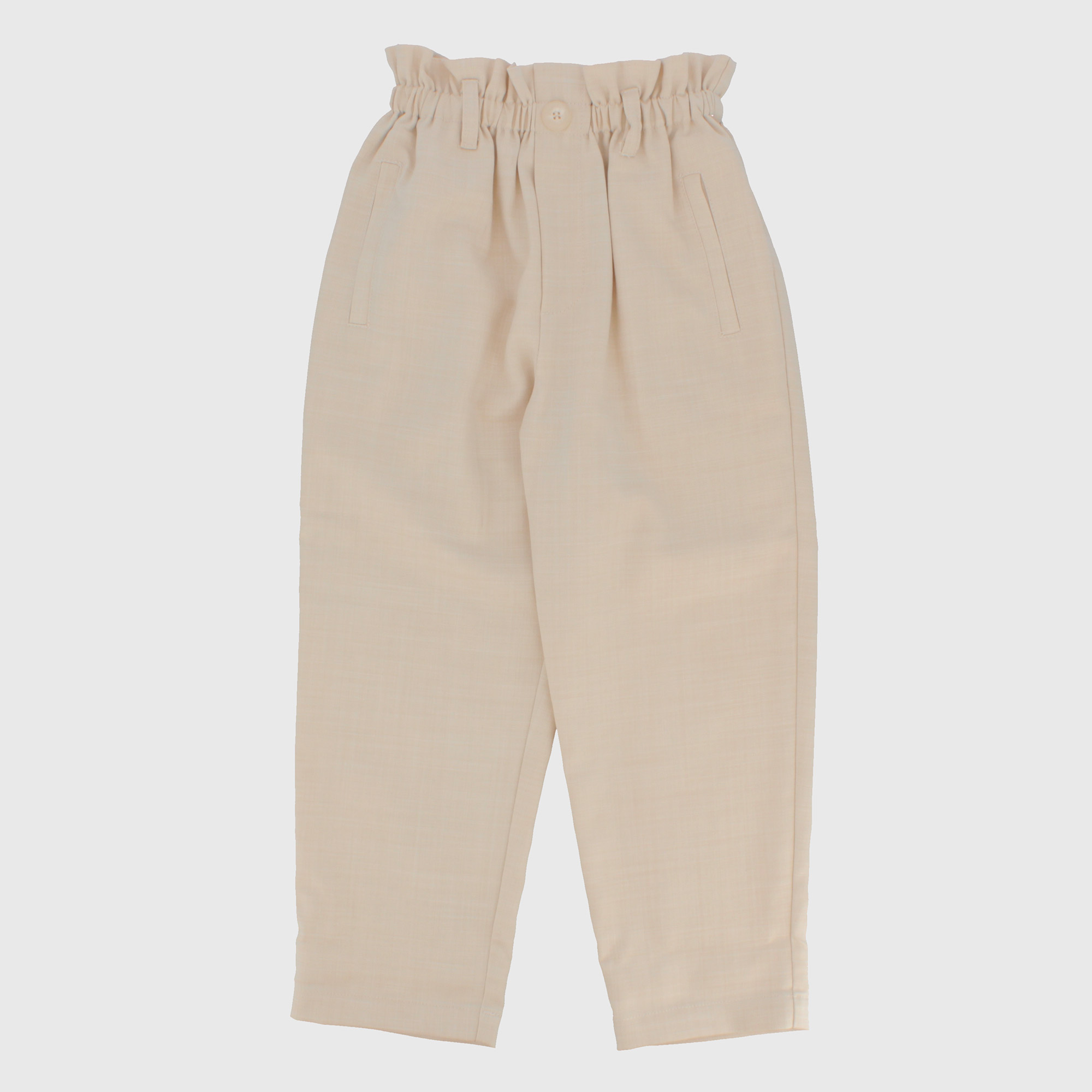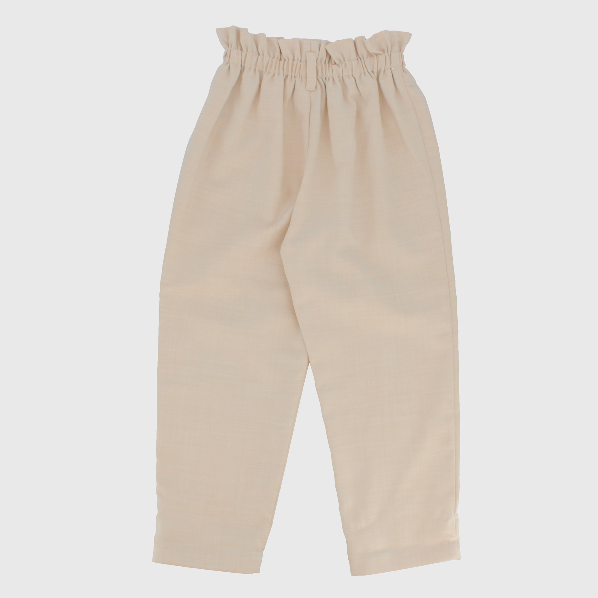 Paperbag trousers with elasticated waist and button. Pockets on the front and loops on the waist.