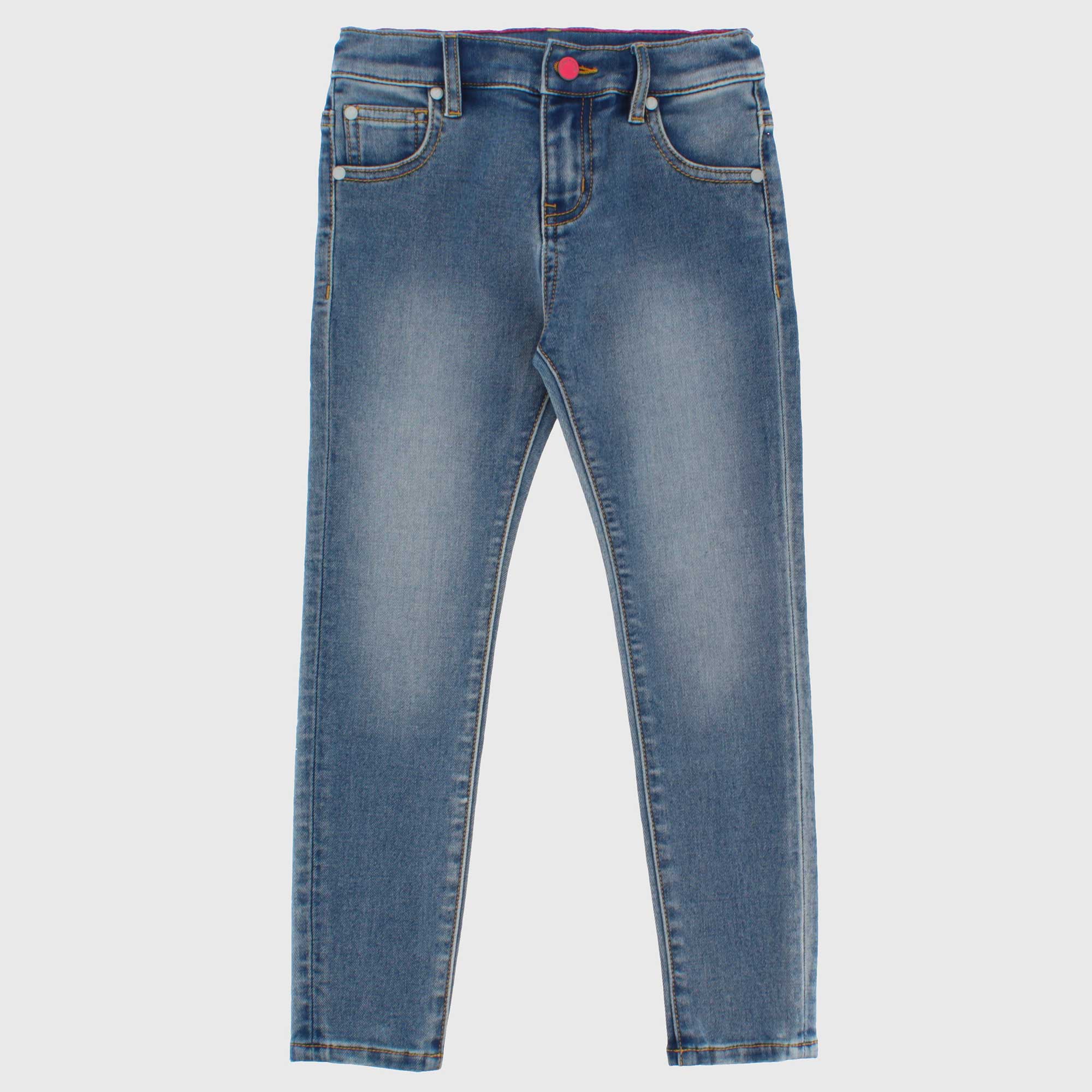 Denim trousers with adjustable waist inside. Button and zip closure. Five pockets.
