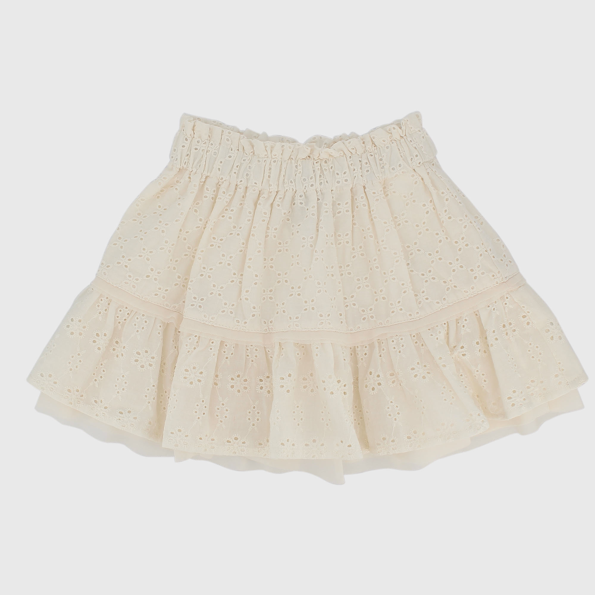 Skirt with ruffles in San Gallo lace, elasticated waist. Lining.