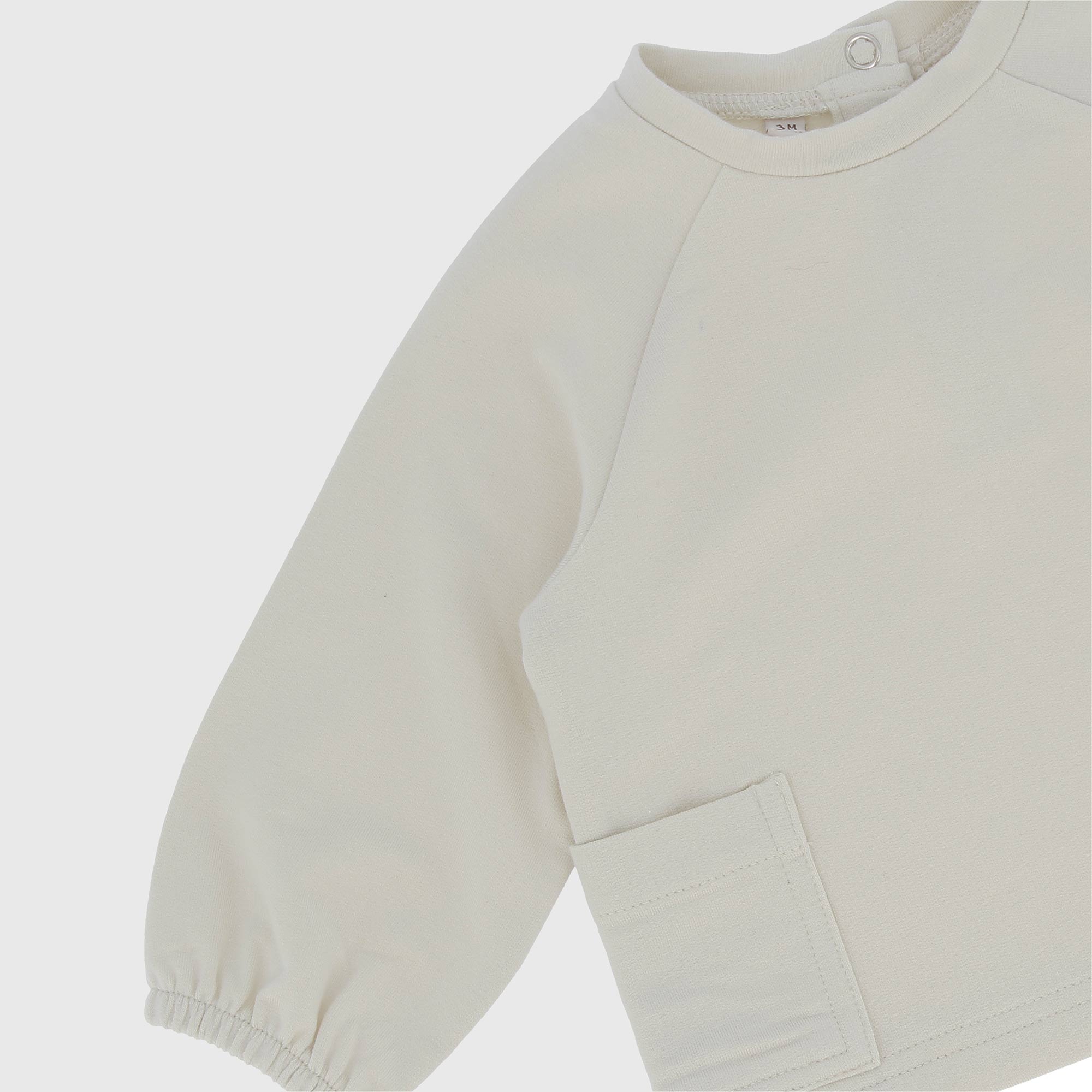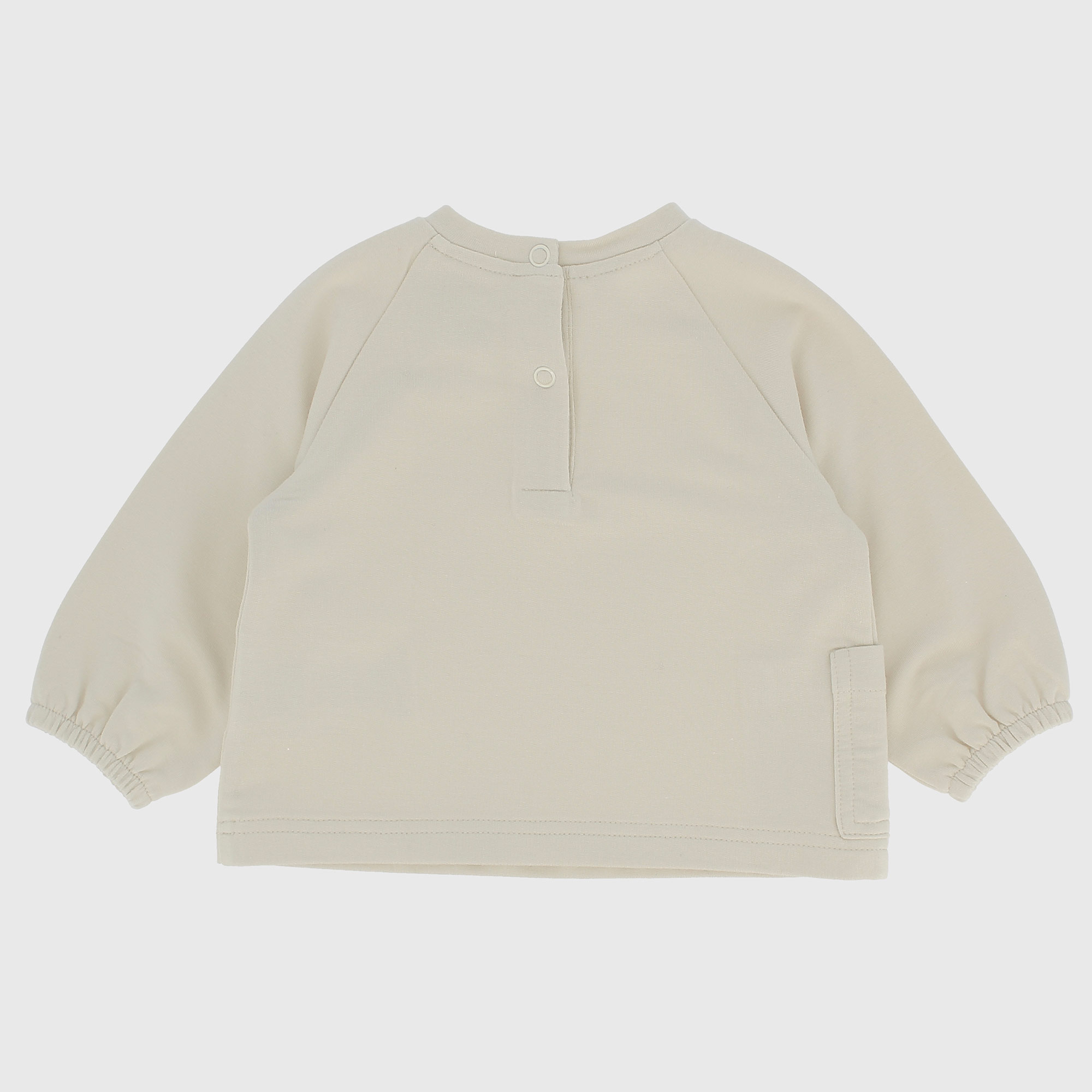 Long-sleeved crew-neck sweatshirt. Back closure with snap buttons. Elastic sleeve hem and side pocket. This garment is eco-sustainable because it is mainly made with sustainable fibers.