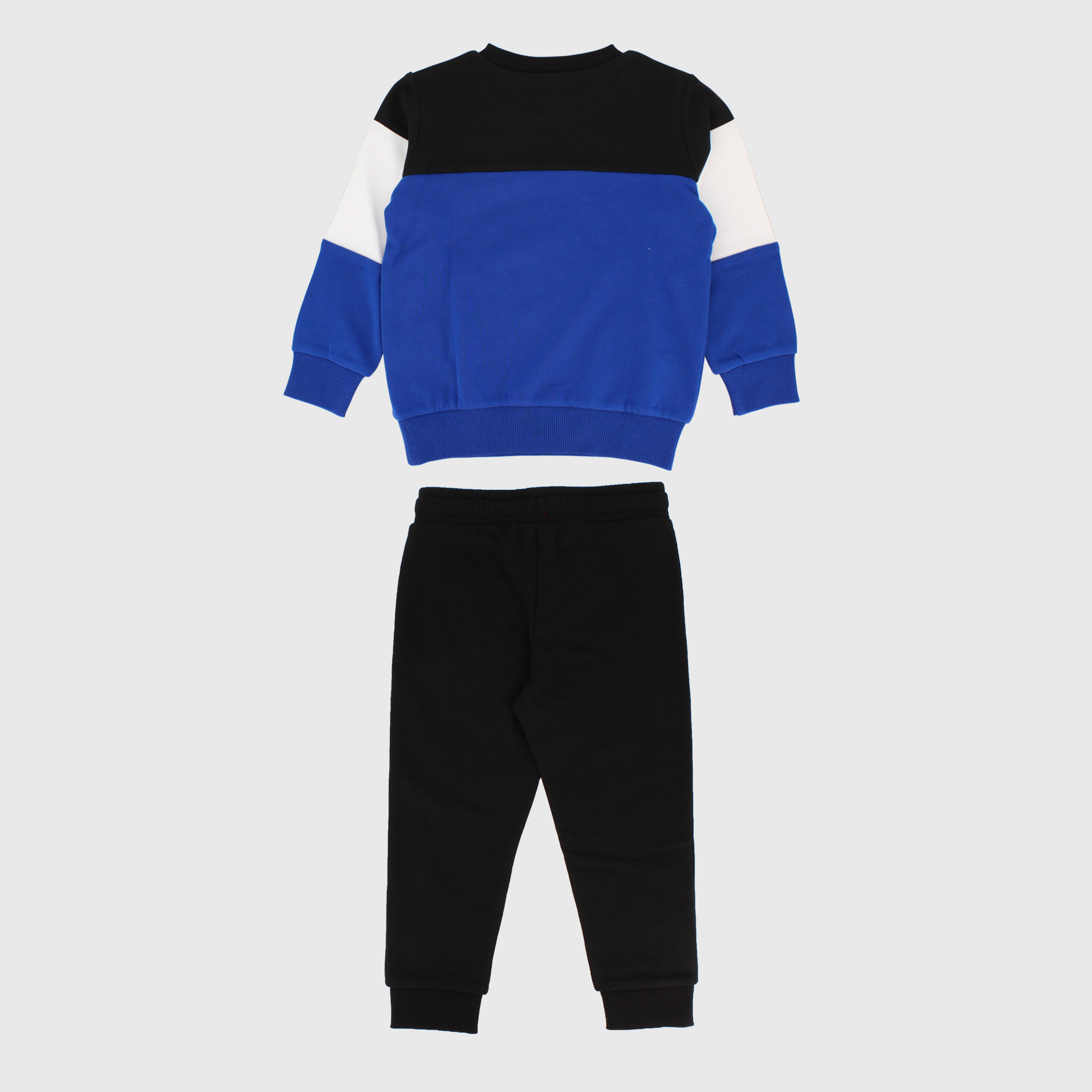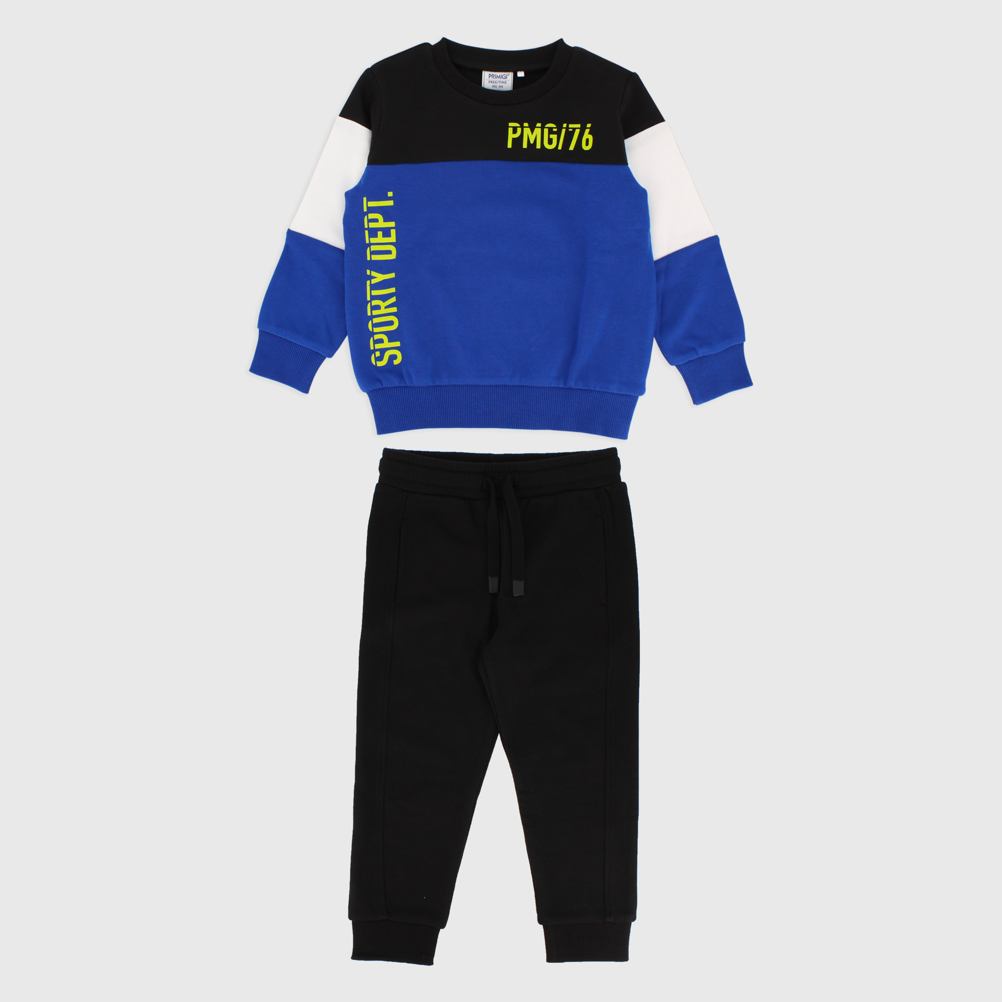 Suit consisting of two pieces. Crew-neck sweatshirt, long sleeves. Front print and contrasting bands on the sleeves. Fleece trousers with elasticated waist and front laces.