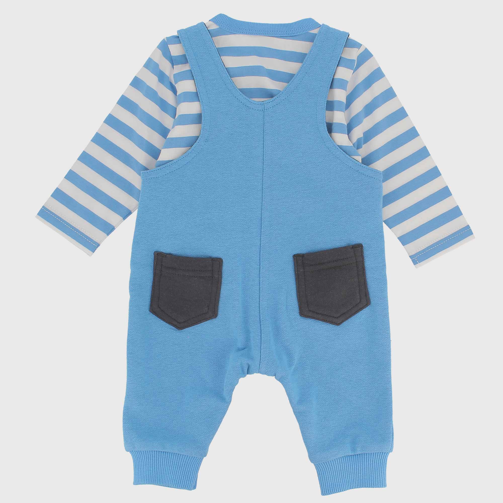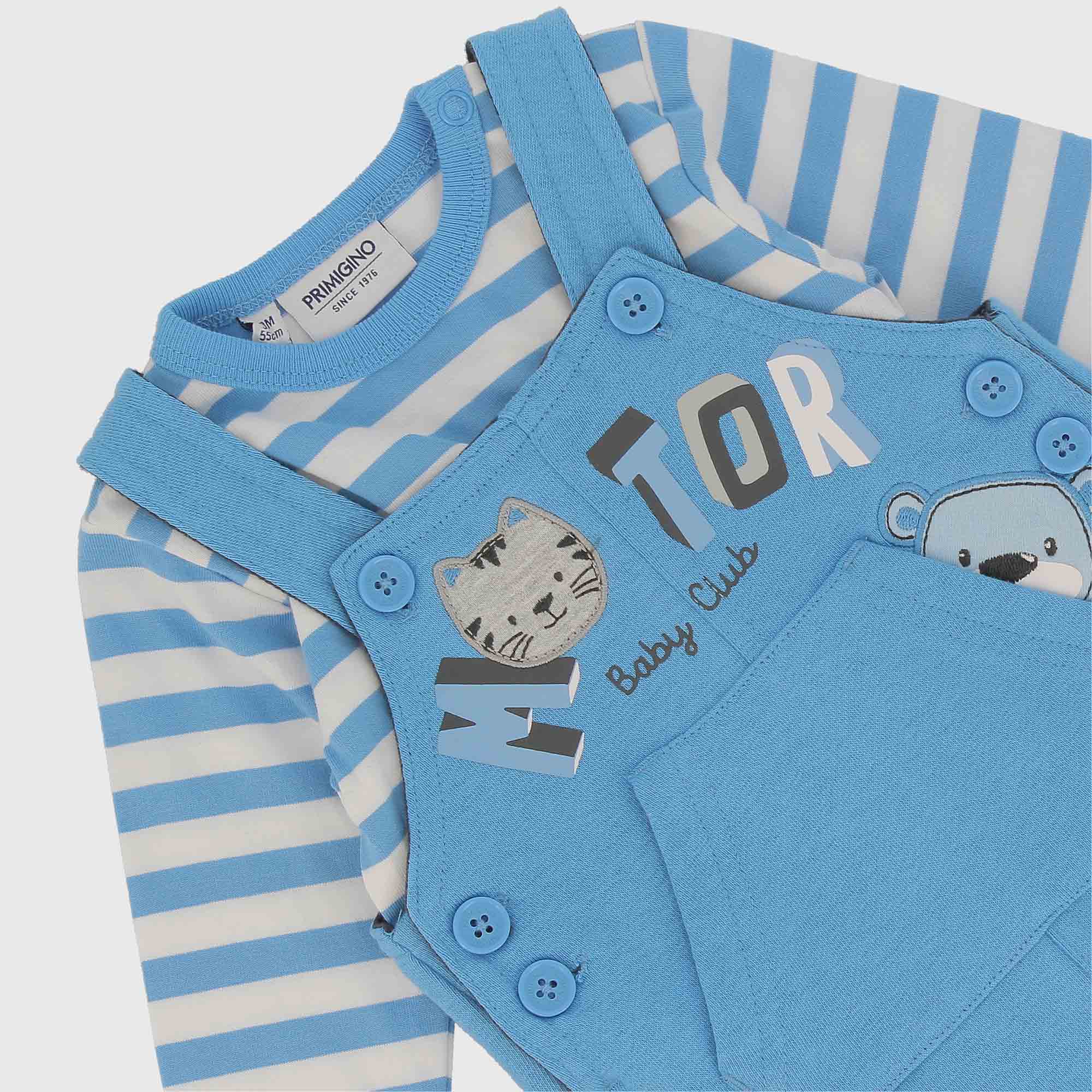 Complete consisting of two pieces. Striped crew-neck jersey t-shirt, with long sleeves. Snap button closure on the shoulder. Fleece overall, snap button closure on the crotch and pouch pocket. Prints and embroidery Bear on the front. Contrasting patch pockets on the back.