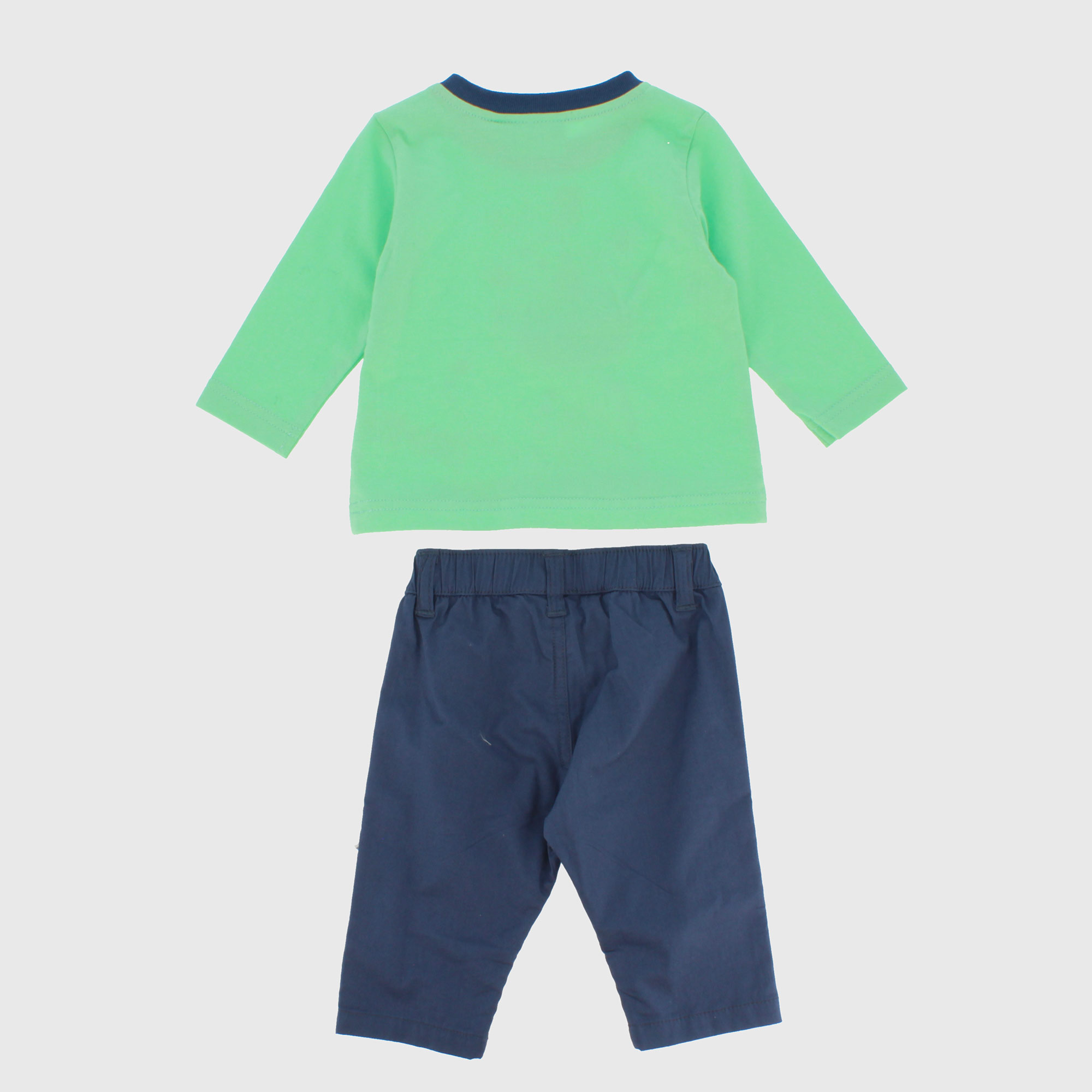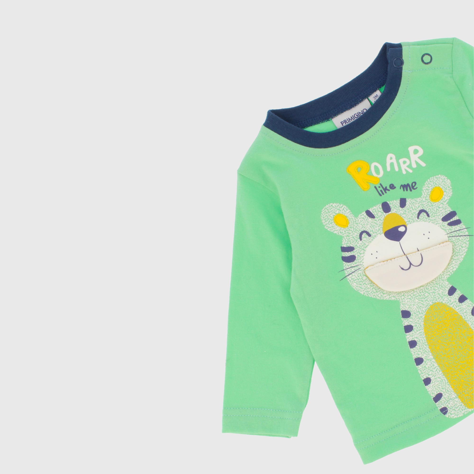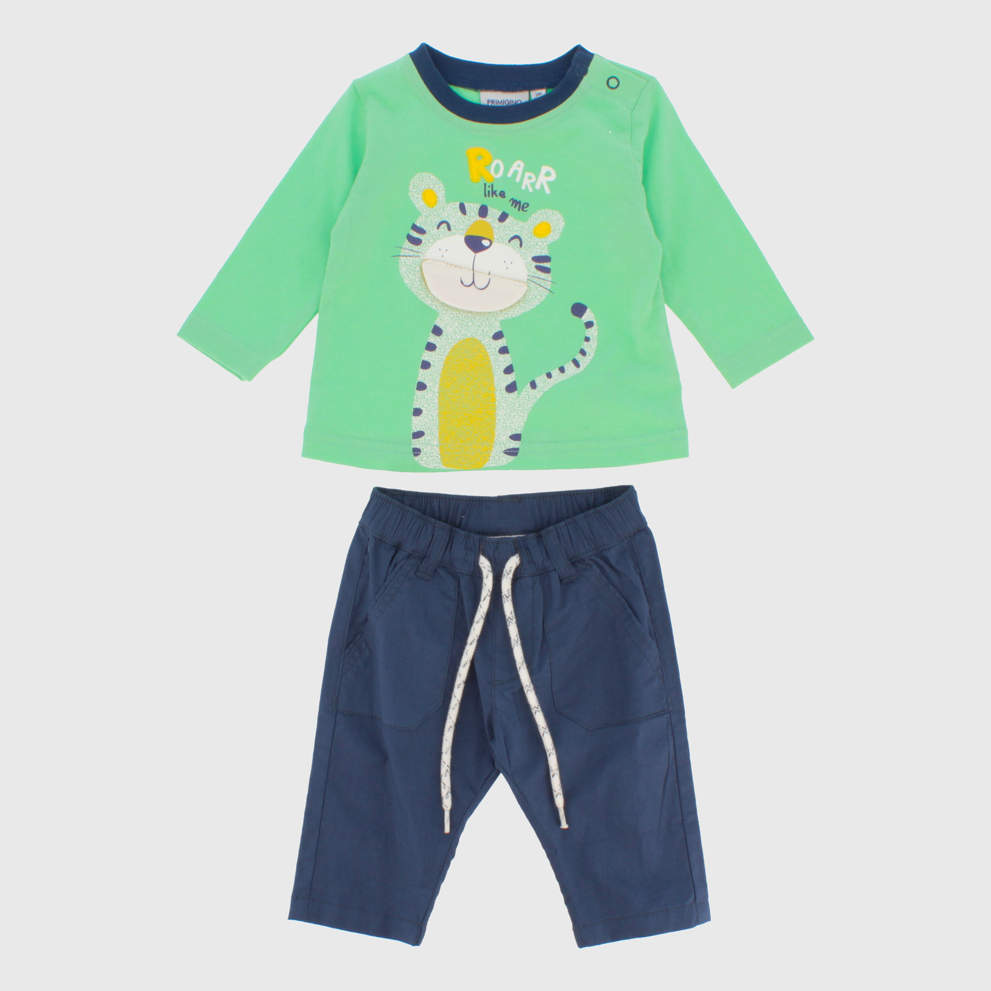 Complete consisting of two pieces. Crew-neck jersey t-shirt with long sleeves. Snap button closure on the shoulder. Tiger front print with embroidered details. Cotton trousers with elasticated waist and drawstring, front pockets.