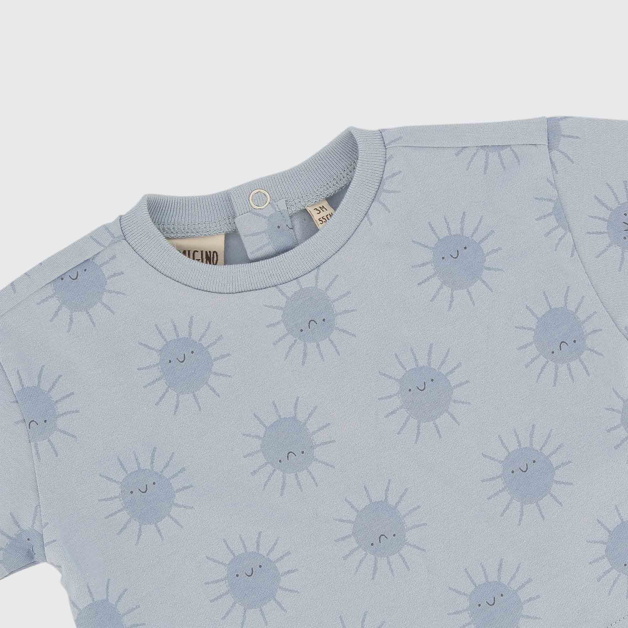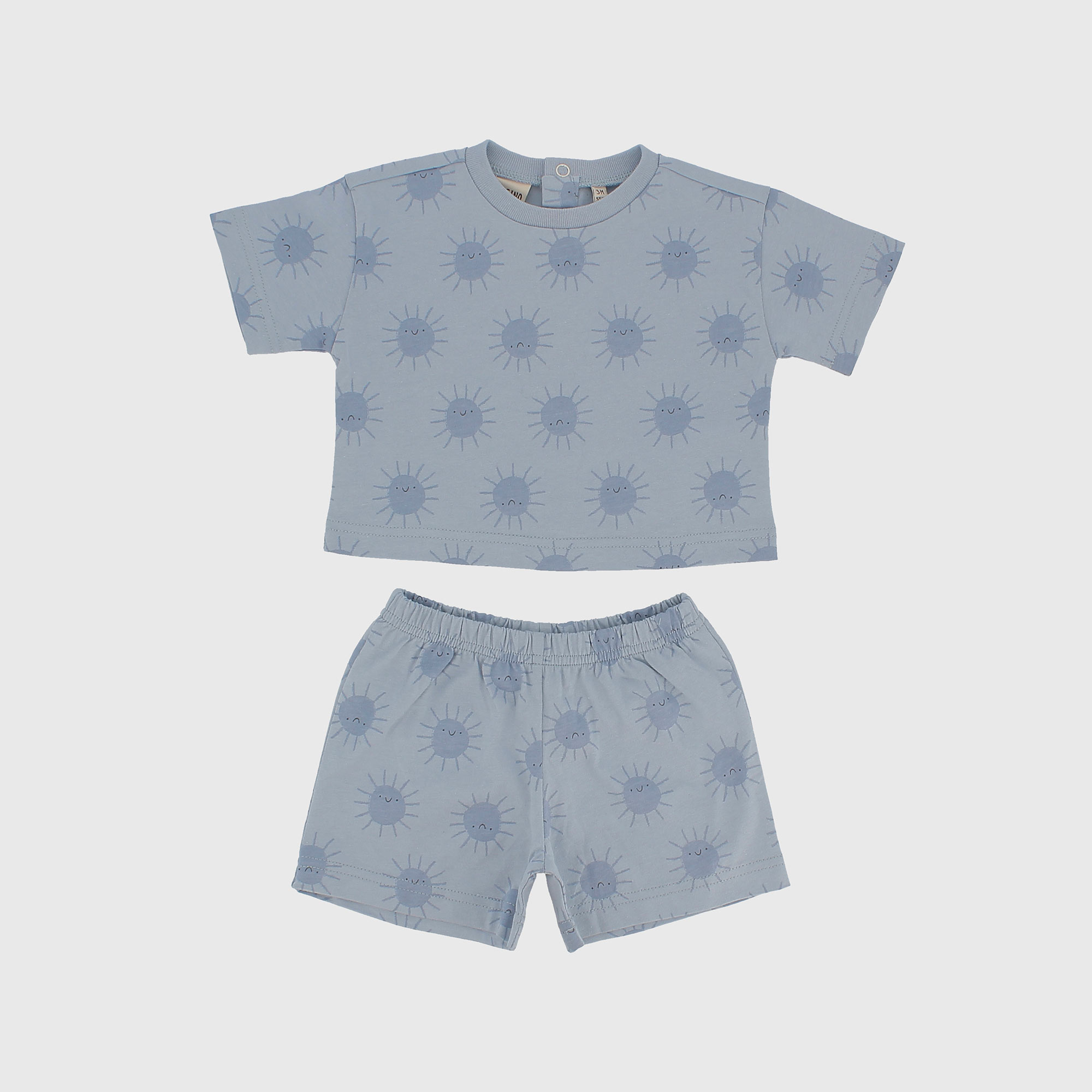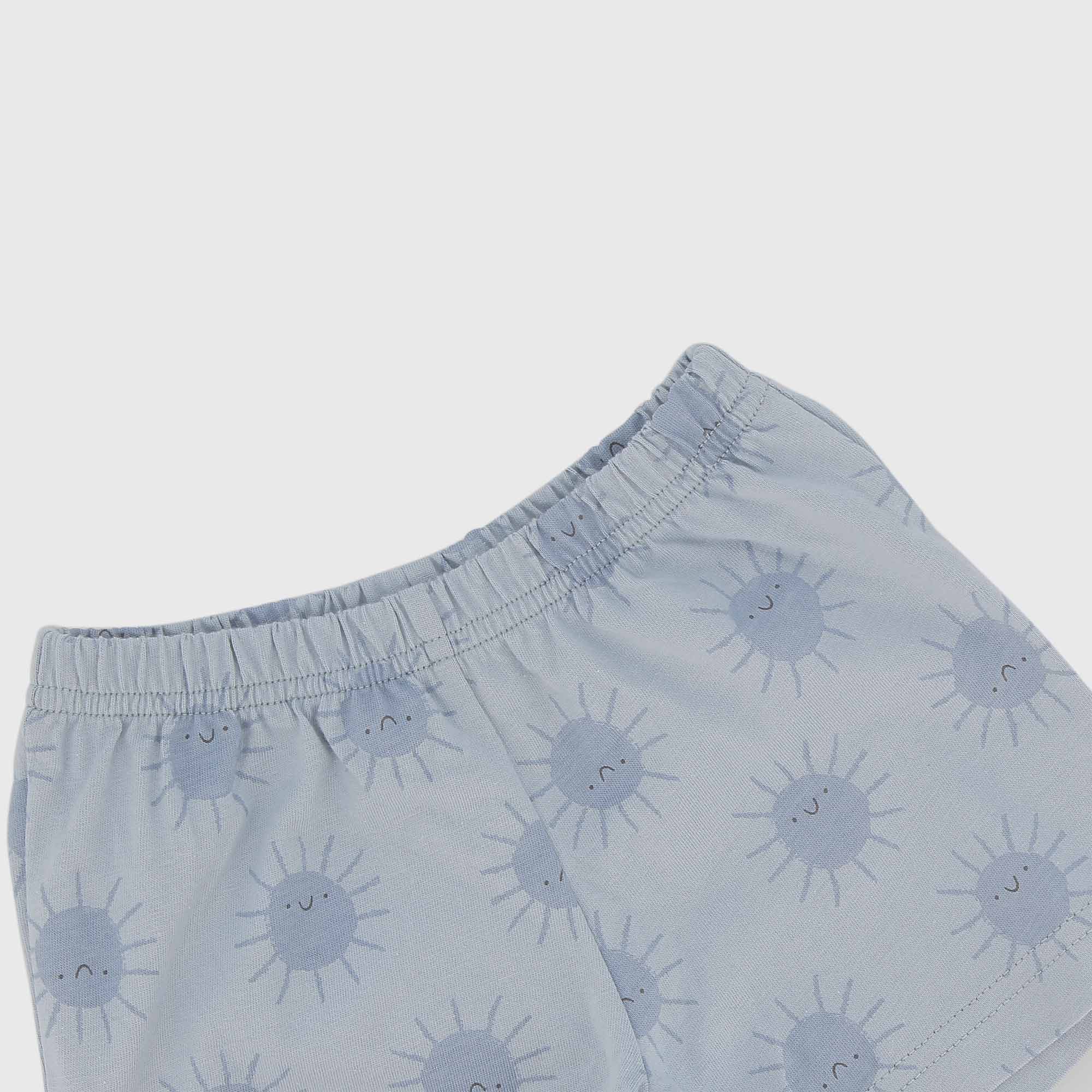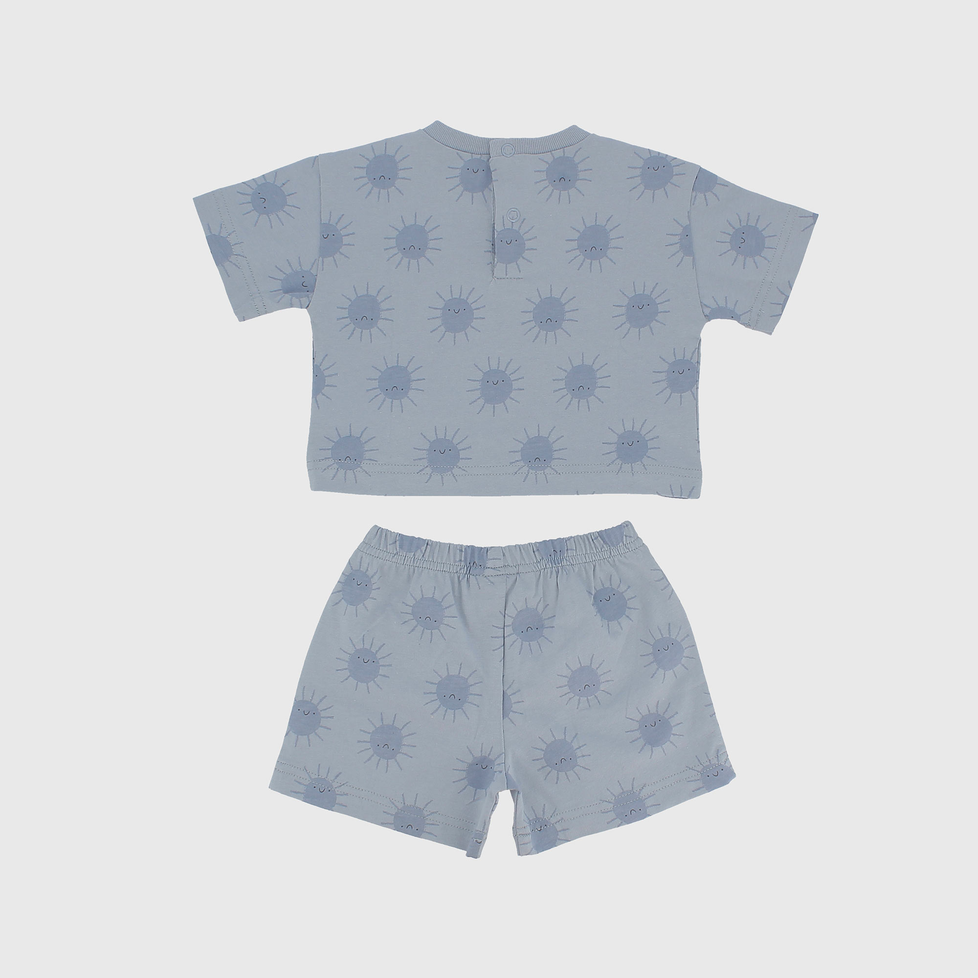 Complete consisting of two pieces. Short-sleeved crew-neck jersey shirt. Back closure with snap buttons. Jersey Bermuda shorts with elasticated waistband. This garment is eco-sustainable because it is mainly made with organic cotton.