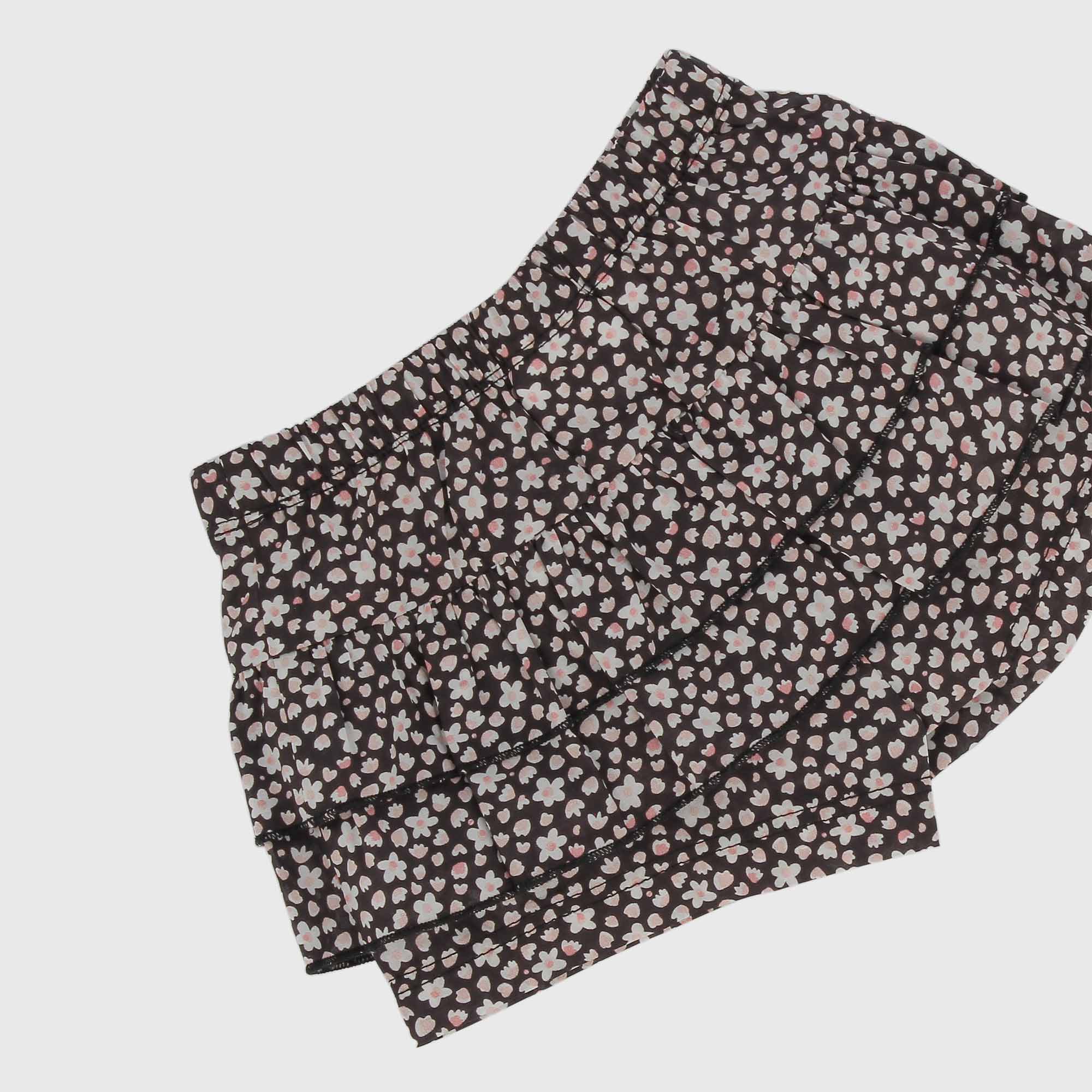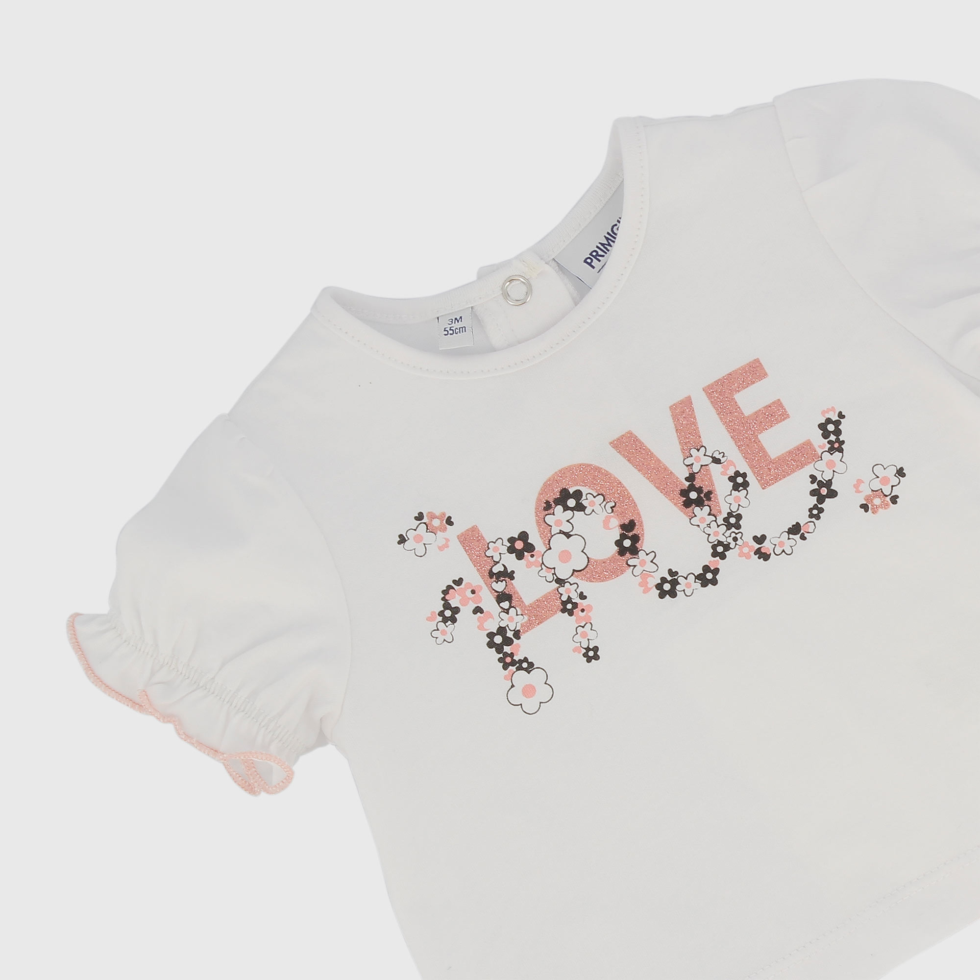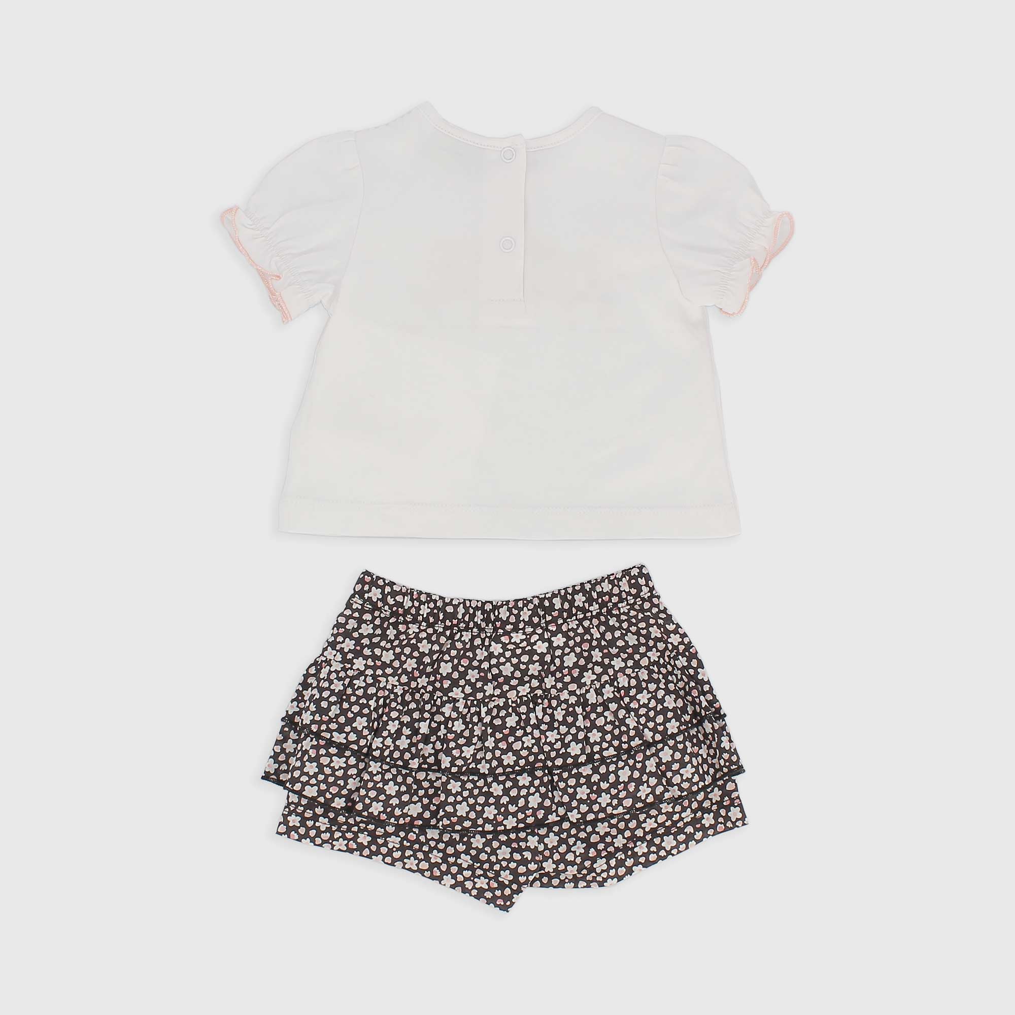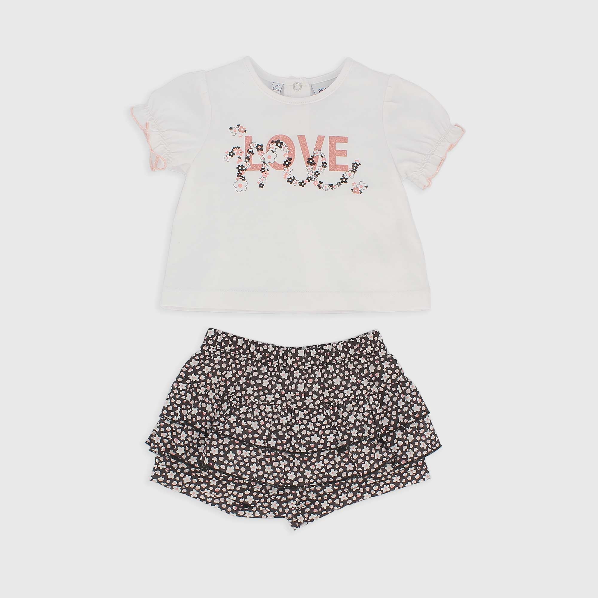 Complete consisting of two pieces. Crew-neck jersey t-shirt with short sleeves. Back closure with snap buttons. Front print with glitter details. Floral cotton shorts with elasticated waist and ruffles.