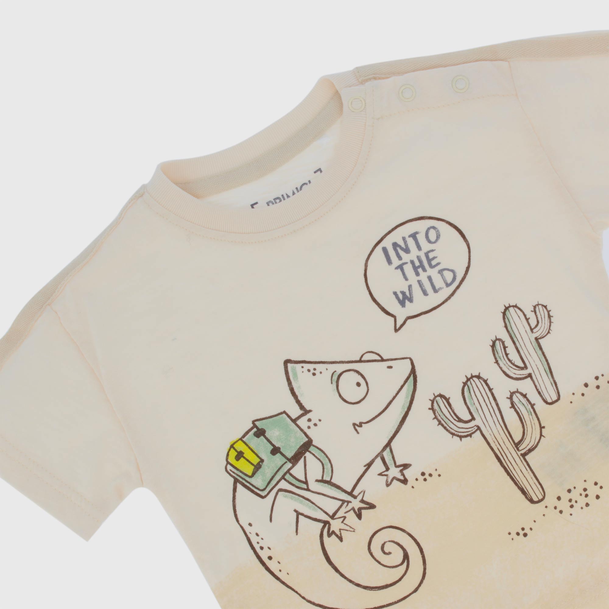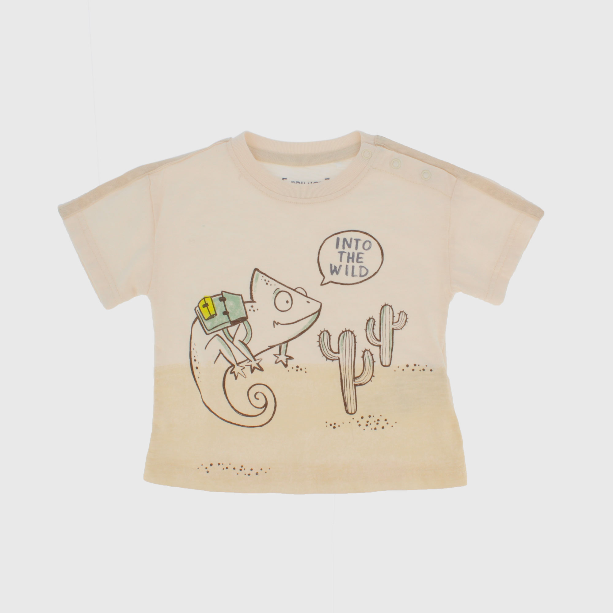 Oversized t-shirt, flamed jersey, crew-neck, short sleeves. Snap button closure on the shoulder. Front printing. Ton sur ton band applied on the shoulders.