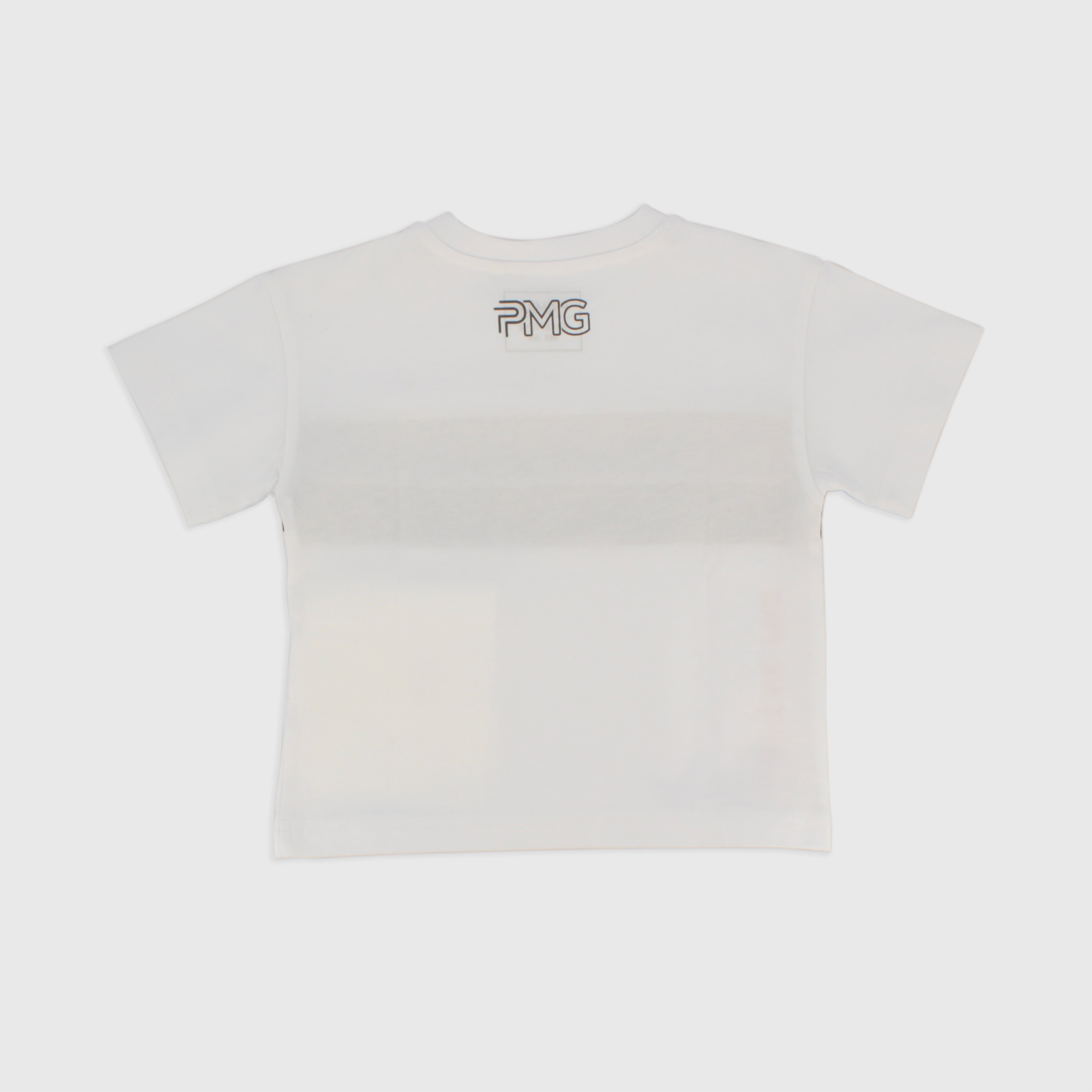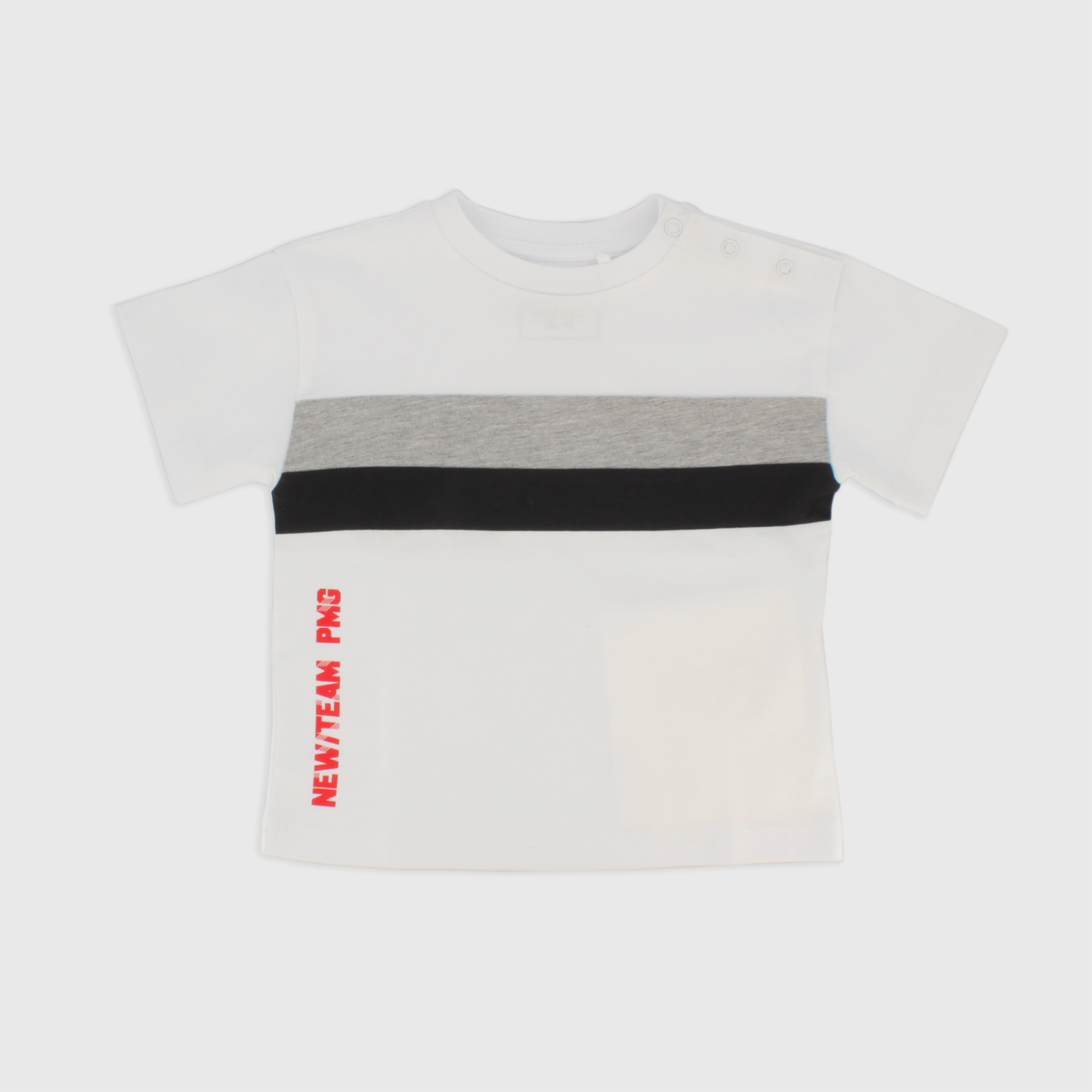 Jersey T-shirt, crew-neck, short sleeves. Snap button closure on the shoulder. Front and back printing.