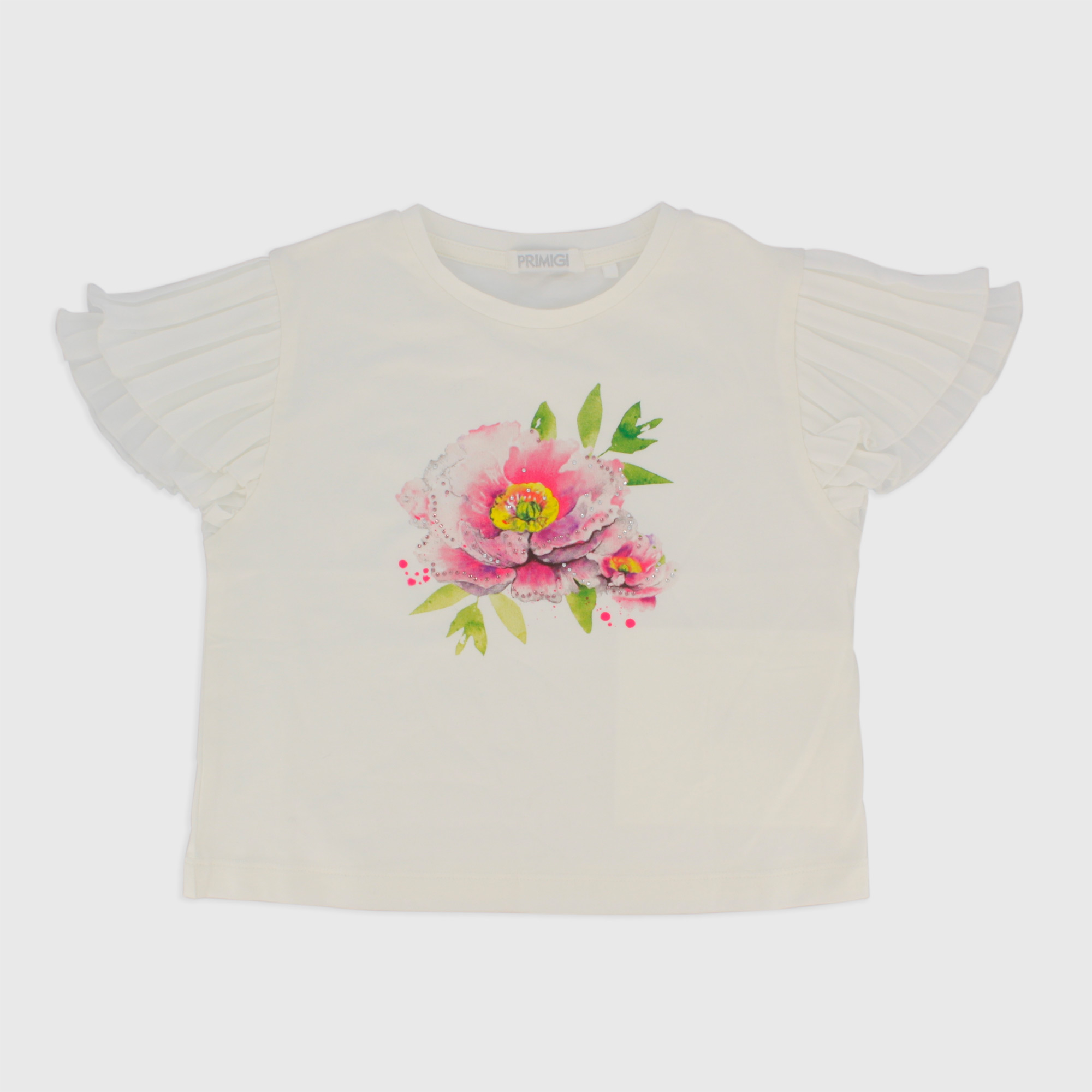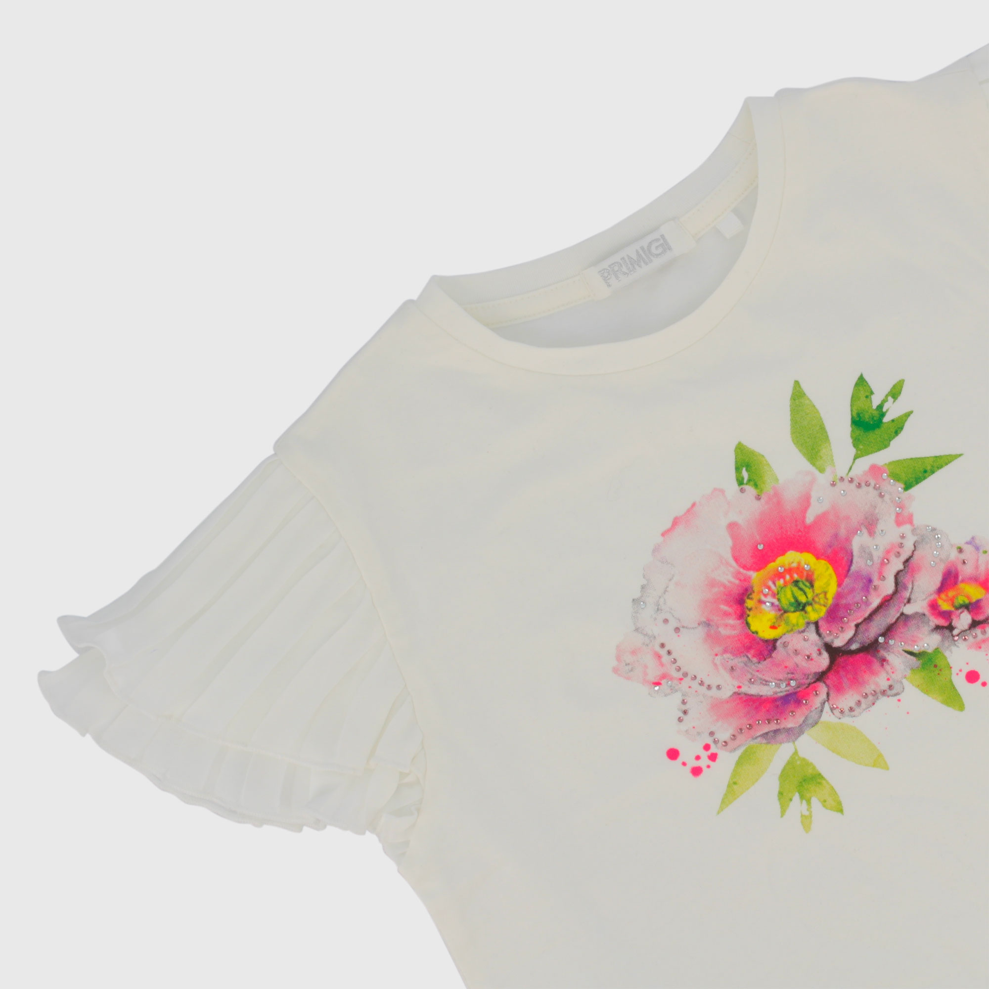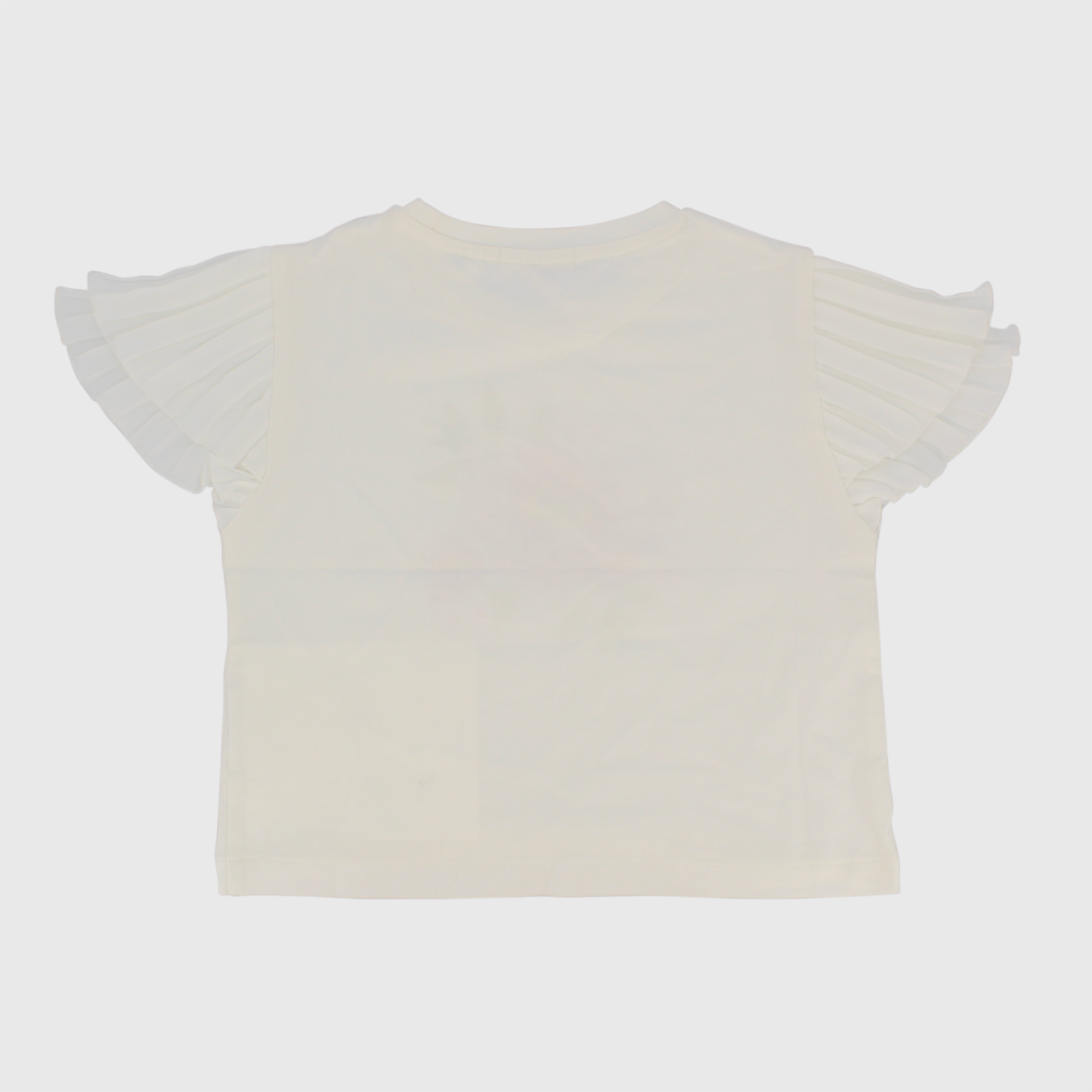 T-shirt in stretch jersey, crew-neck, with pleated short sleeves. Print with rhinestones on the front.