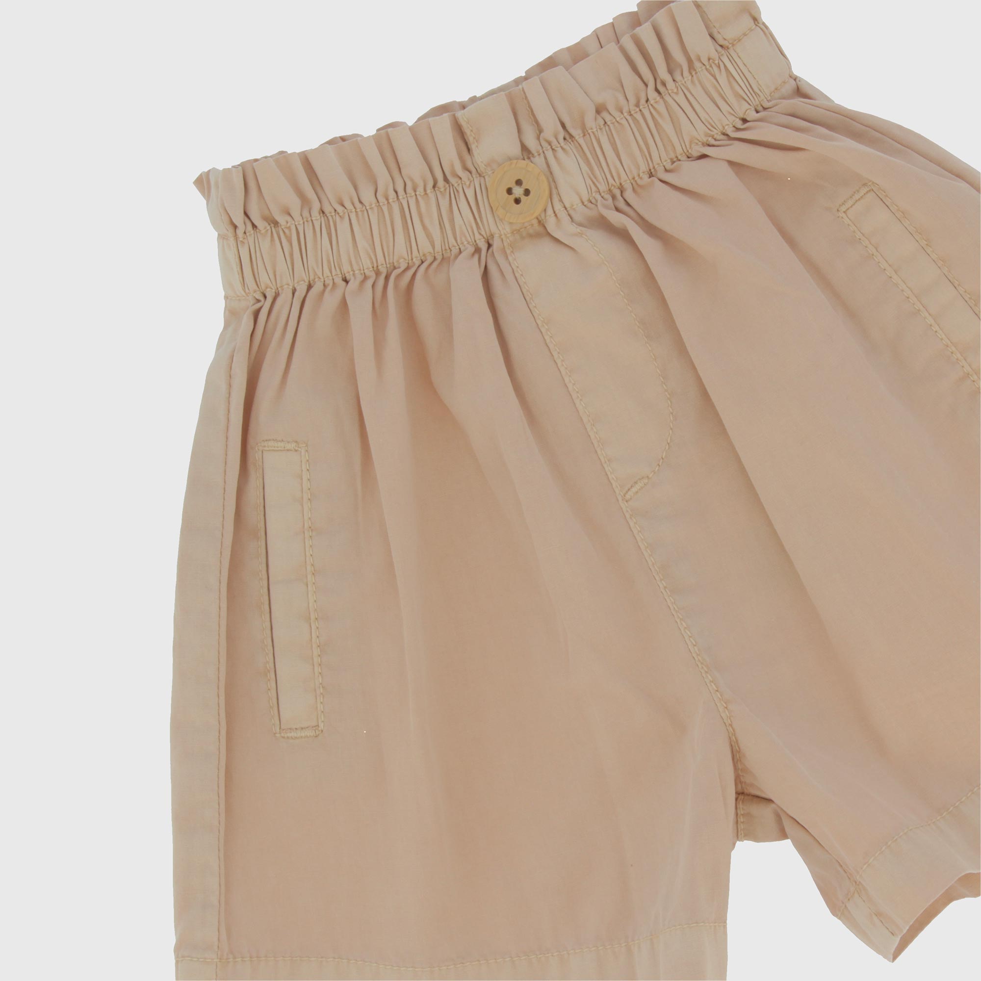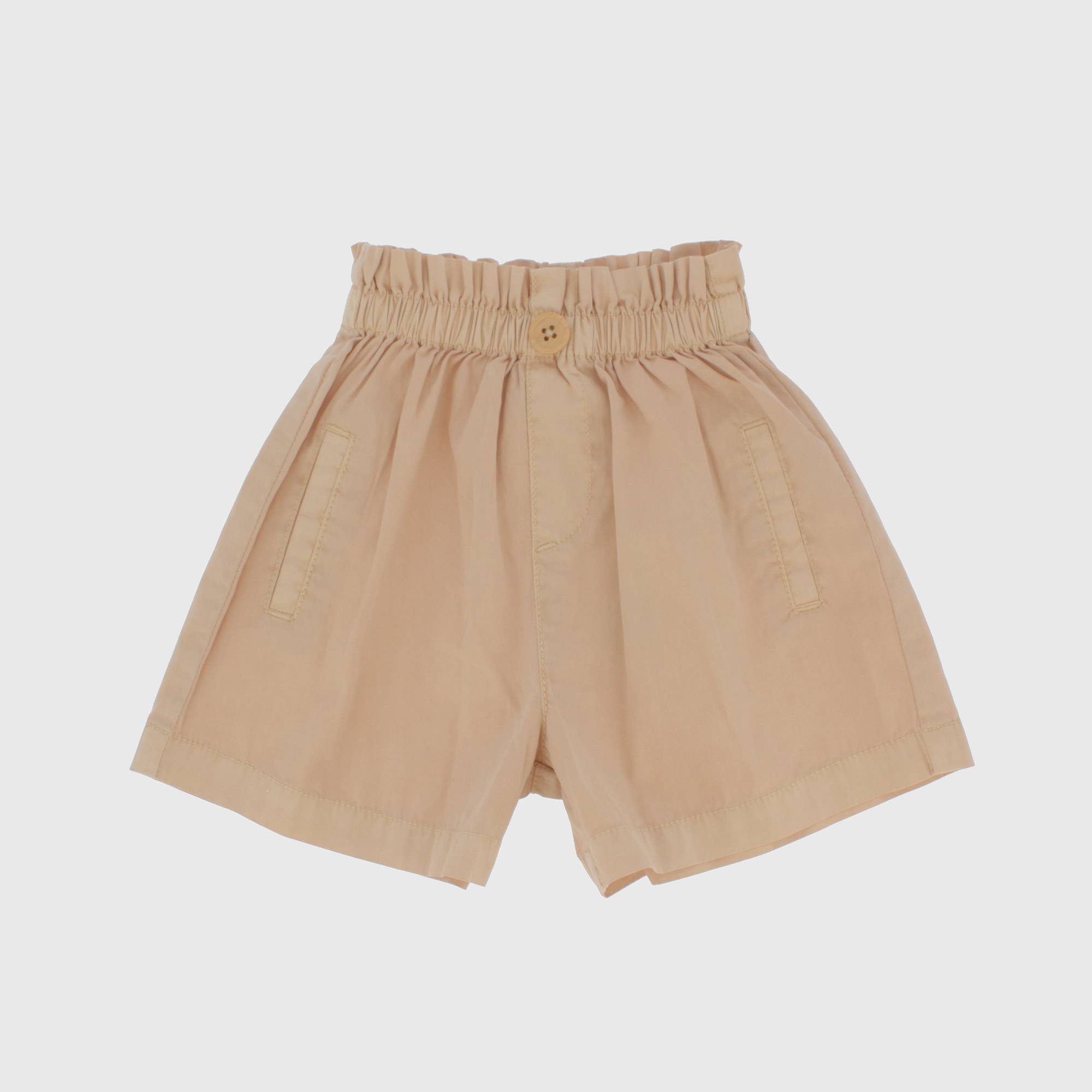 Poplin shorts "used" effect with elasticated waist and wooden button. Fake welt pockets on the front.