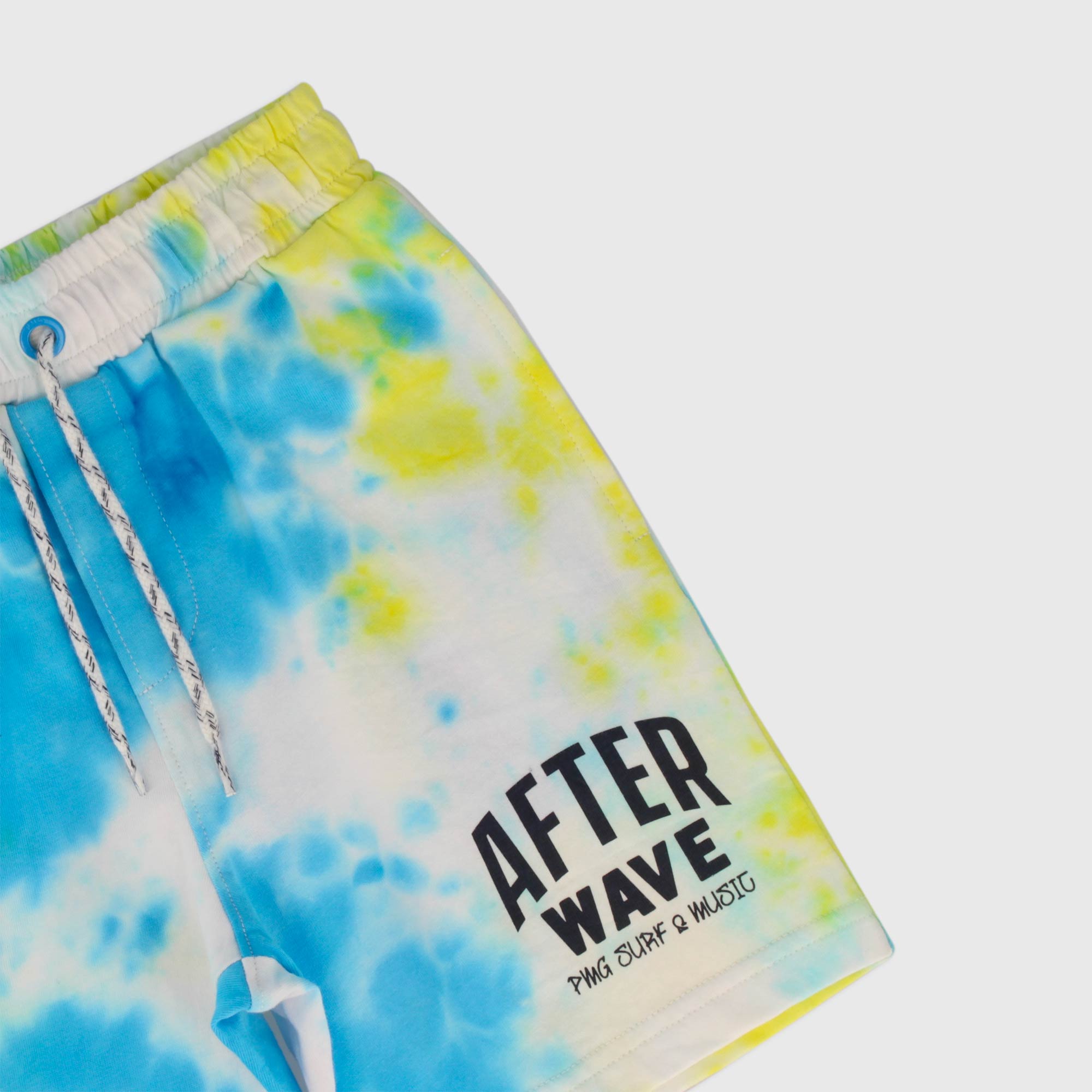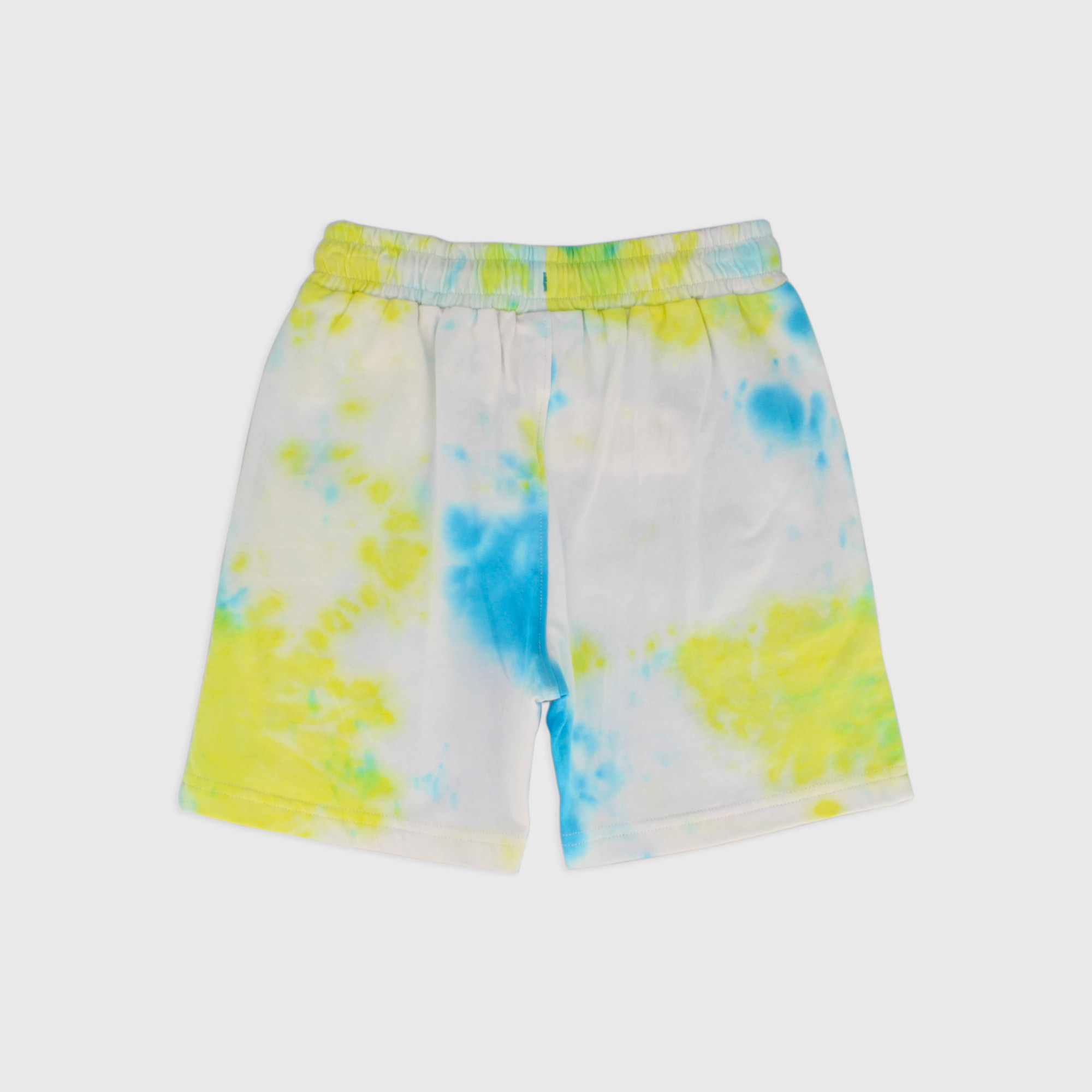 Tye-dye jersey shorts with elasticated waist and front laces. Retractable side pockets. Small print on the front.