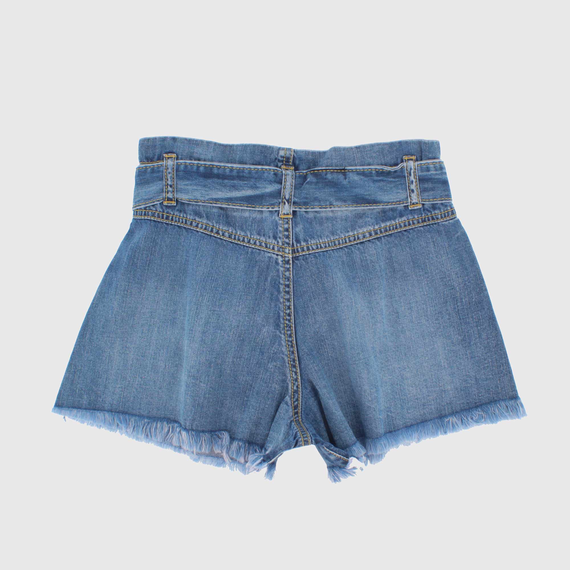 Denim shorts with elasticated waist paper bag model. Adjustable waist inside and closure with snap button and zip on the front. Denim ribbon at the waist. front pockets and fringed hem.