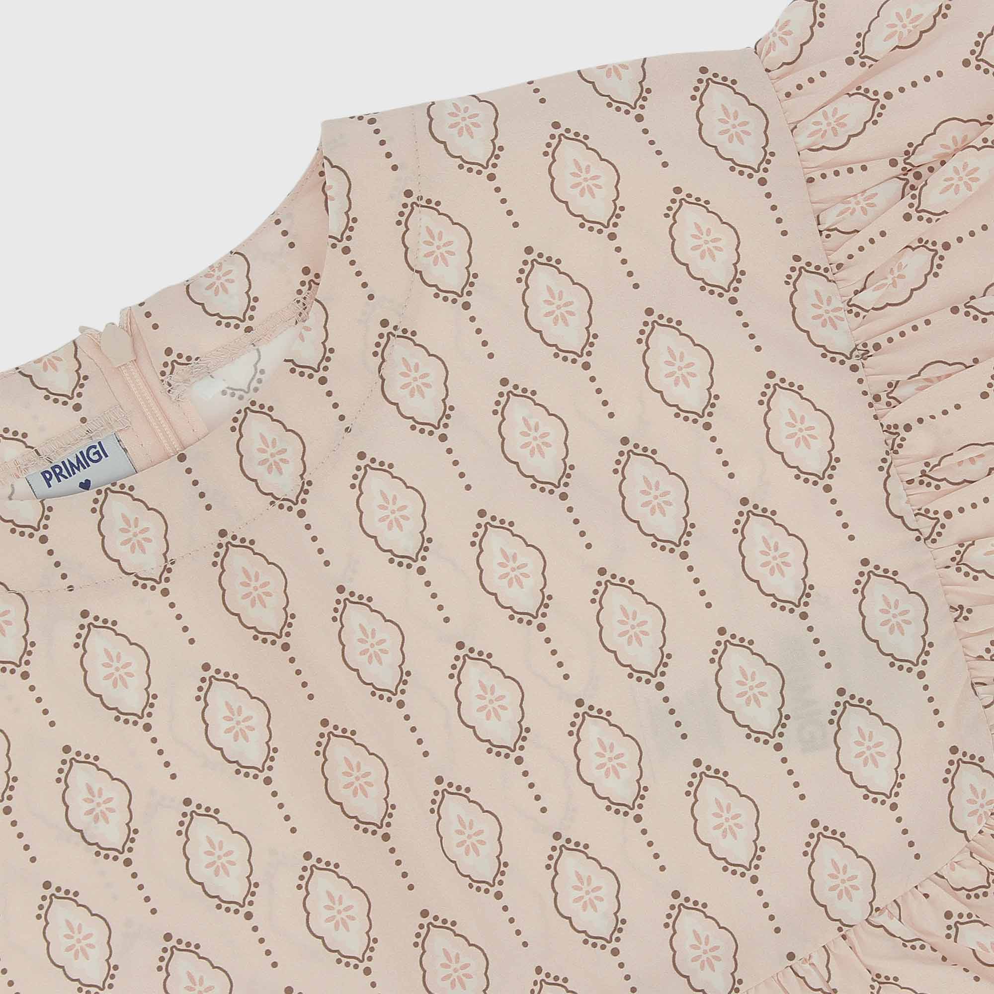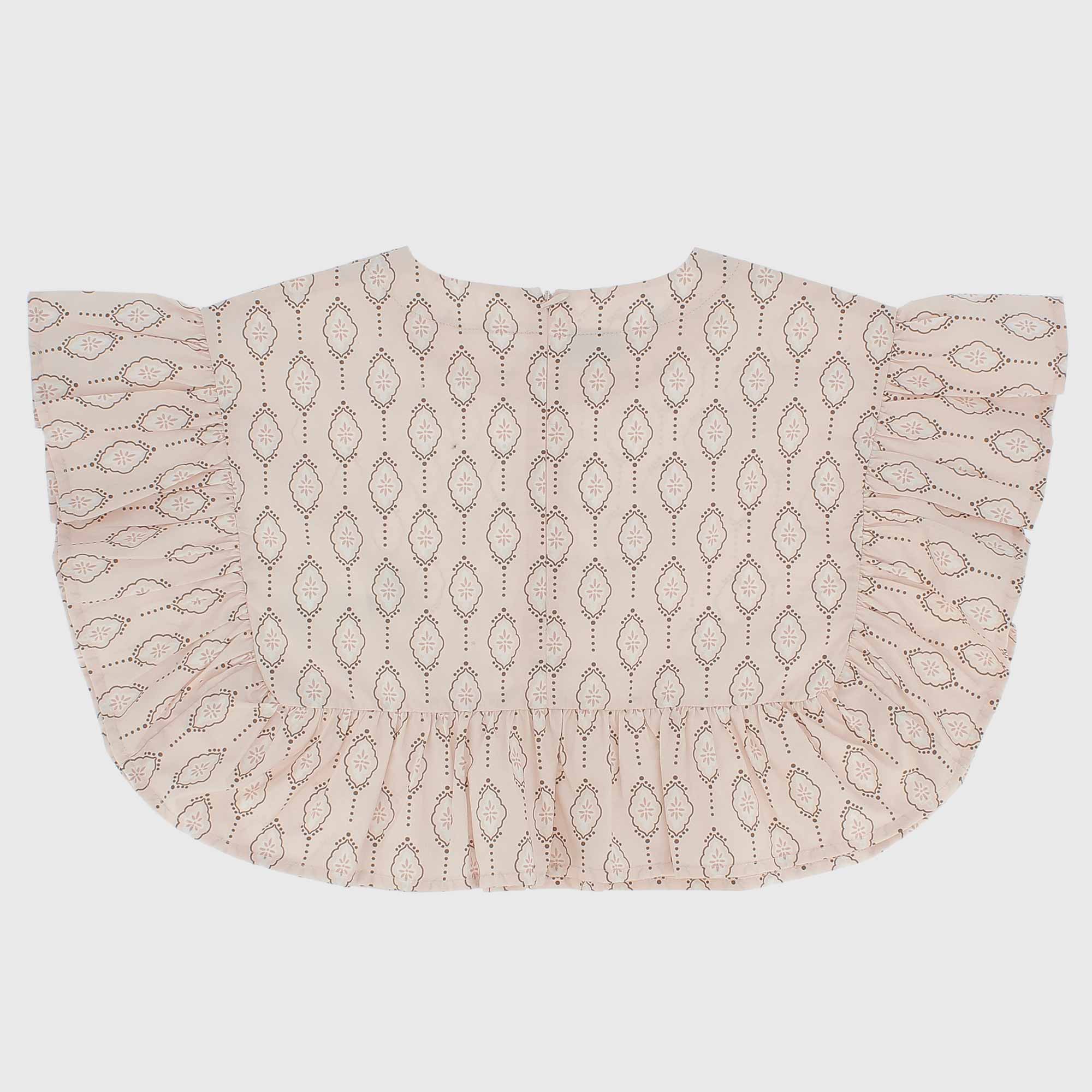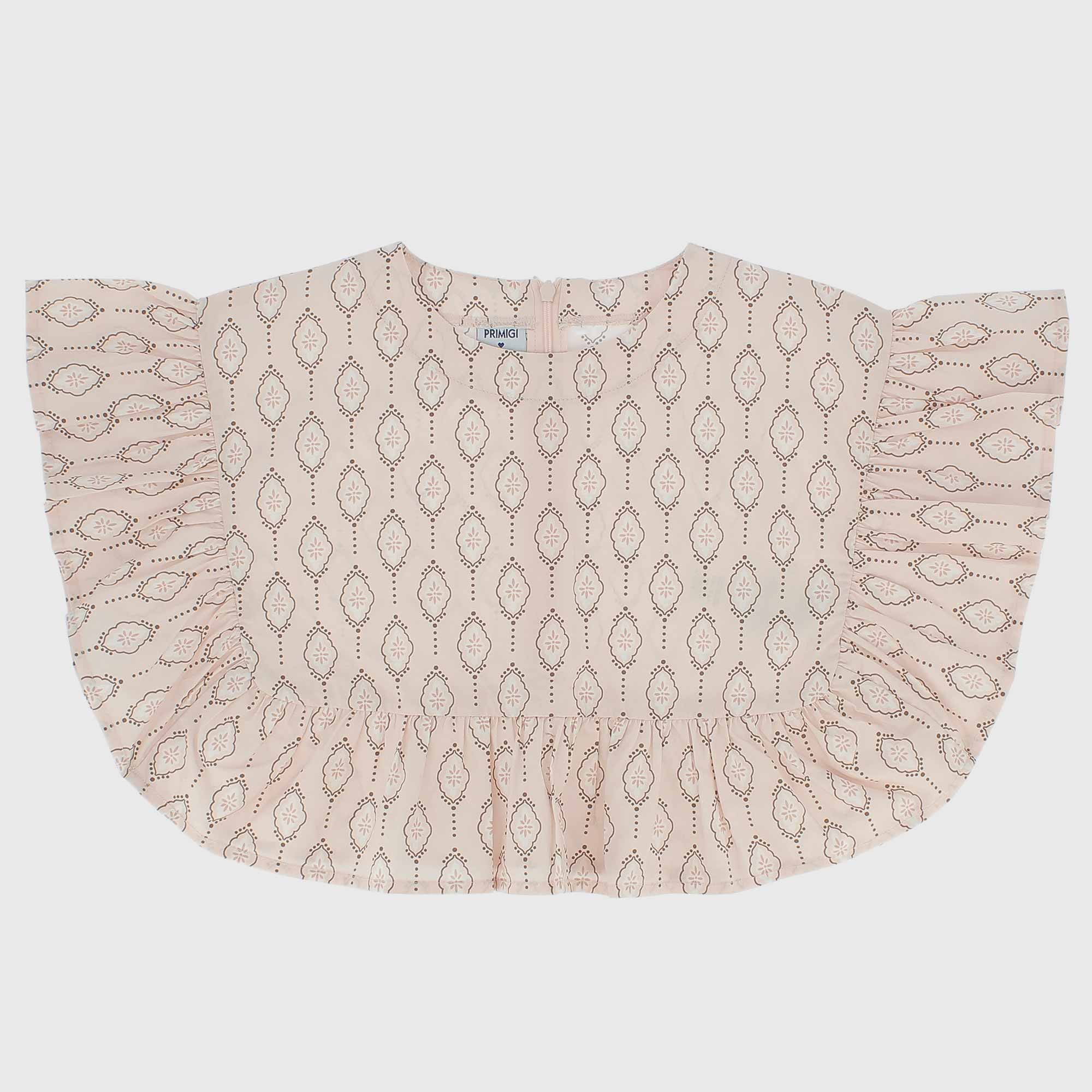 Printed cotton blouse with front and back ruffles. Back zip closure.