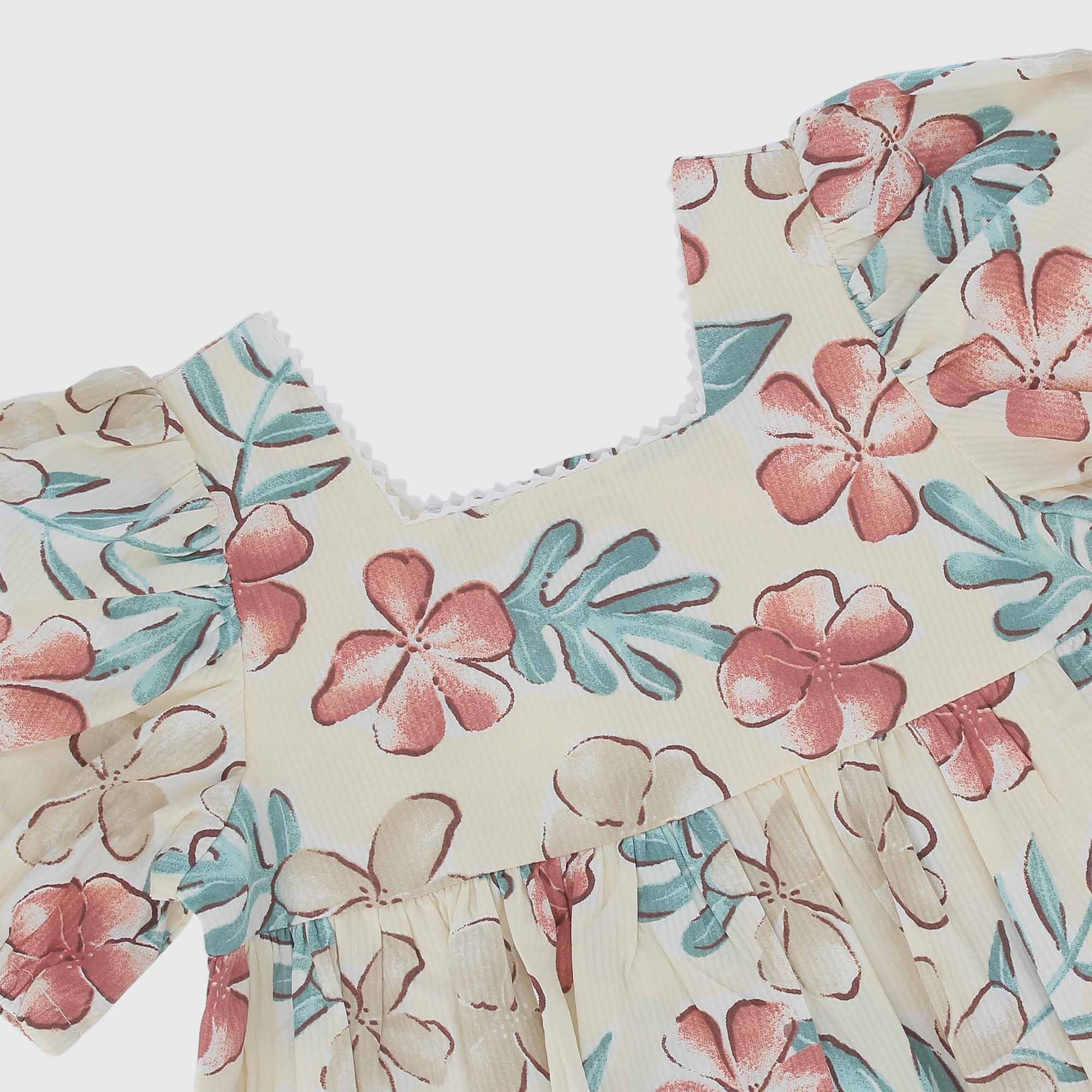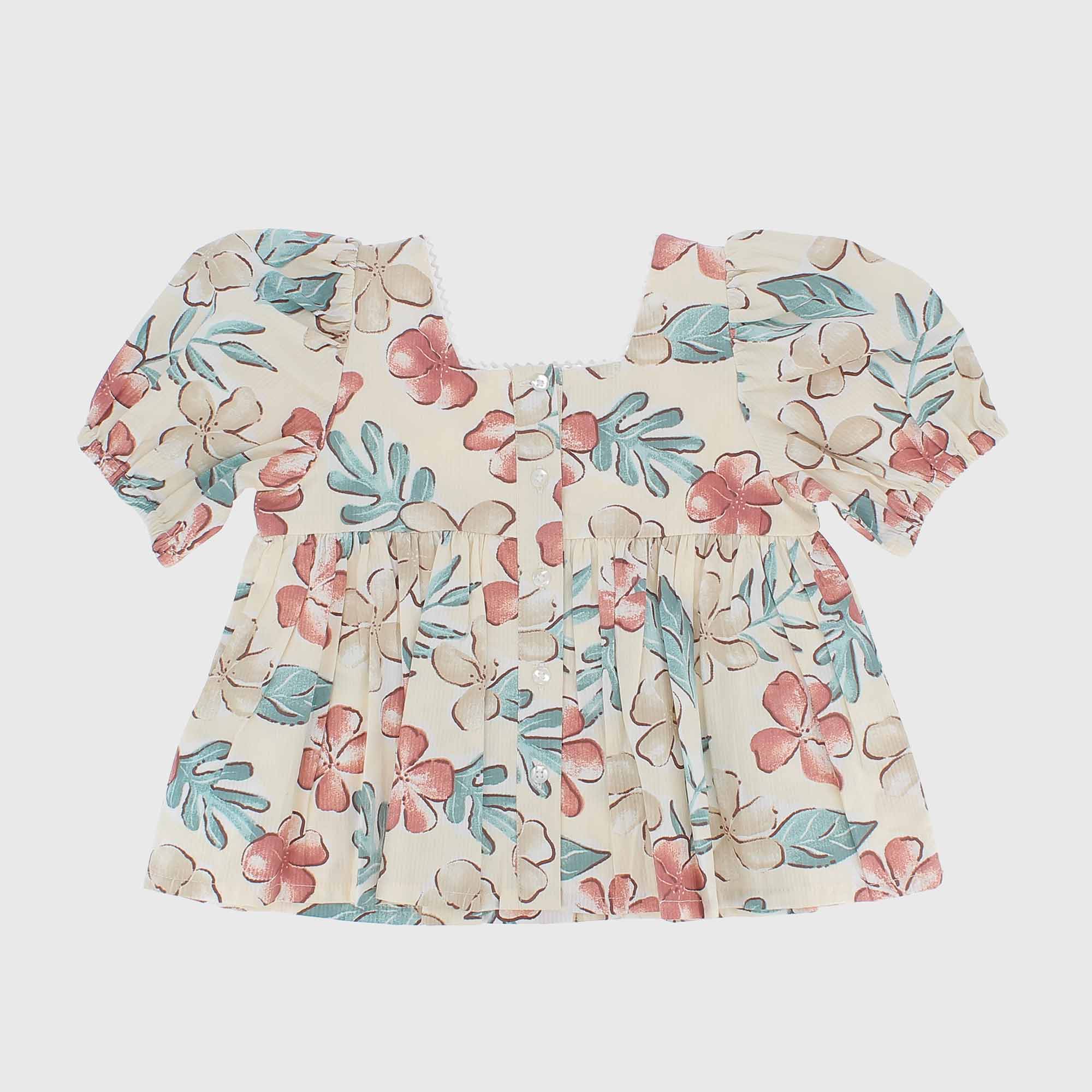 Printed cotton blouse with square neckline and balloon short sleeves. Back closure with buttons.