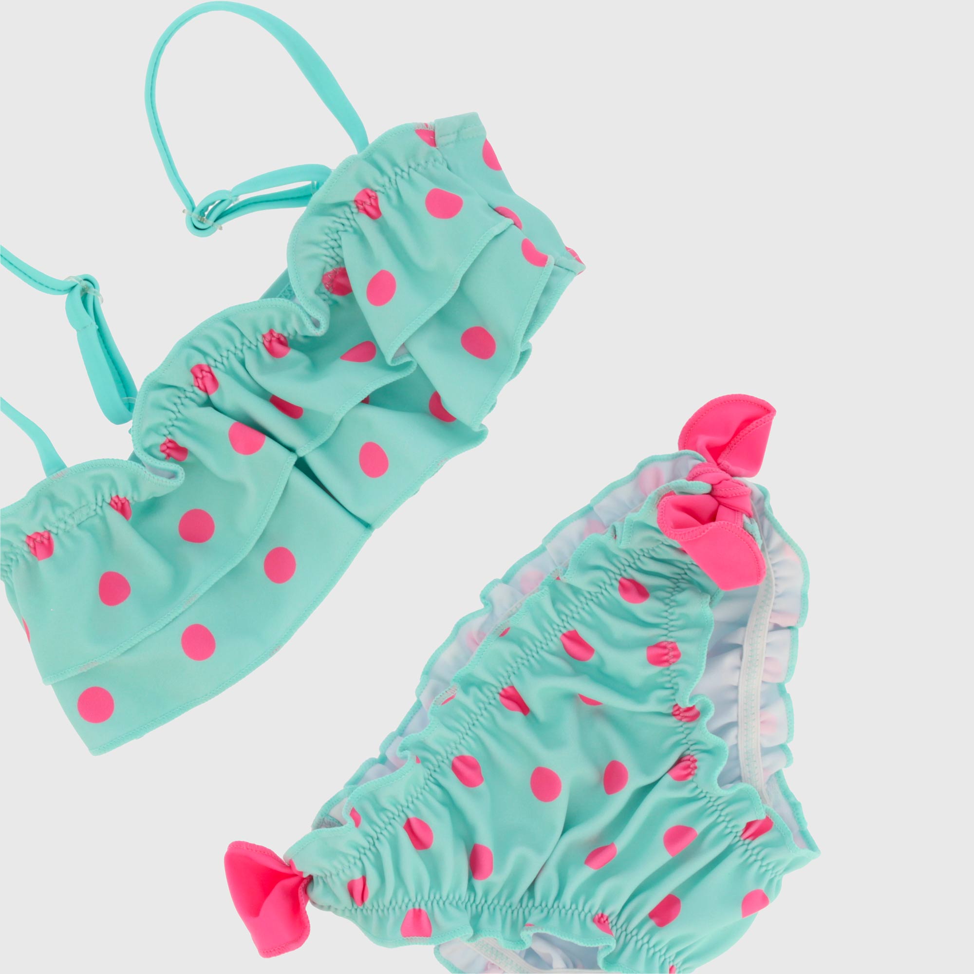 Printed bikini with matching top and briefs. Top with thin straps and ruffles on the front. Briefs with bows at the waist.
