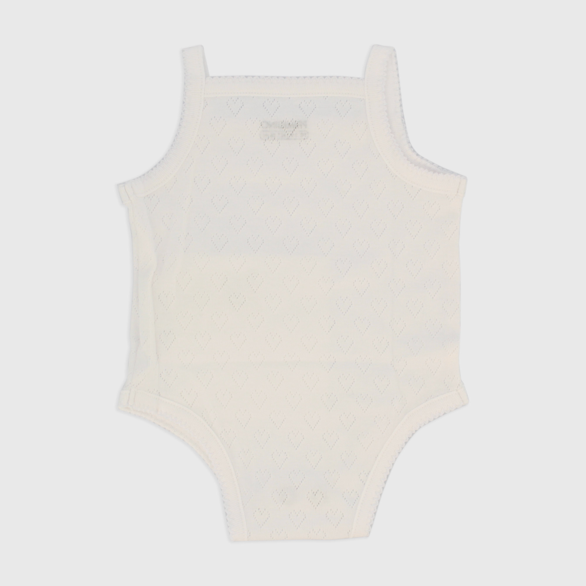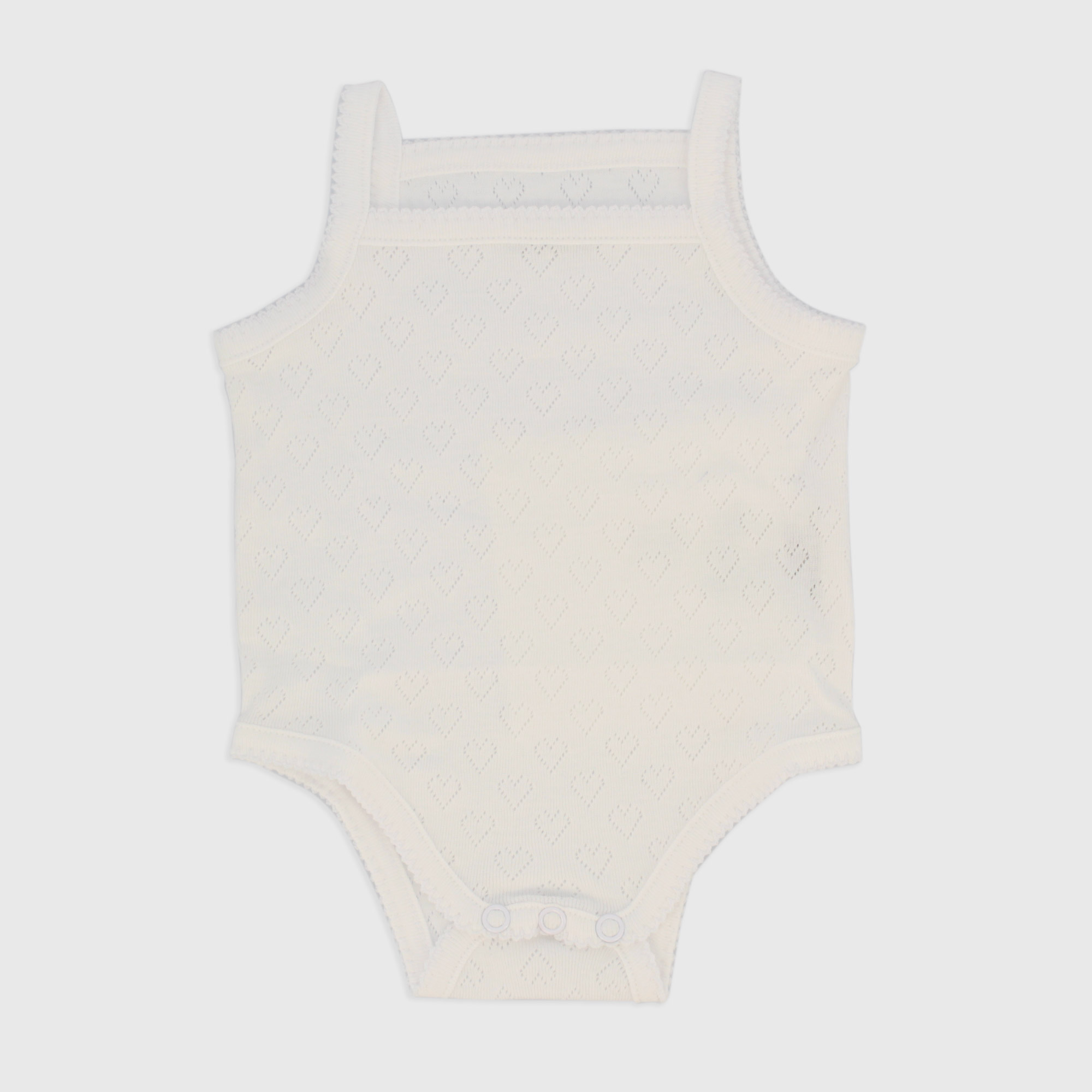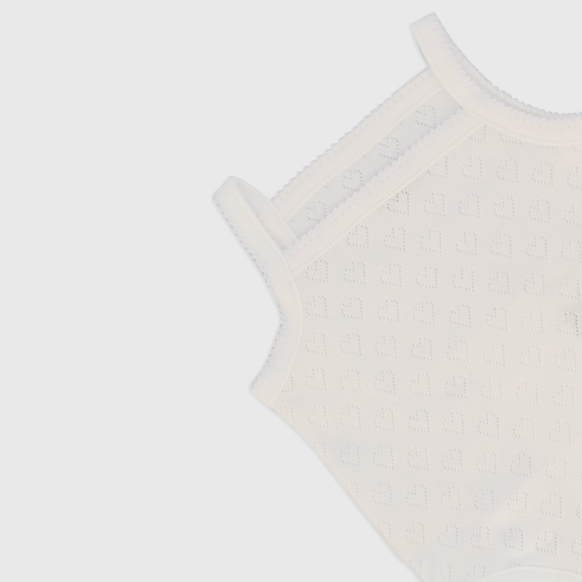 Ribbed body with square collar and thin straps. Snap button closure on the bottom.