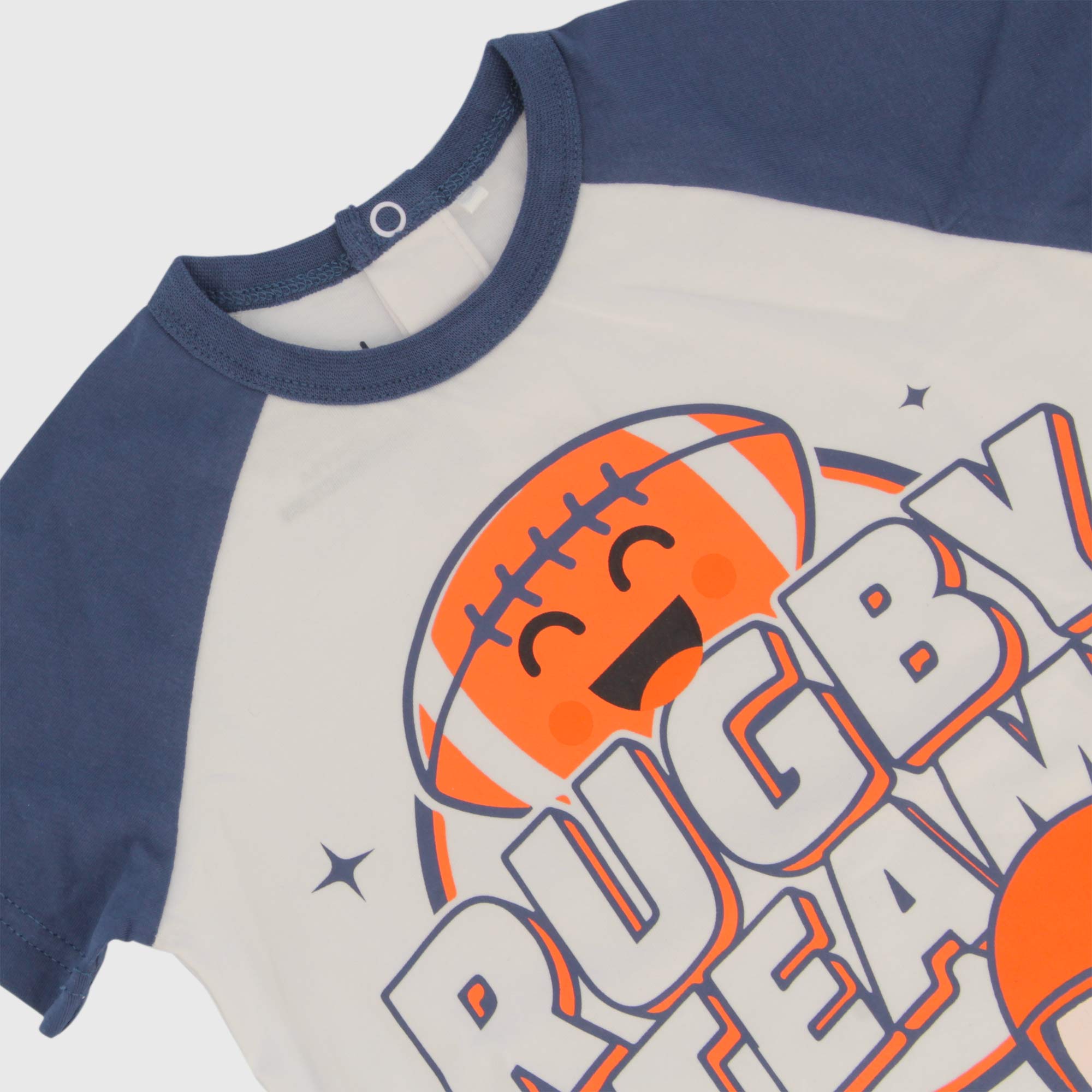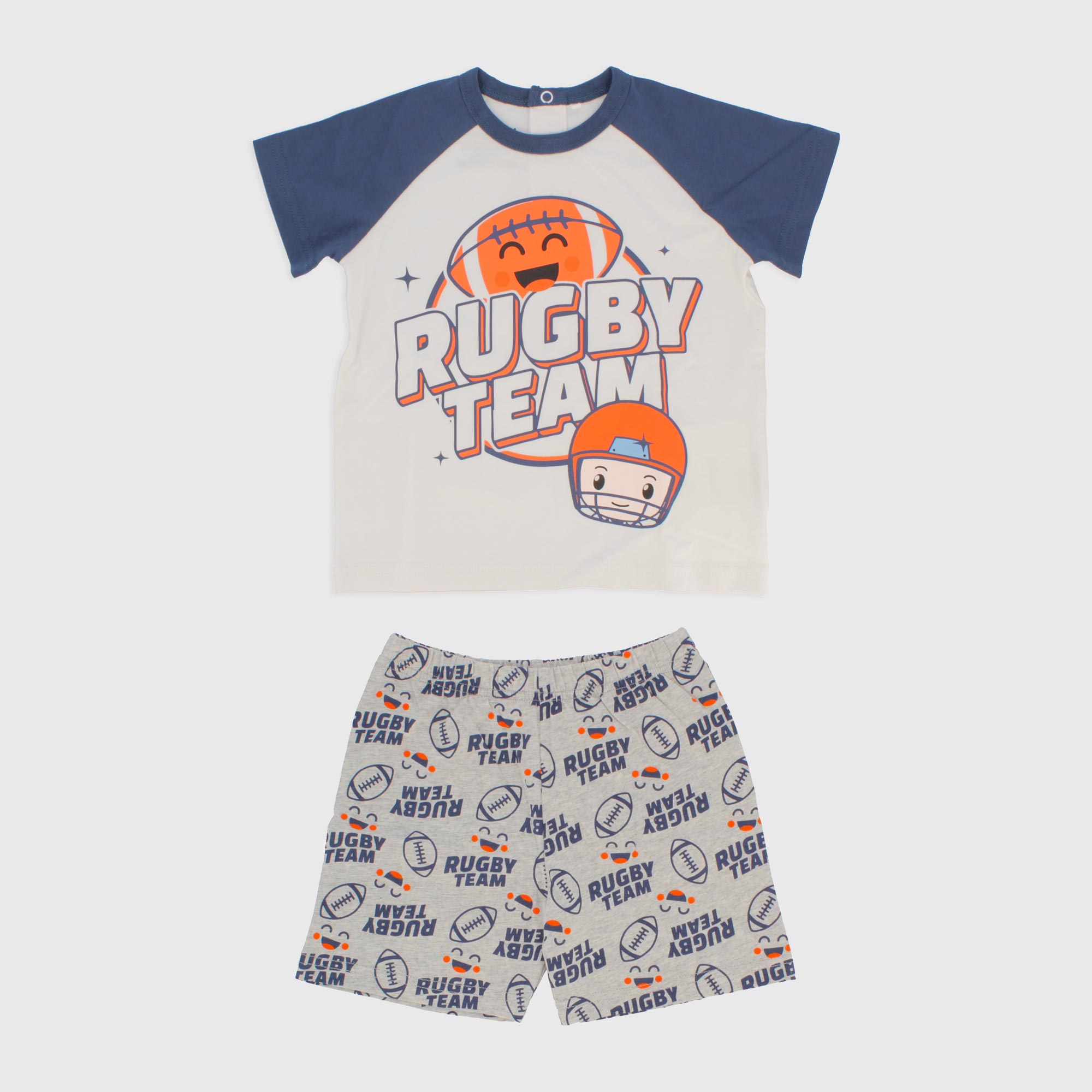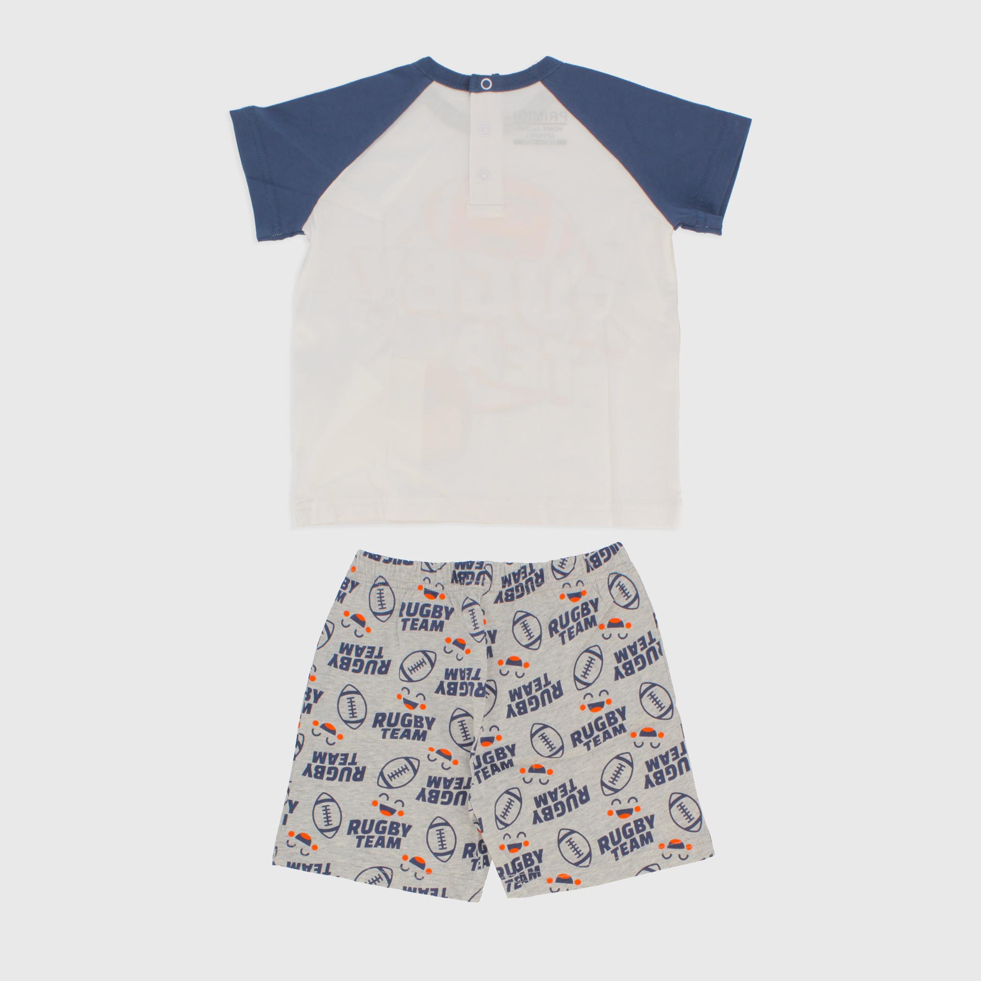 Complete jersey pajamas. Crew-neck shirt with short sleeves, back closure with snap buttons. Print on the front. Bermuda shorts with elasticated waist. All over printing.