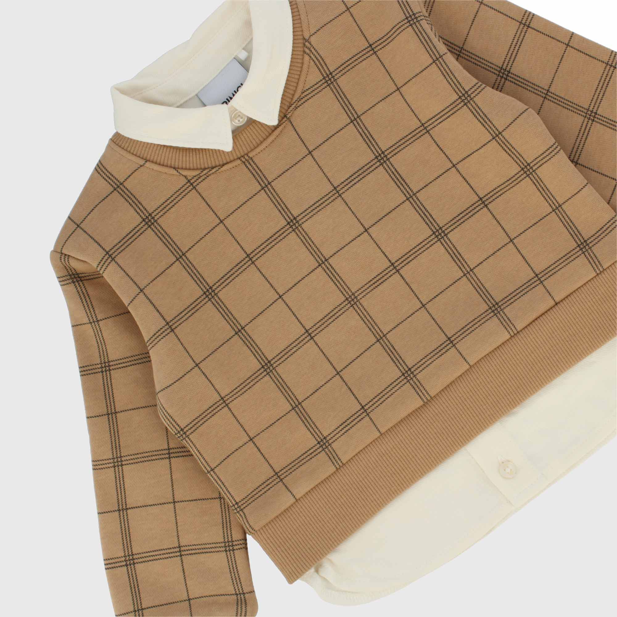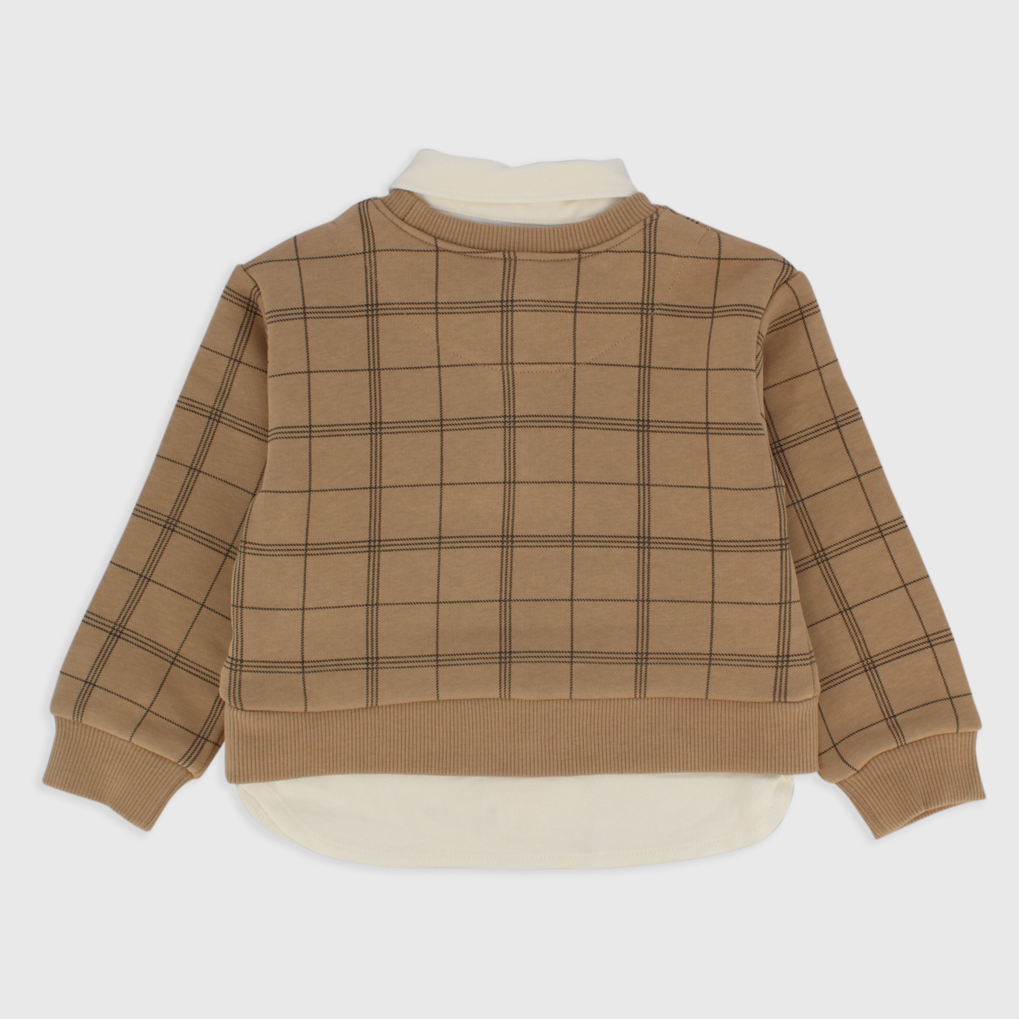Crewneck sweatshirt with long sleeves. Fake shirt applied underneath. All over print. Ribbed cuffs and bottom.