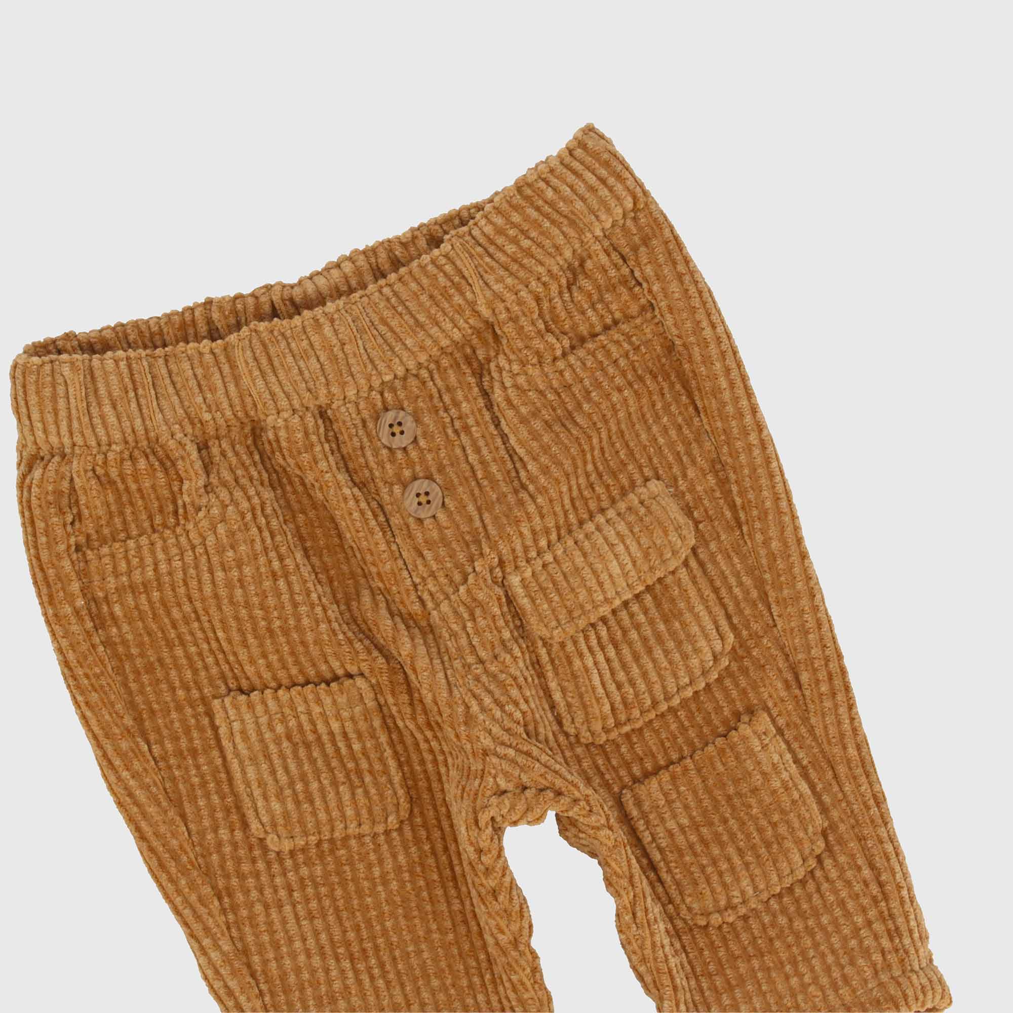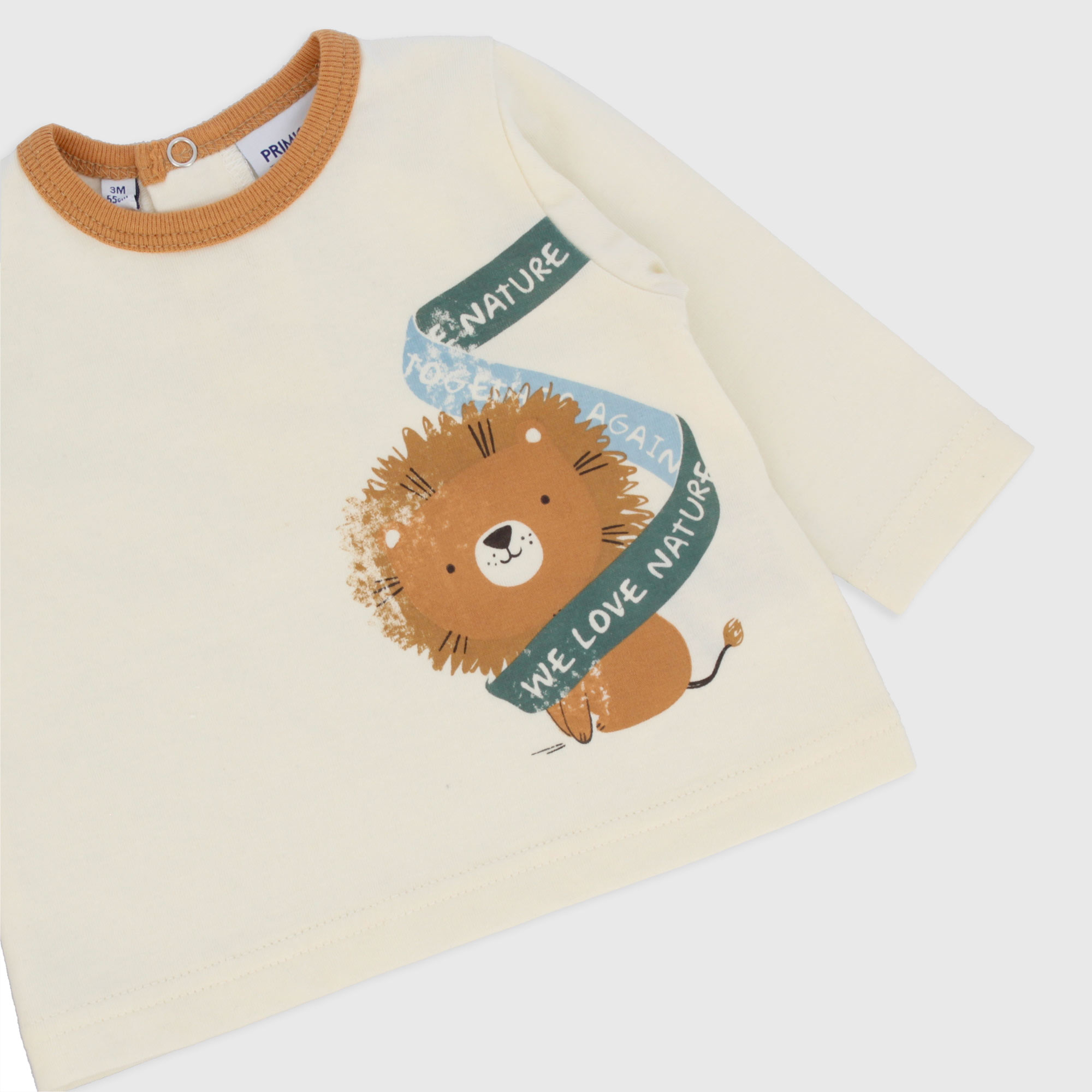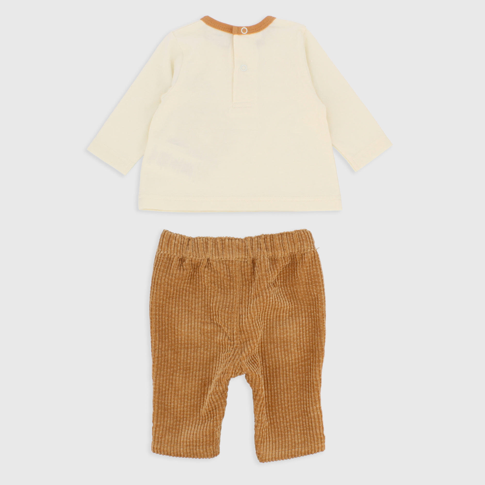 Two-piece suit. Crew neck, long sleeved jersey T-shirt. Back closure with snap buttons. Print on the front. Corduroy trousers, with elasticated waist, buttons and pockets on the front.