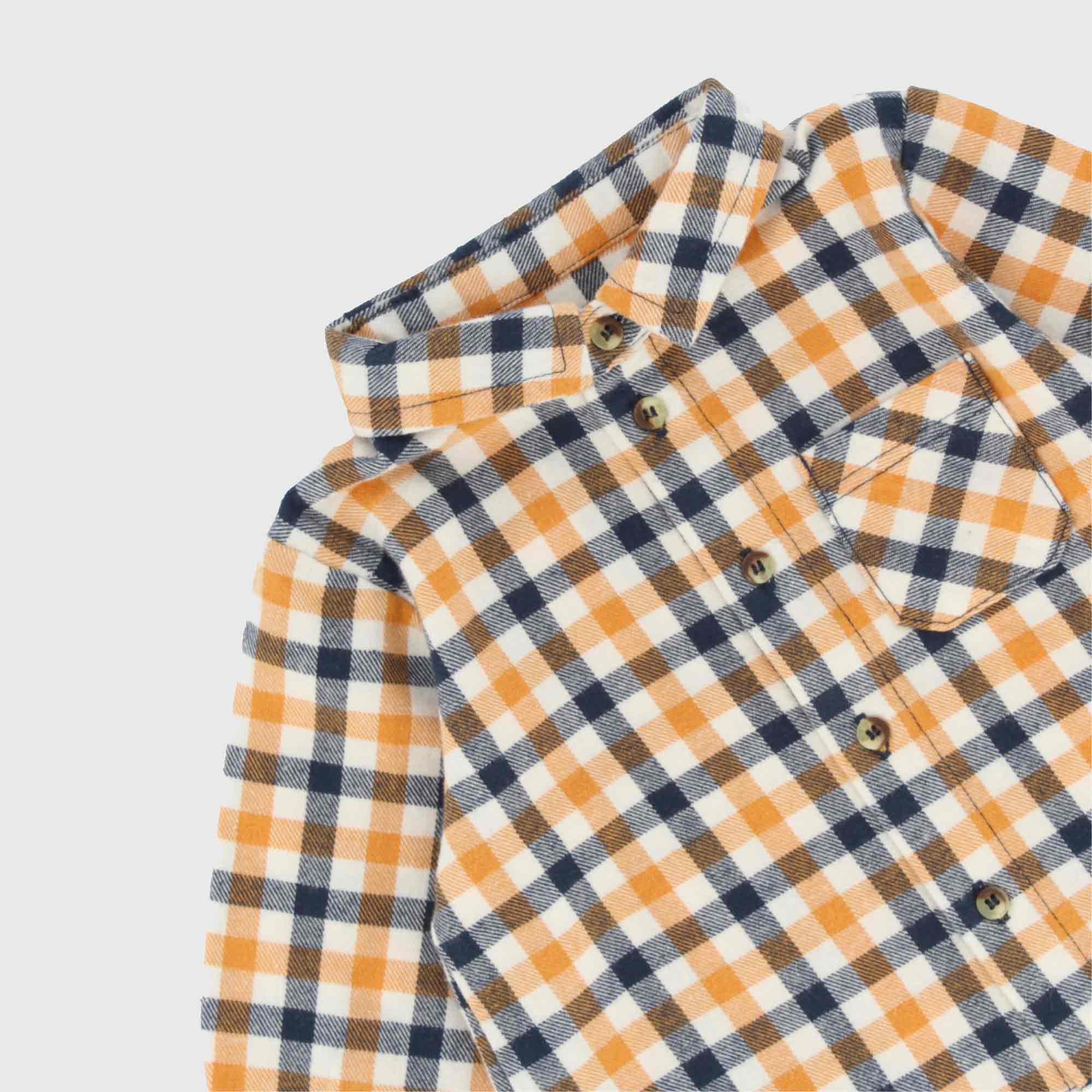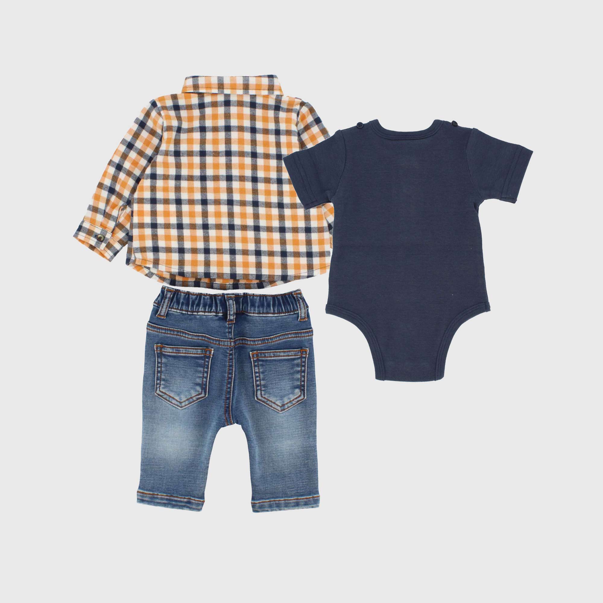Three piece set. Checked flannel shirt, long sleeves. Chest pocket. Seraph bodysuit with short sleeves. Jeans with elasticated waist and back patch pockets.