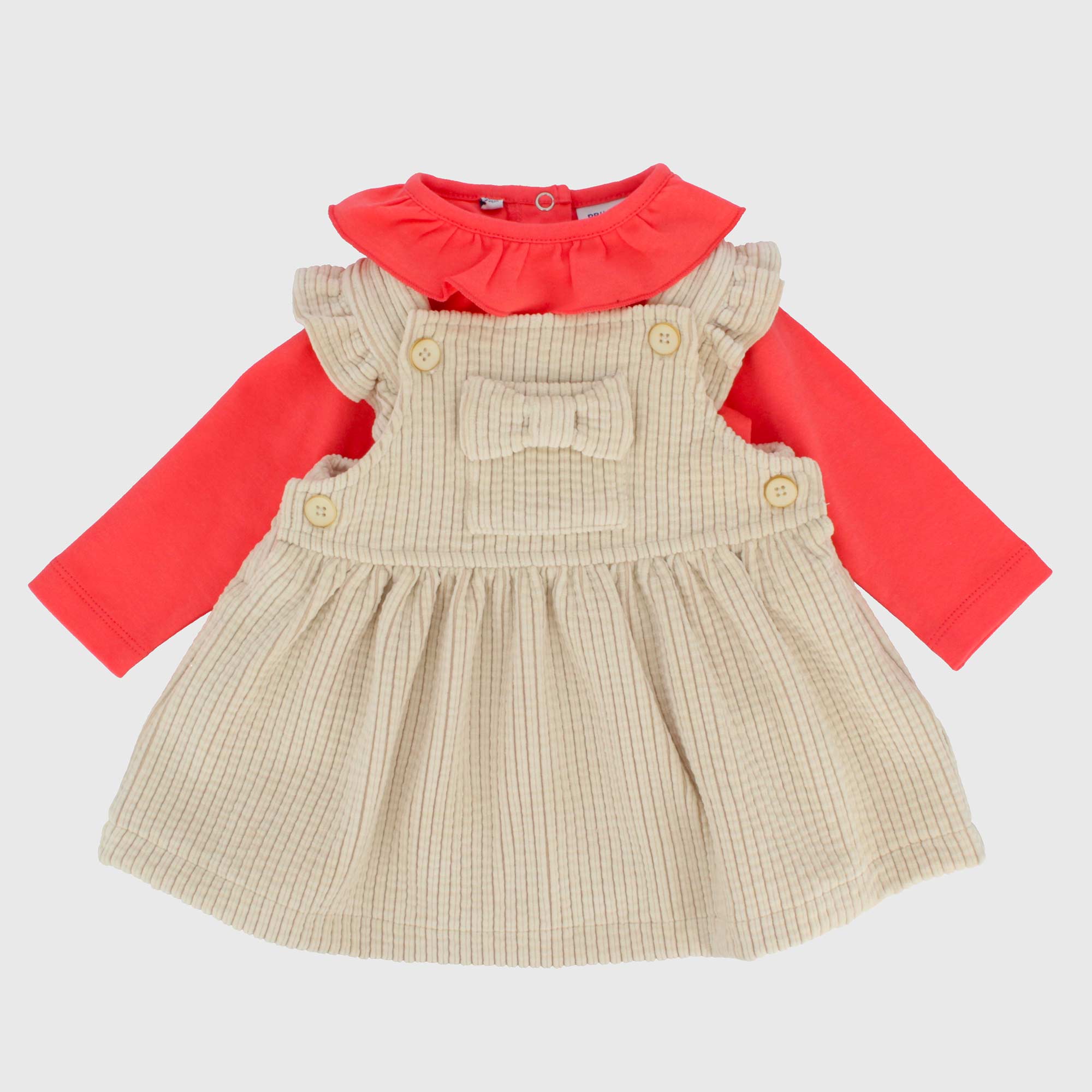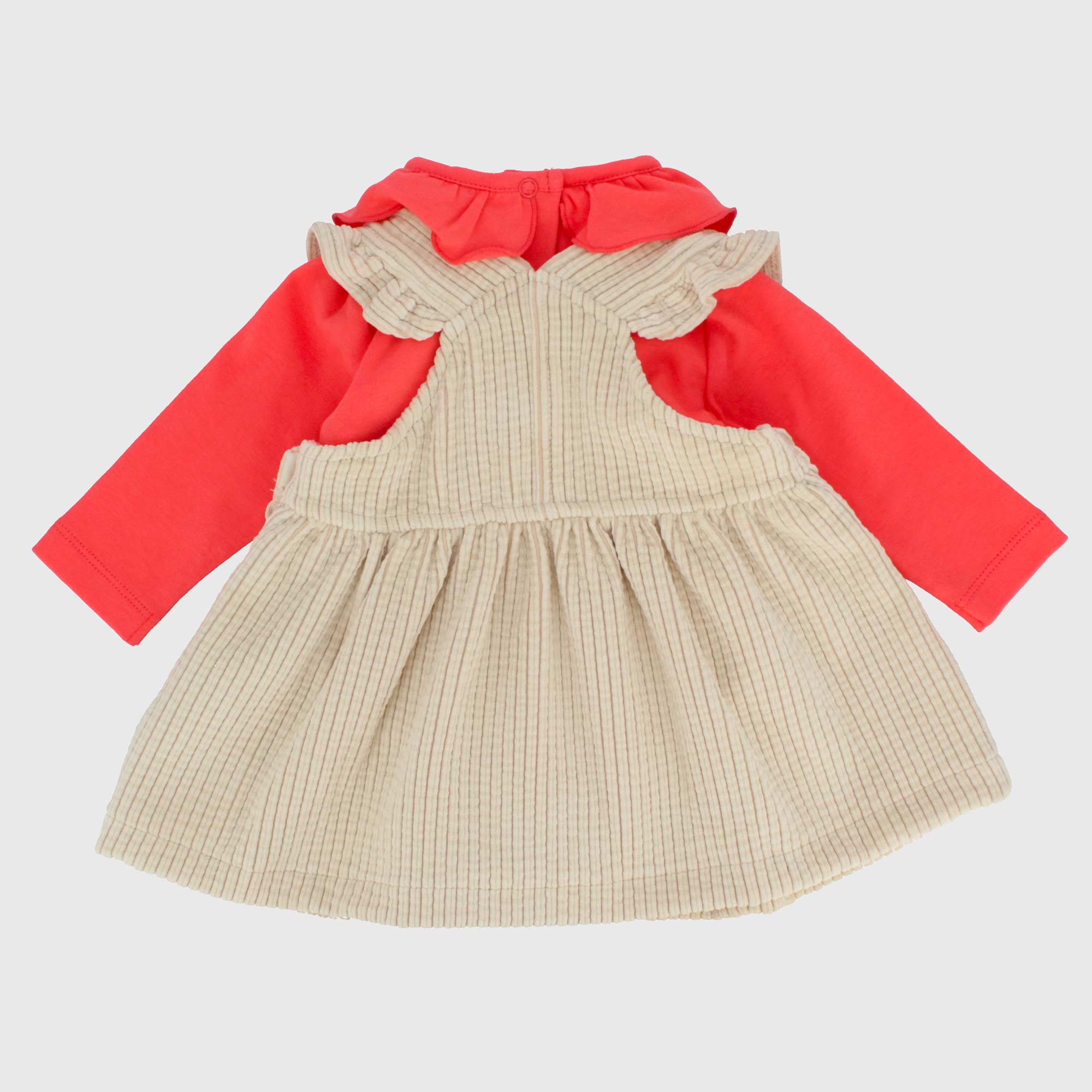 Two-piece suit. Body in warm cotton with collar with frills, long sleeves. Closing with automatic buttons on the back. Corduroy skirt dungarees. Button closure on shoulders and side. Pocket and bows applied on the front. Volants on the suspenders.