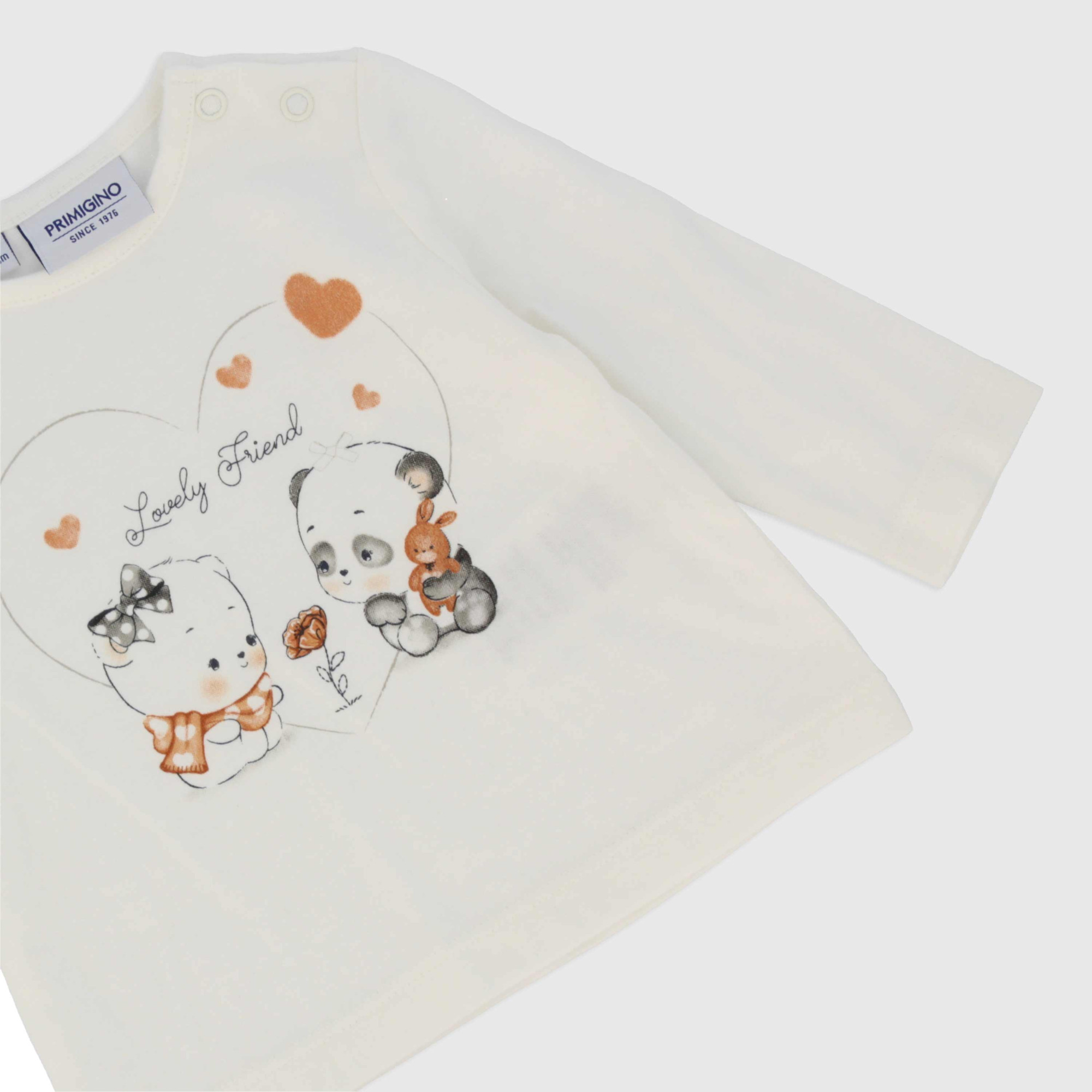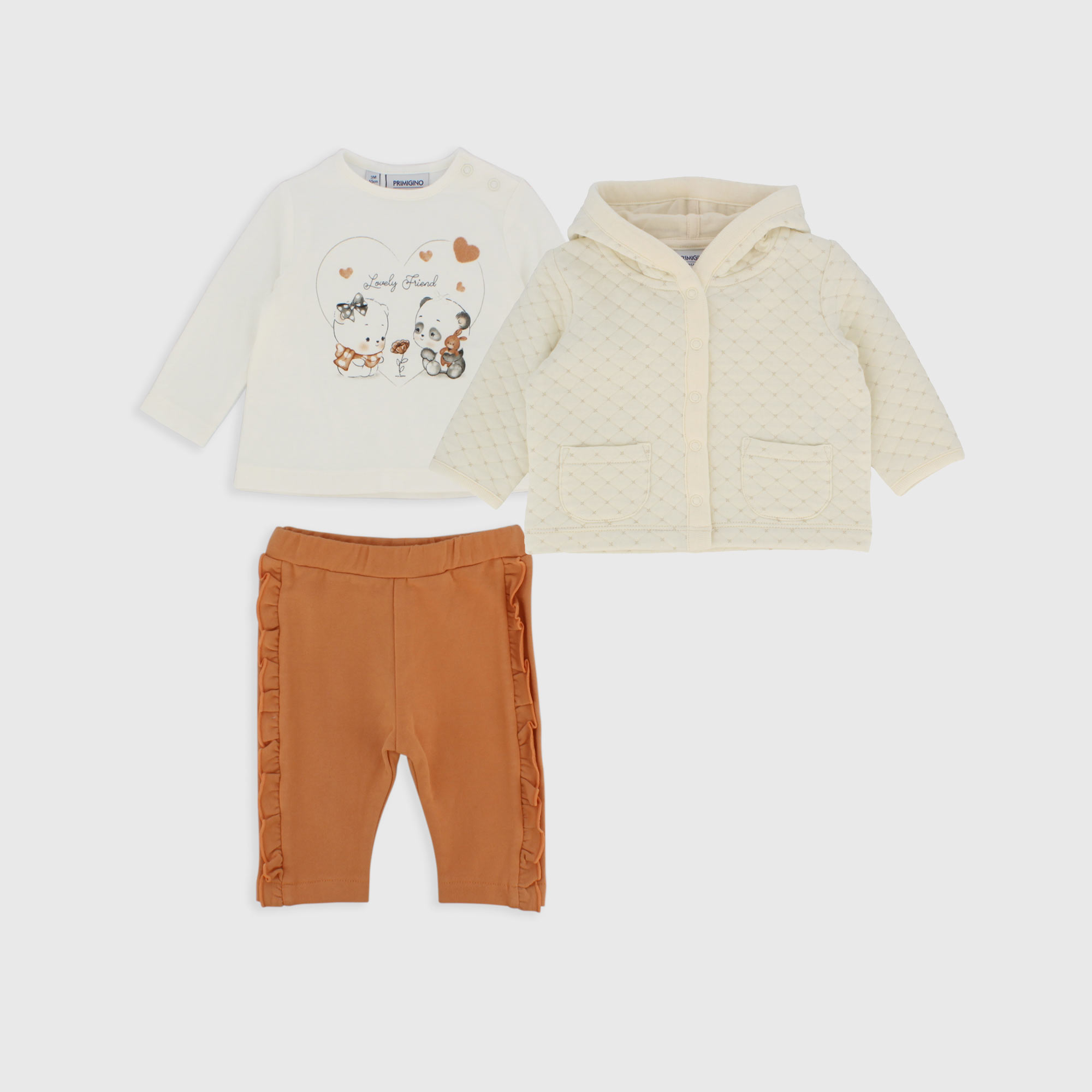 Three piece set. Open quilted sweatshirt with hood, long sleeves. Closing with automatic buttons on the front. Patch pockets. Crew neck, long sleeved jersey T-shirt. Closing with automatic buttons on the shoulder. Print on the front. Fleece trousers, with elasticated waist and side flounces.