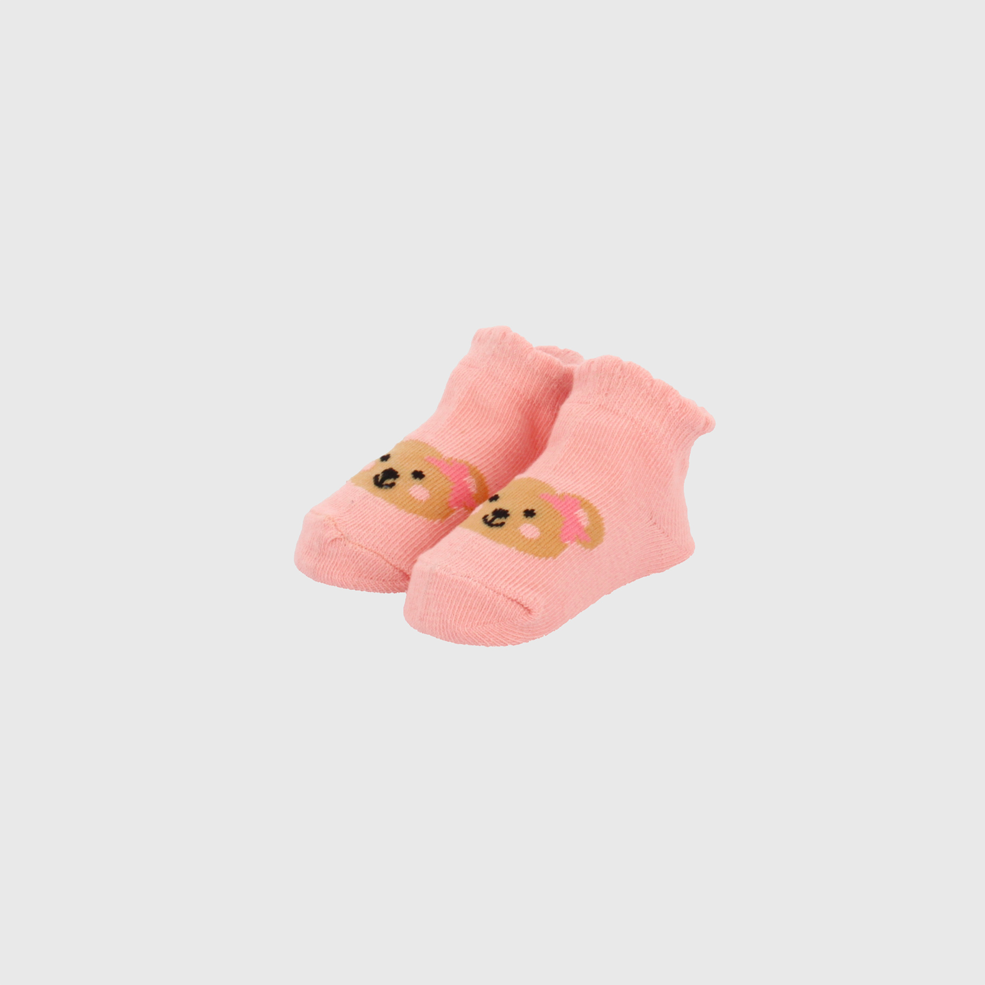 Newborn socks with teddy bear motif and scalloped hem. Elasticated edge.