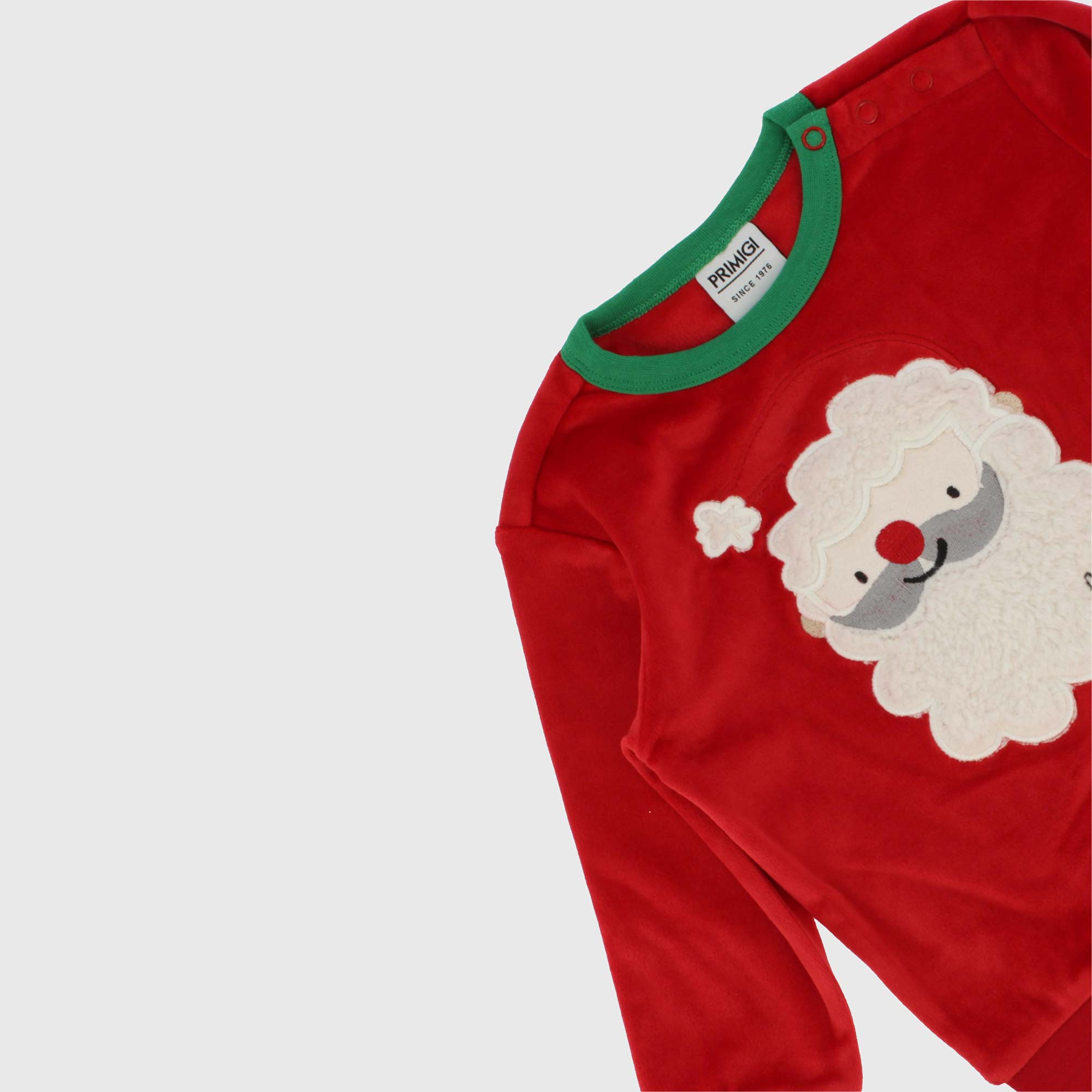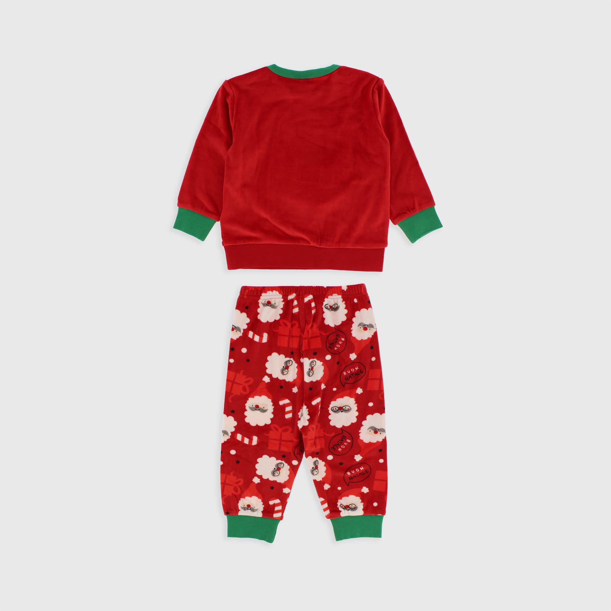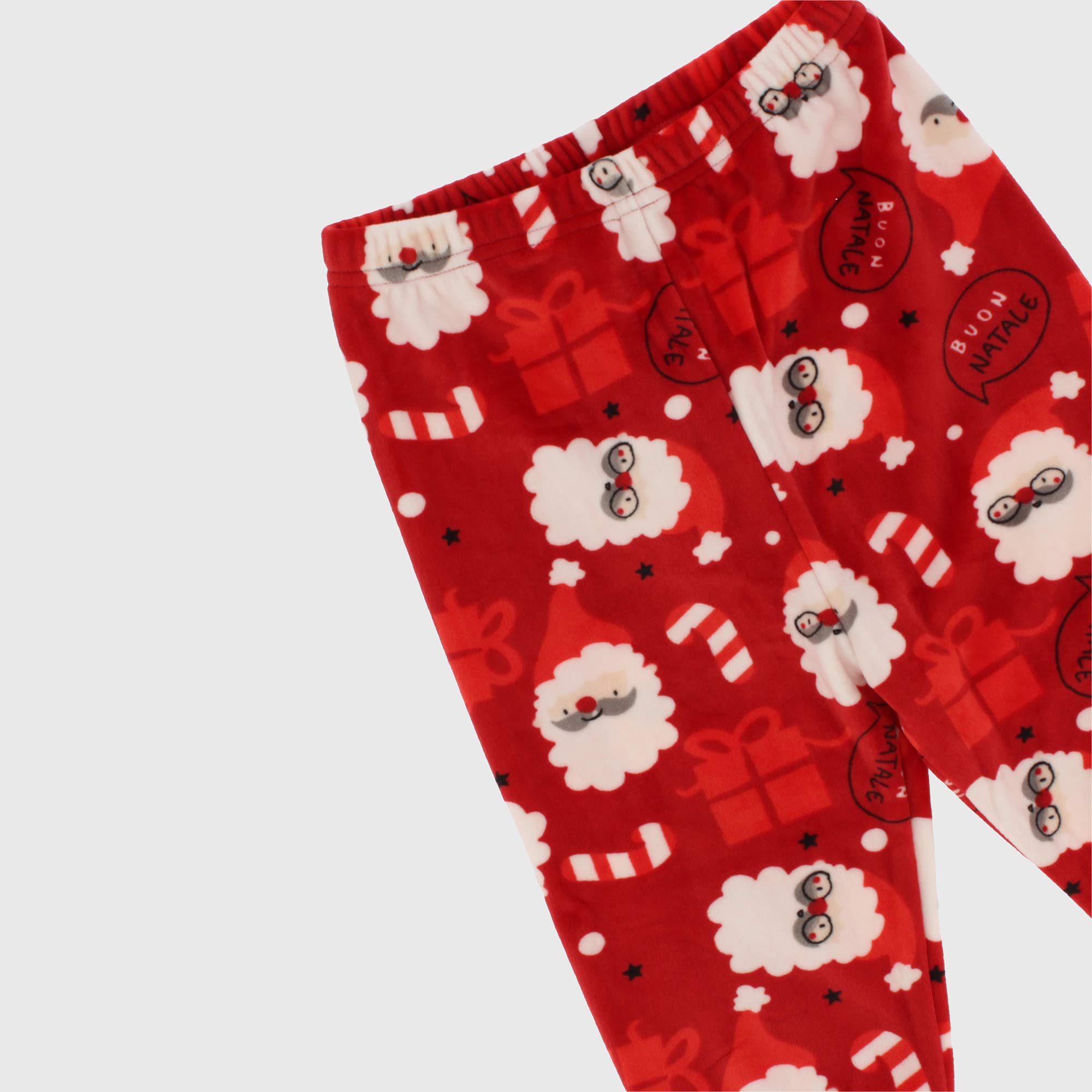 Fleece pajama set. Round-neck, long-sleeved shirt. Embroidery on the front and contrasting profiles. Closing with automatic buttons on the back. Trousers with elasticated waist and ribbed bottom. Santa Claus all-over print.