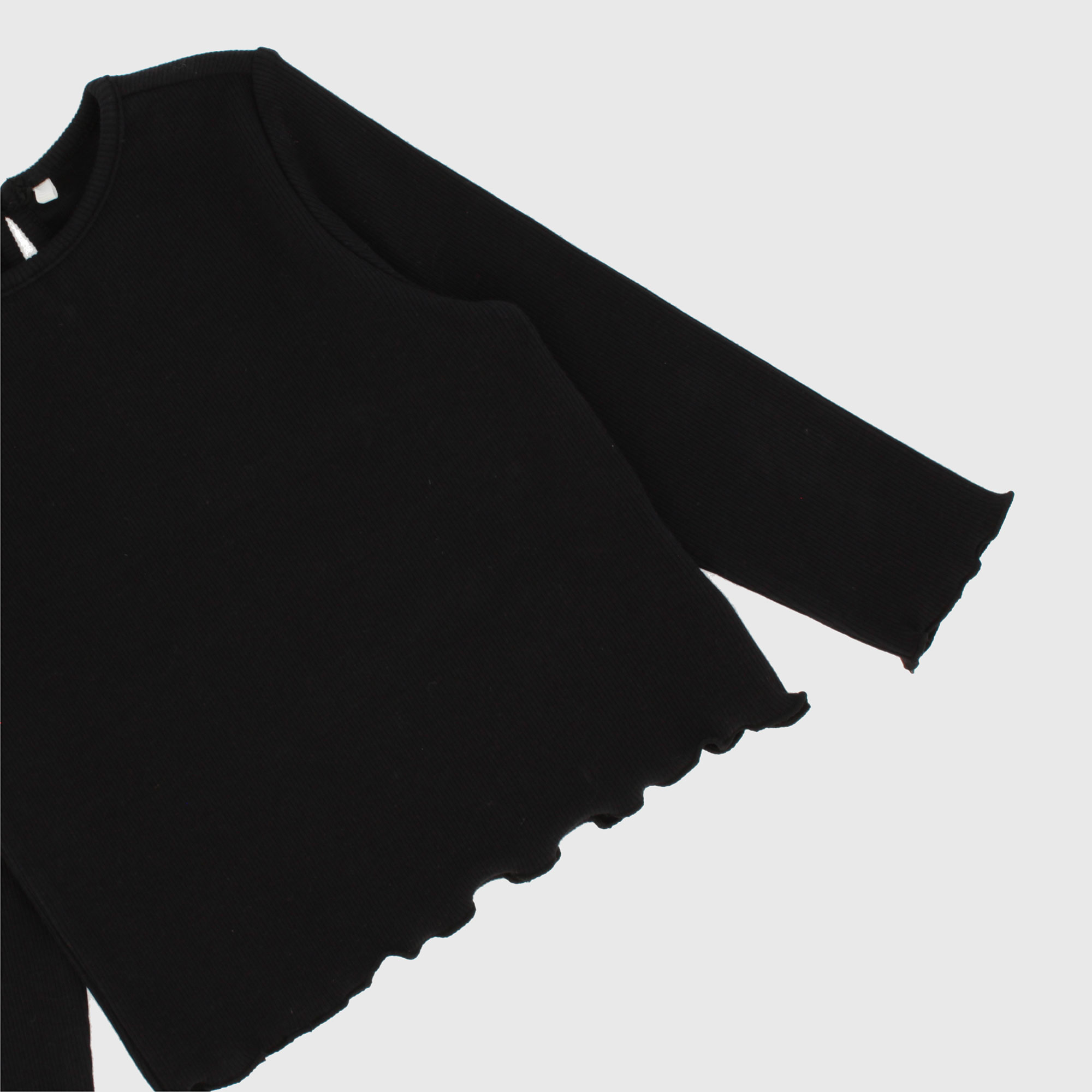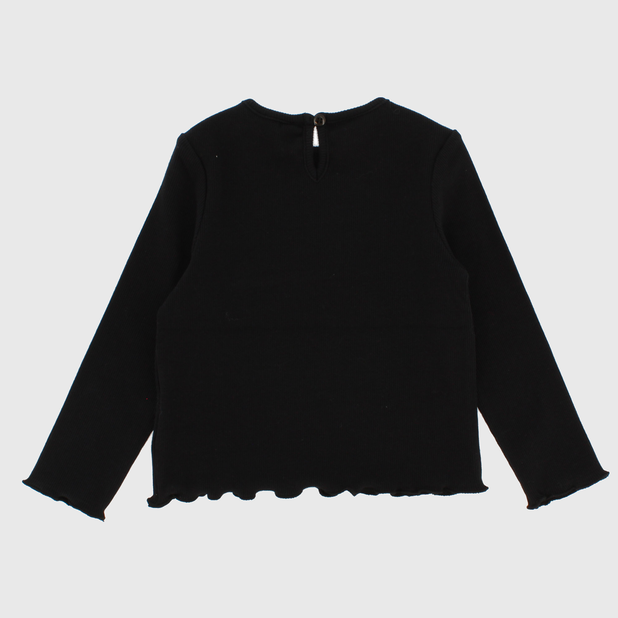 Ribbed, crew-neck, long-sleeved T-shirt. Teardrop closure with back button.