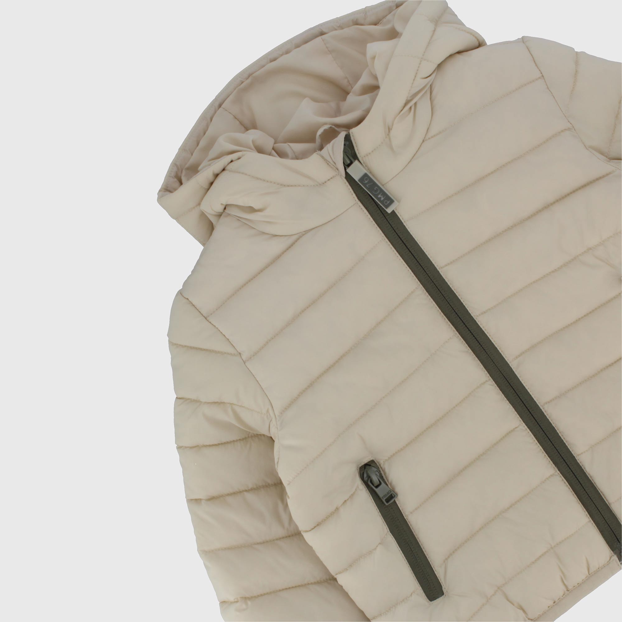 Quilted jacket in Nylon with cap, long sleeves. Contrasting zip on the front. Pockets with contrasting zip.