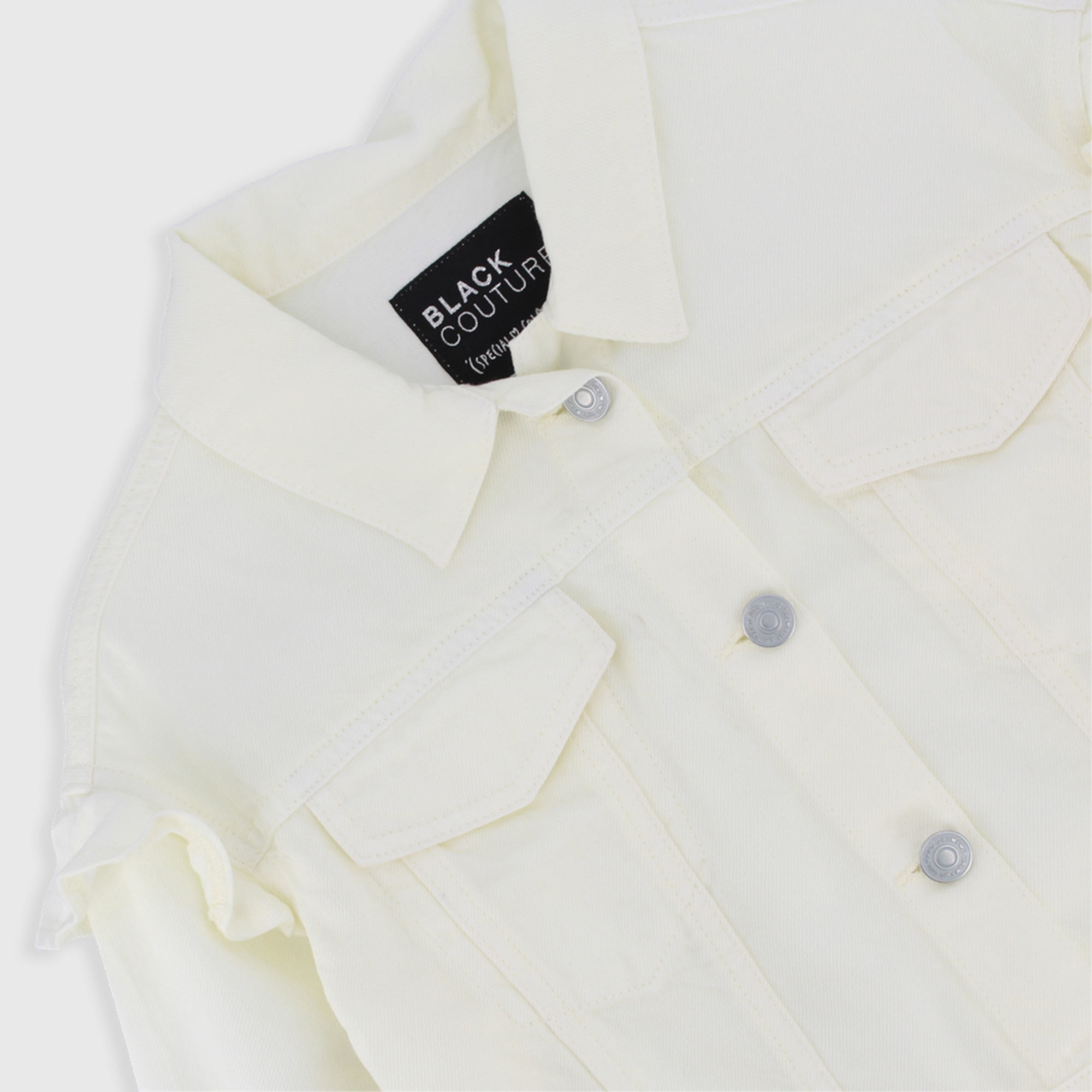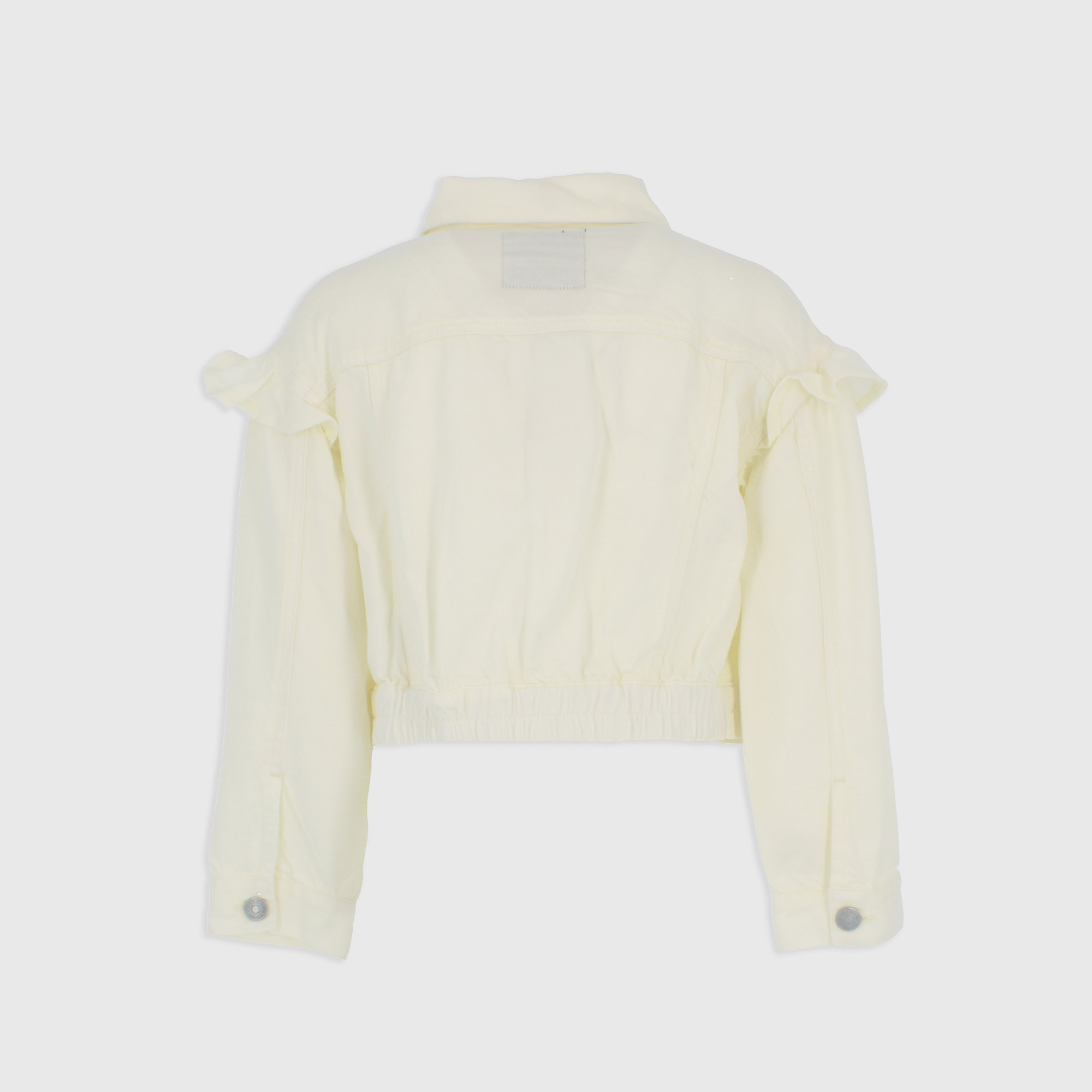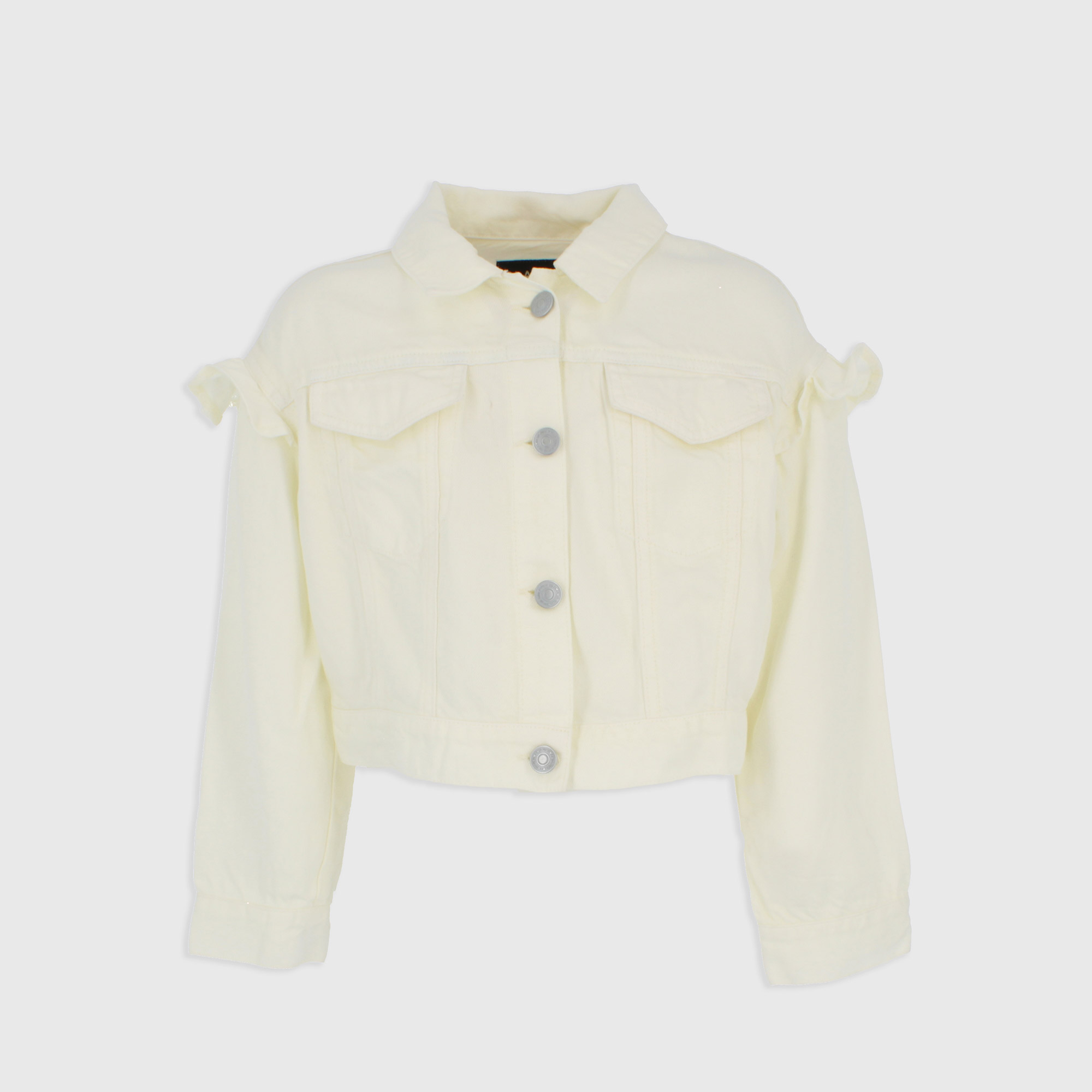Jacket in coton canvas, with collar, long sleeves. Closure on the front with buttons. Ruffles on the shoulders. Pockets with flap.