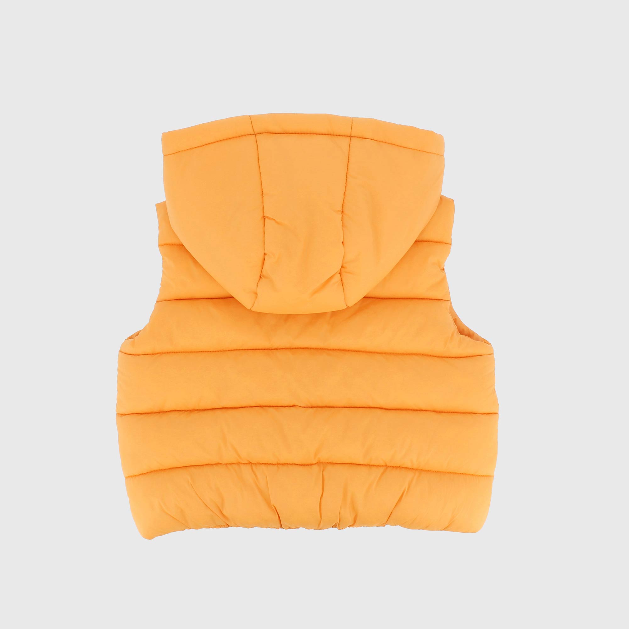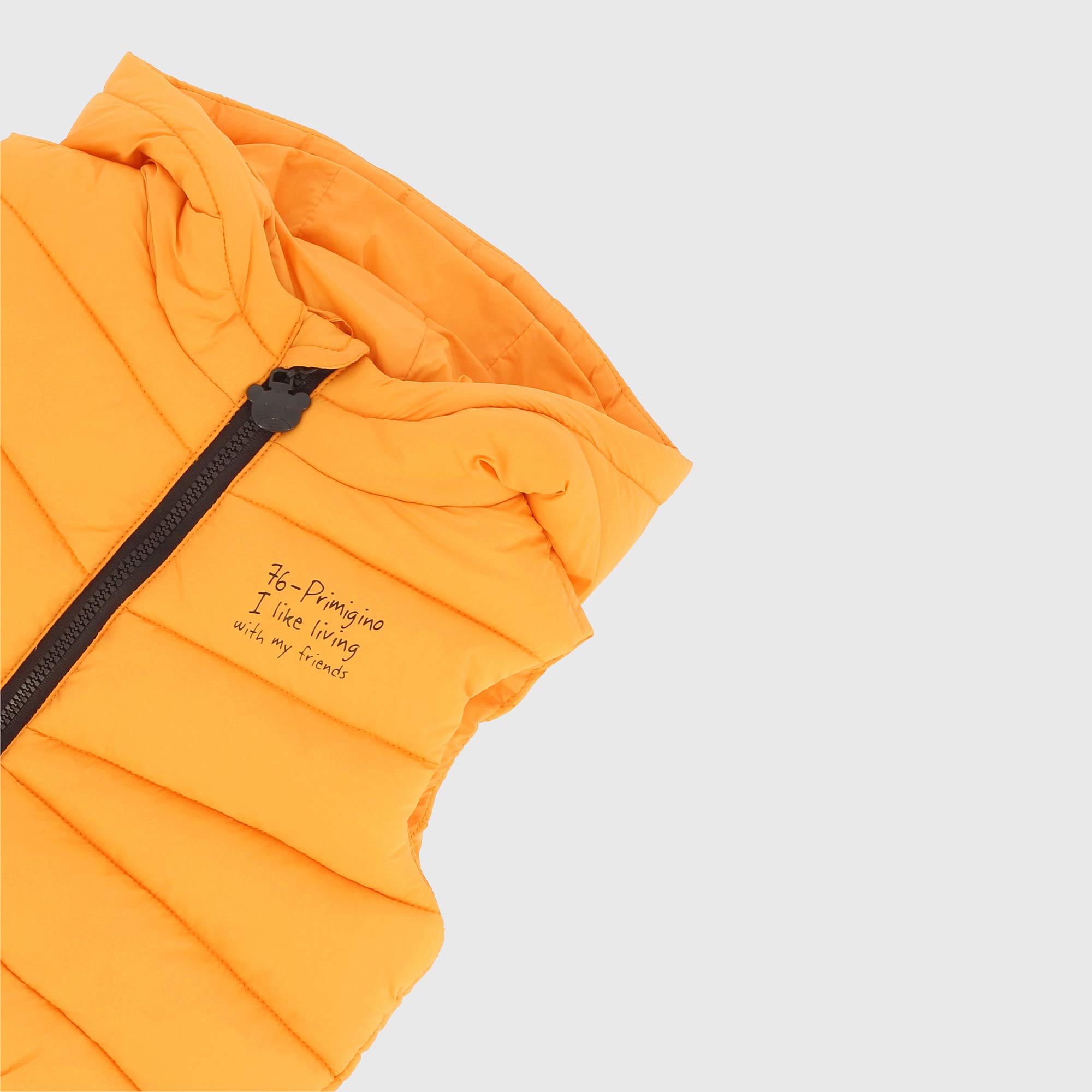 Gilet in Nylon with cap. Contrasting zip. Printed wording on the front.