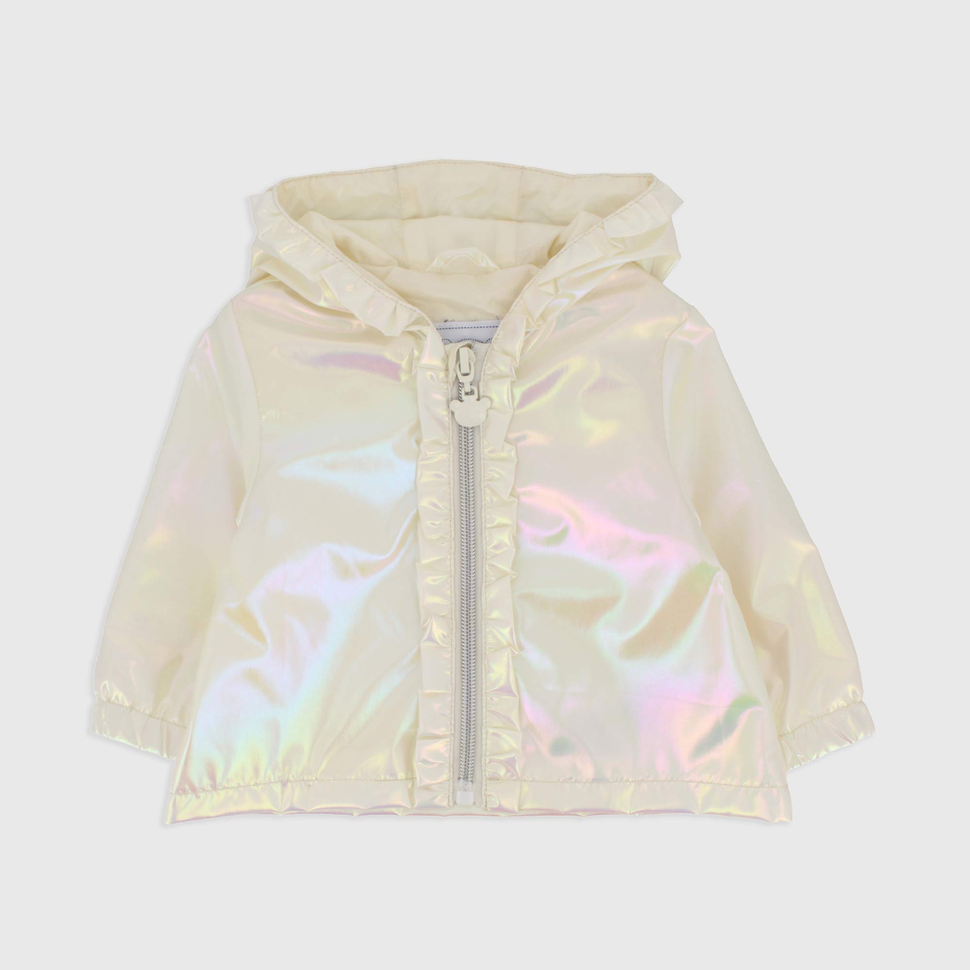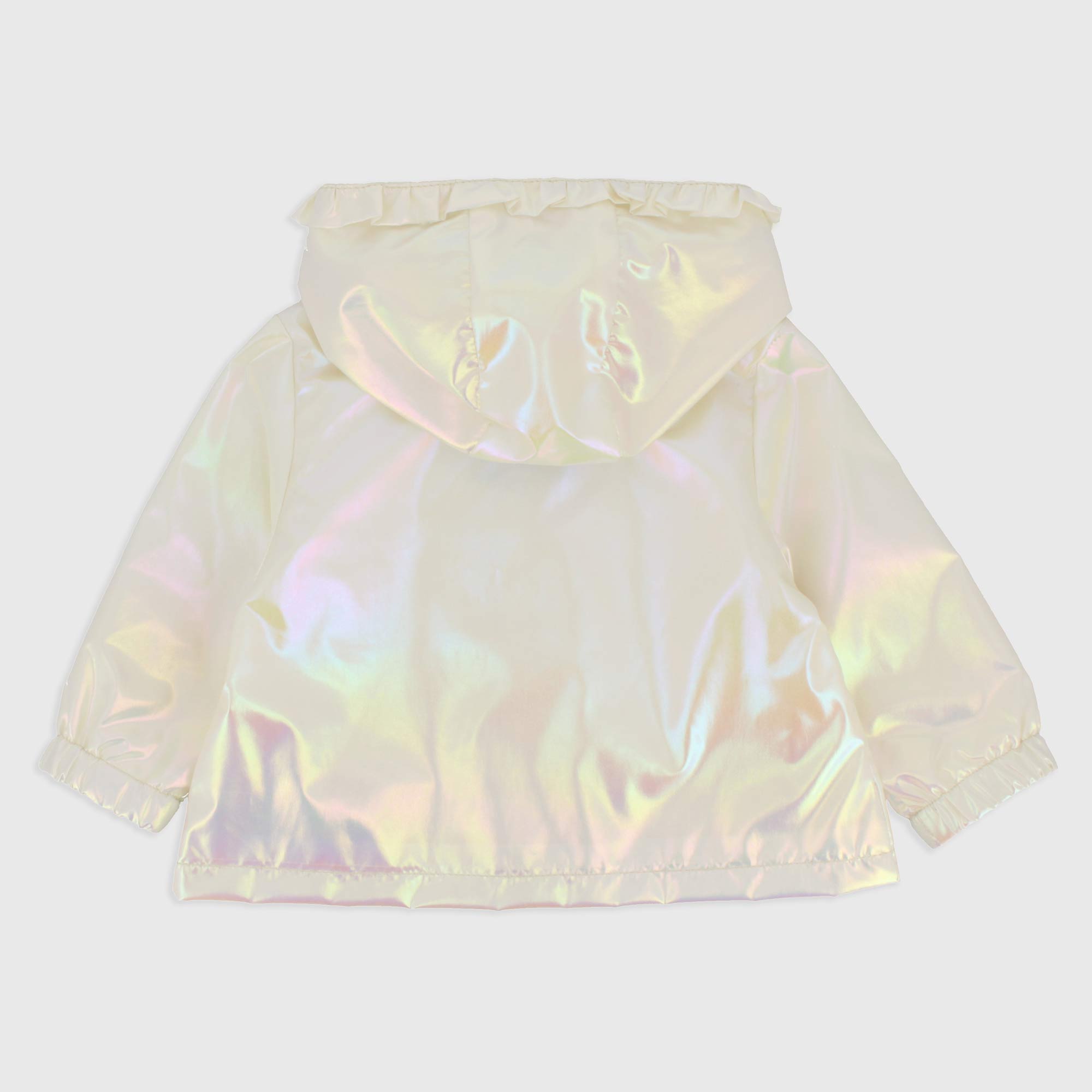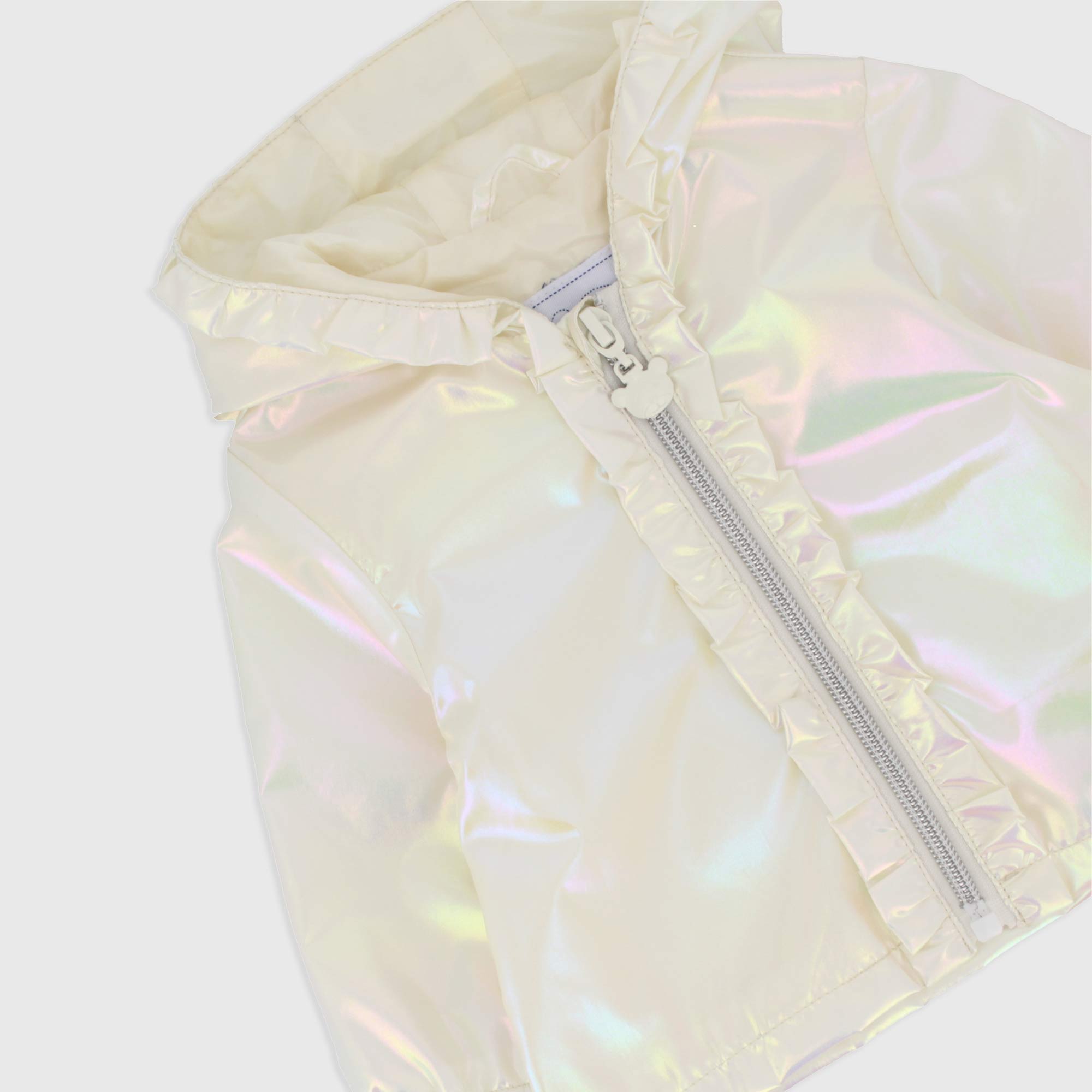 Jacket in iridescent Nylon, with cap with volant applied, long sleeves. Closure on the front with zip.