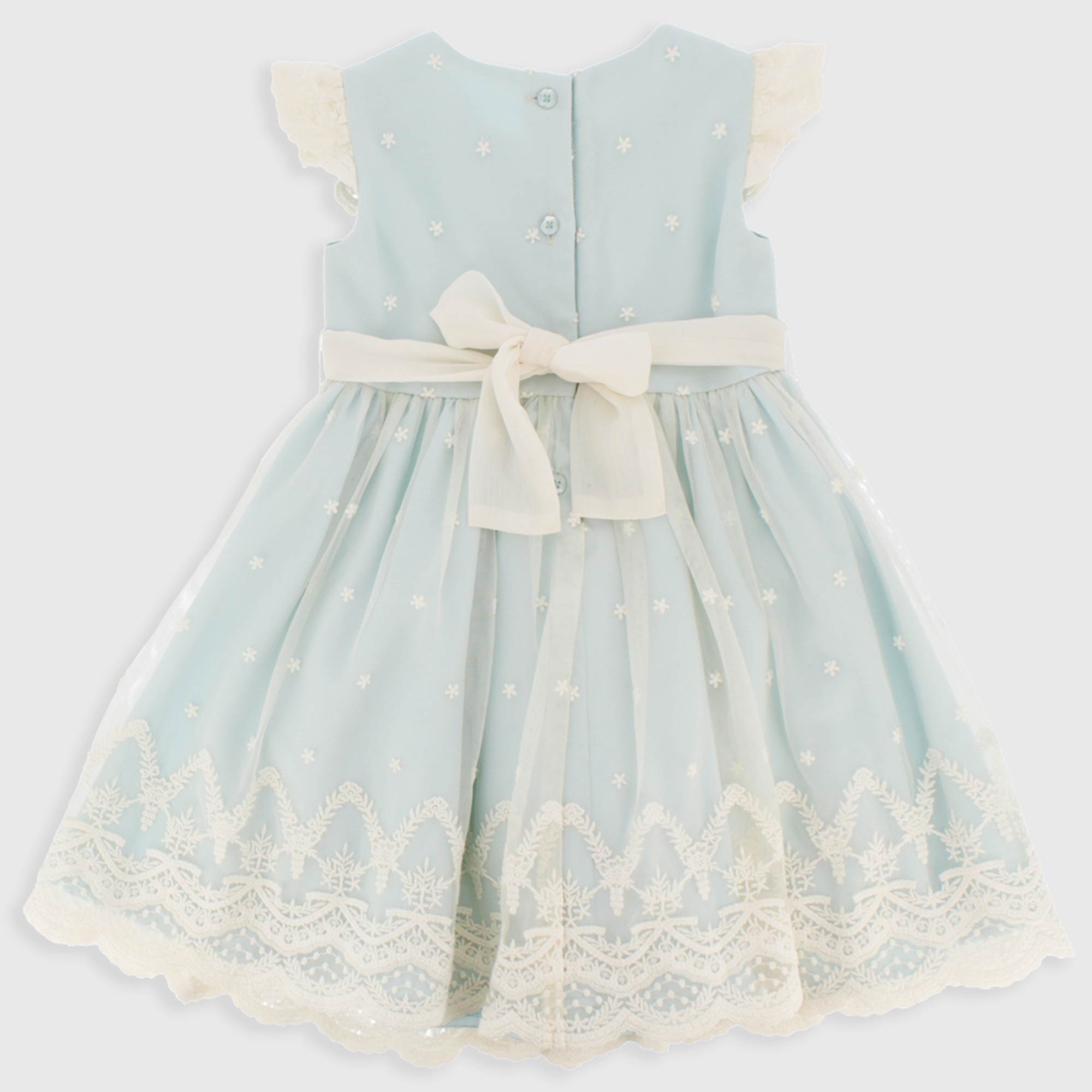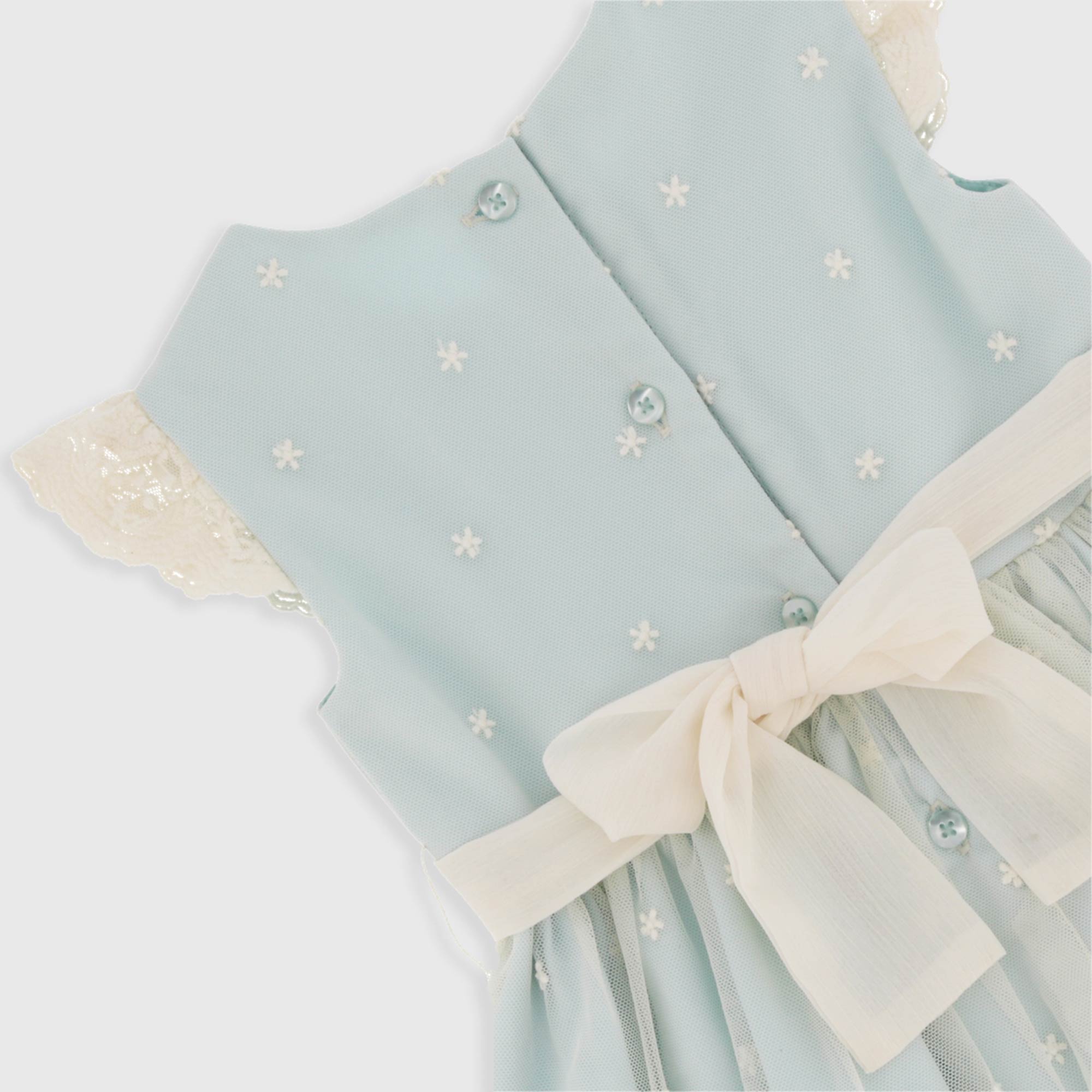 Dress in satin doubled with embroidered tulle round-neck, armhole with ruffles in laces. Back-closure with buttons. Cut at the waist with plies on the front and on the back. Lining in coton muslin. Detachable belt in crêpe.