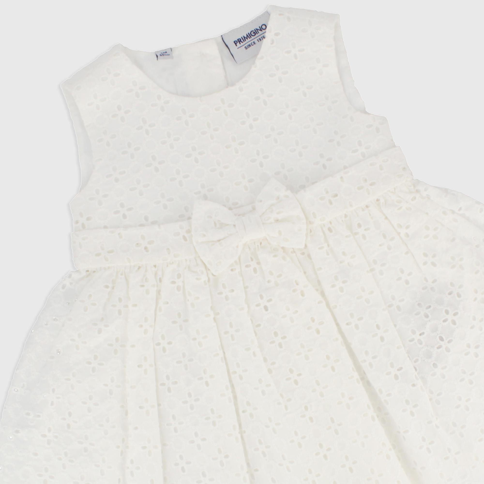 San gallo lace dress, round-neck, armhole. Buttons on the back. Cut on the waist with applied bow. Scalloped hem and inner lining in coton.